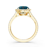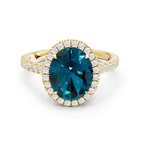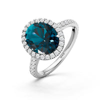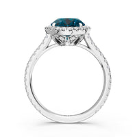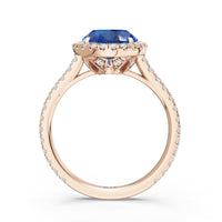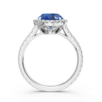 Every detail of this ring flows with feminine grace. The oval blue sapphire, cradled within an ornate basket, is surrounded by a brilliant halo. More diamonds trace the band, weaving light along its curves and creating a subtle choreography of structure and radiance.