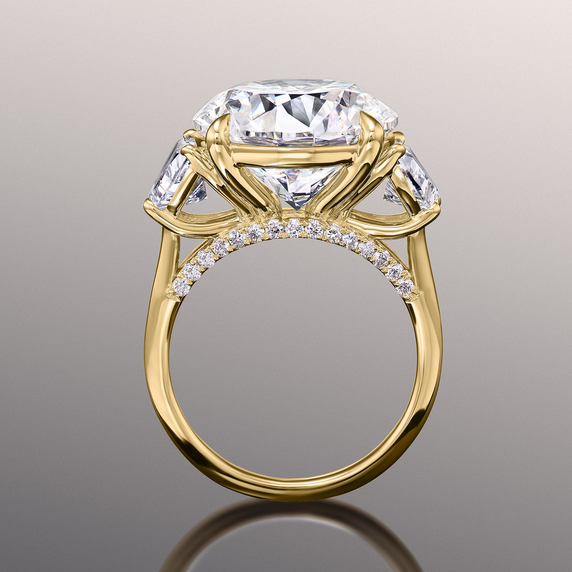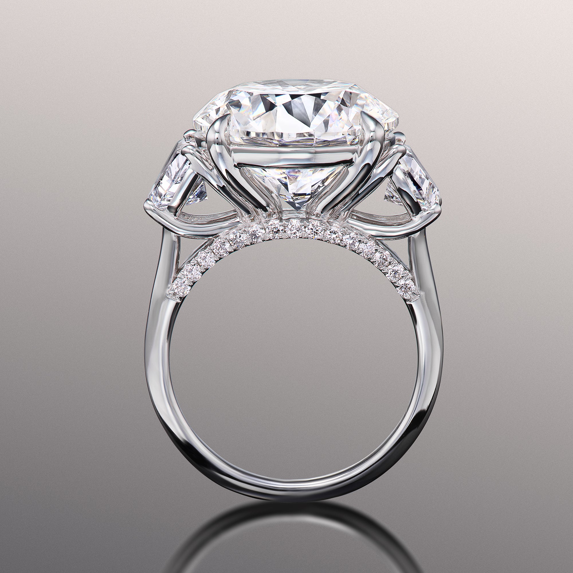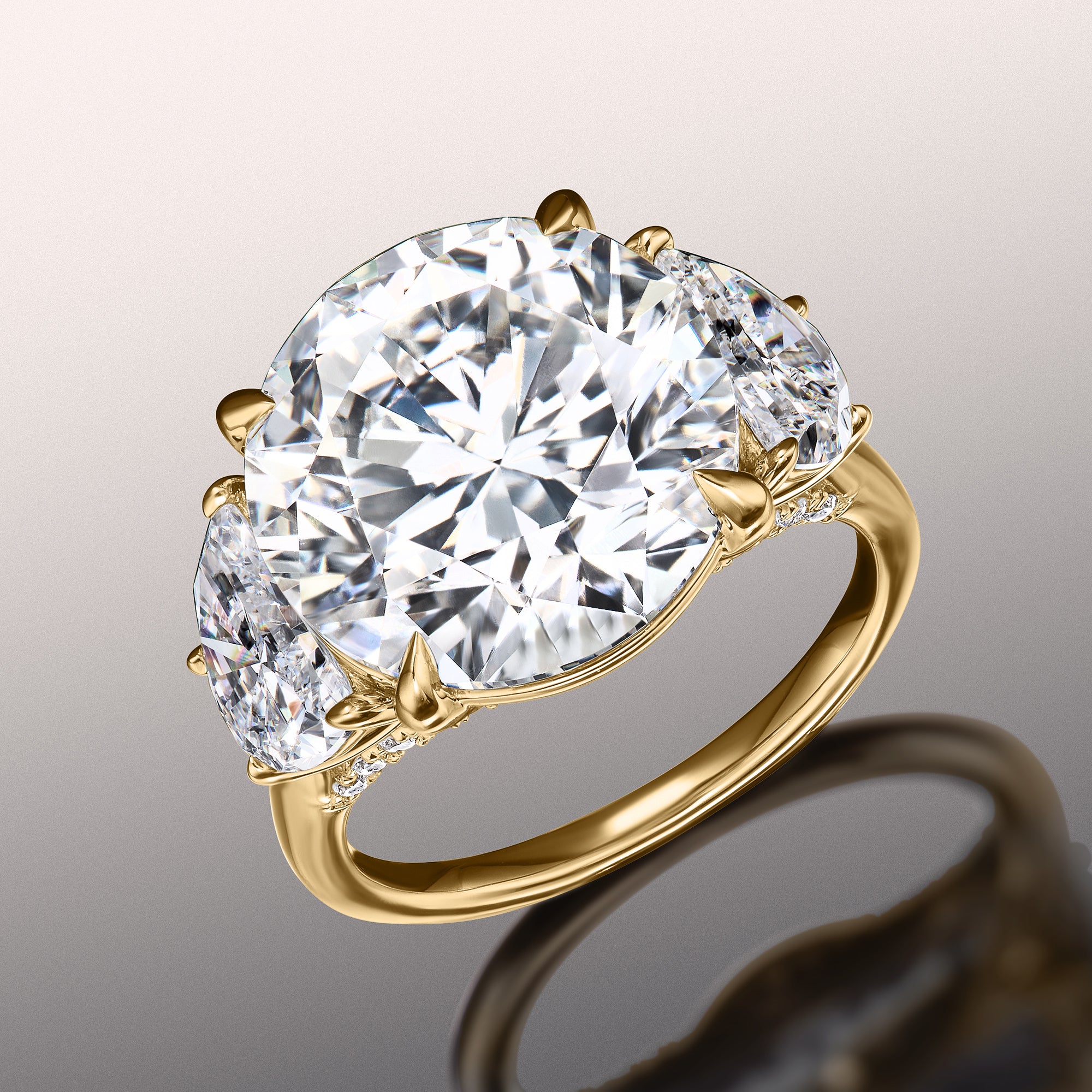 Deviate from the conventional choices with the Rosenstein ring. This unique three-stone diamond engagement ring features a 10.0 ct round diamond center stone flanked by two 1.0 ct half-moon diamonds. The stunning brilliance of the half-moon diamonds syncs perfectly with the exceptional fire of the round diamond center stone. Together, they display a bold interweaving of light that makes an impressive statement of a love that will never dim.