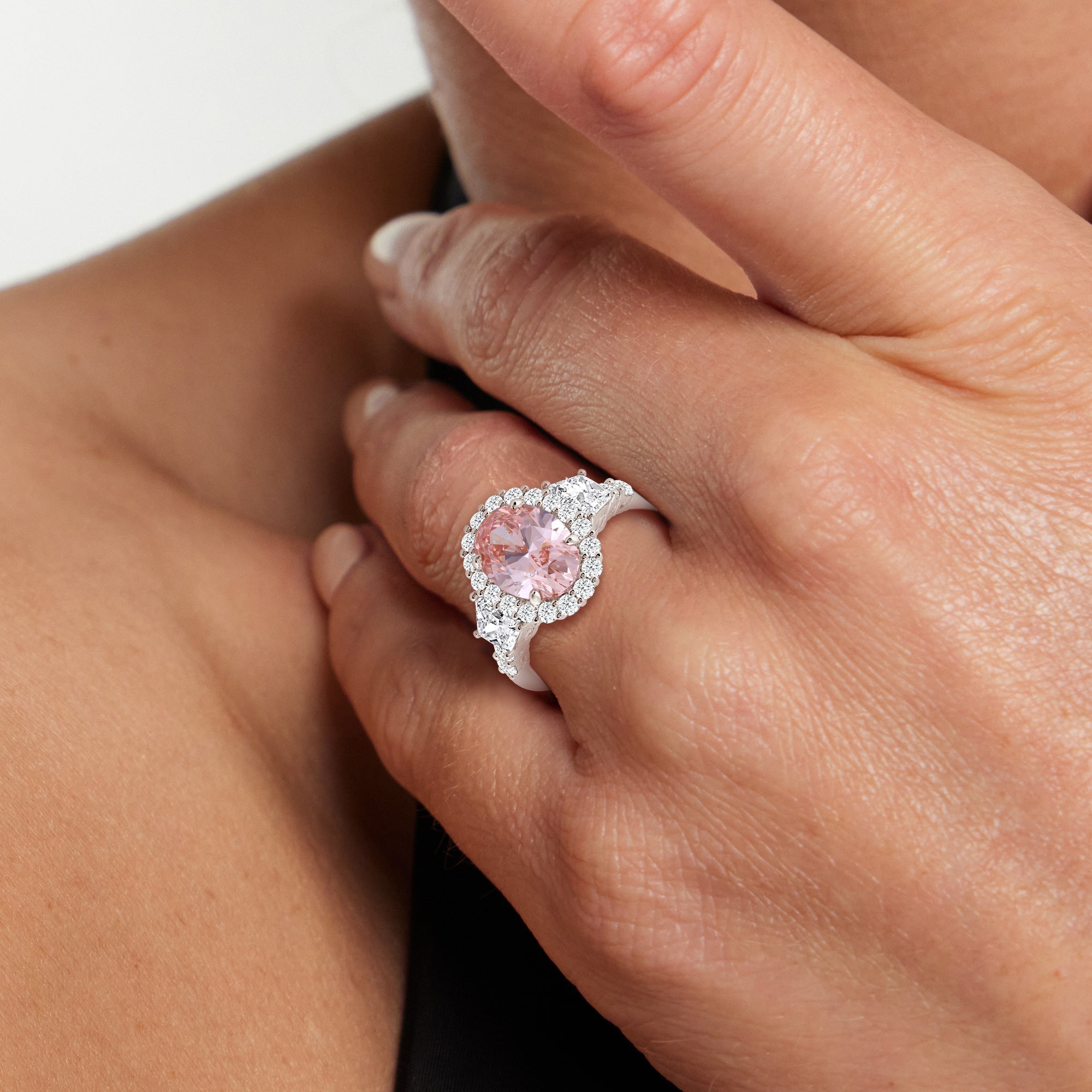 This pink diamond engagement ring encompasses a bright oval-cut diamond encircled by a halo of smaller diamonds with tapering side stones in various shapes. The interplay of shapes and colors intertwine to make this striking ring a symbolic choice.
