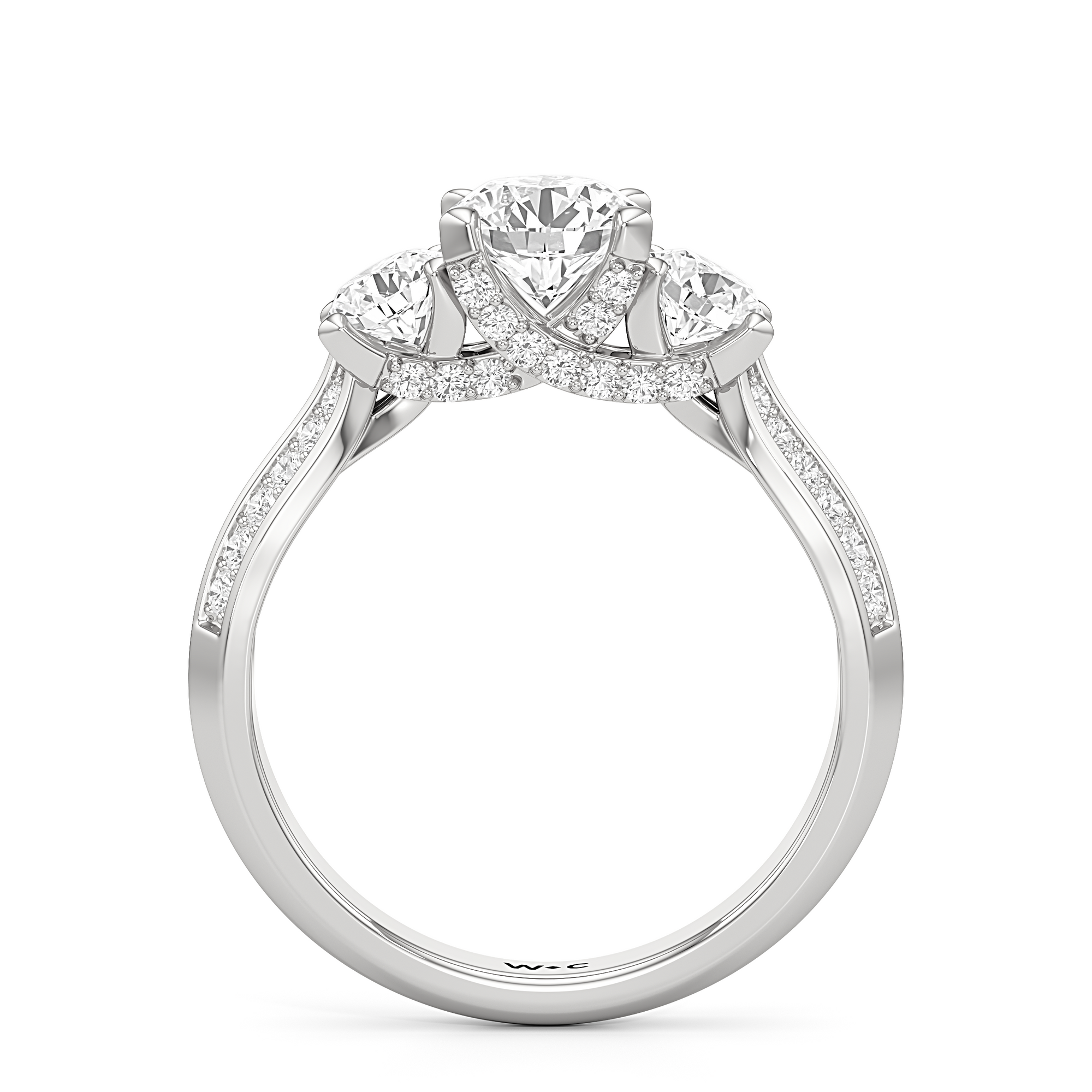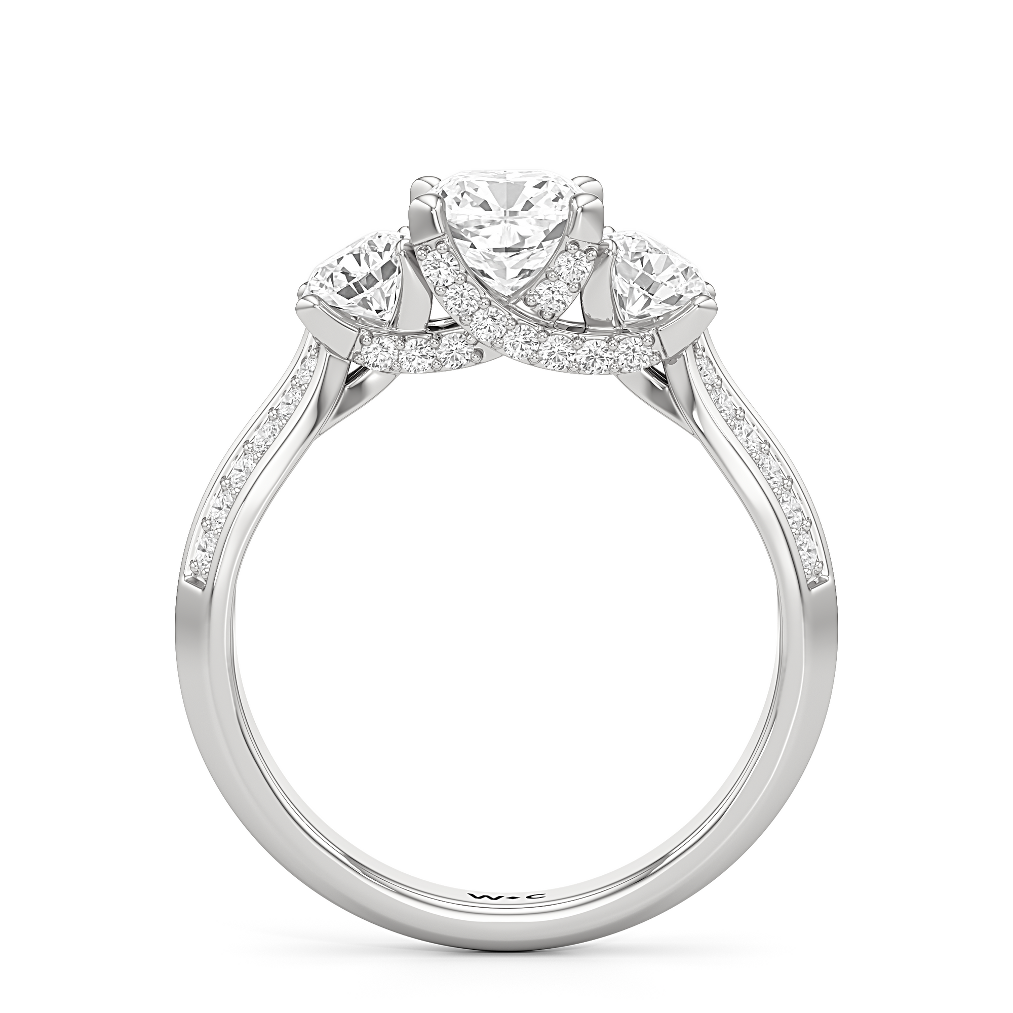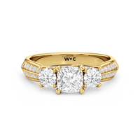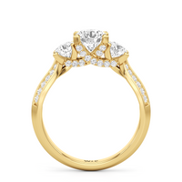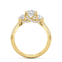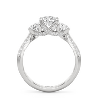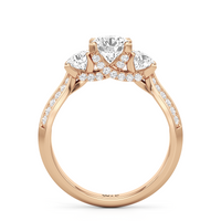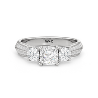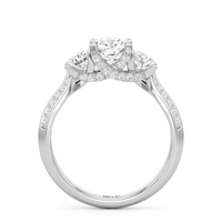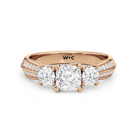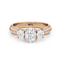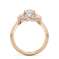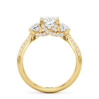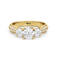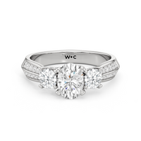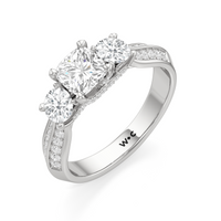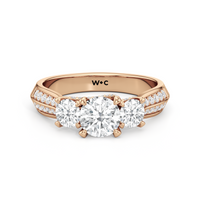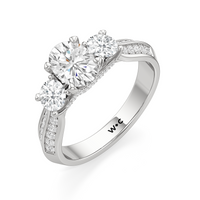 The Scarlett Engagement Ring radiates an aura of poise and refinement. It features a diamond-studded knife-edge band that subtly narrows in width as it approaches the trilogy centrepiece. The trio of stones comprises a diamond centre stone between two round diamond side stones. These three precious gems are mounted on a diamond-encrusted trellis prong setting.