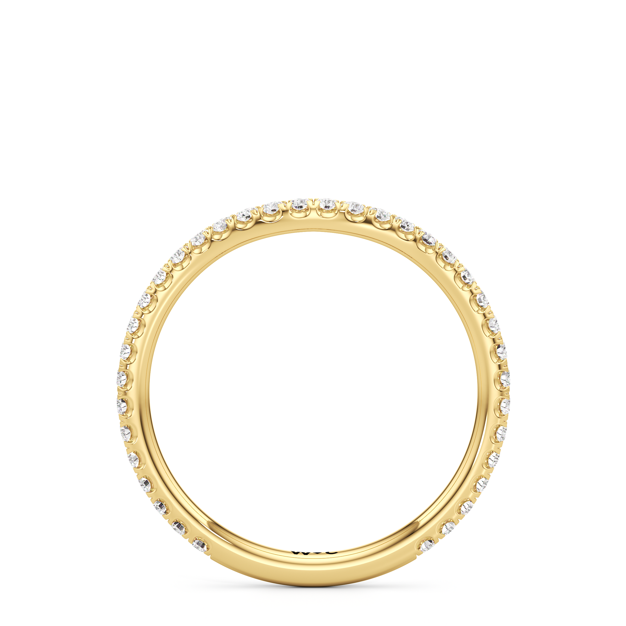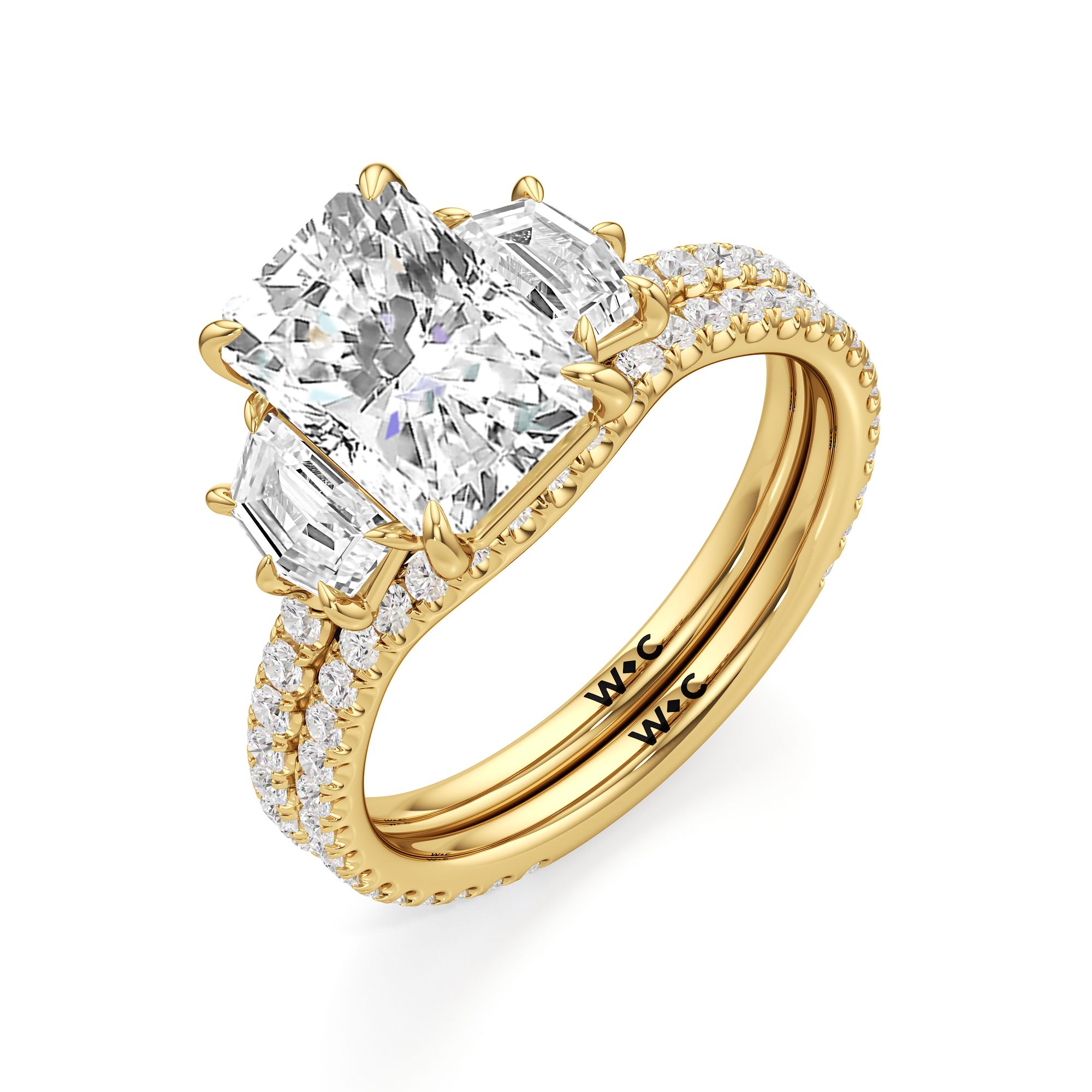 This curved diamond set wedding band is perfectly contoured to complement our the scarlett three stone engagement ring for a simple and sophisticated look.