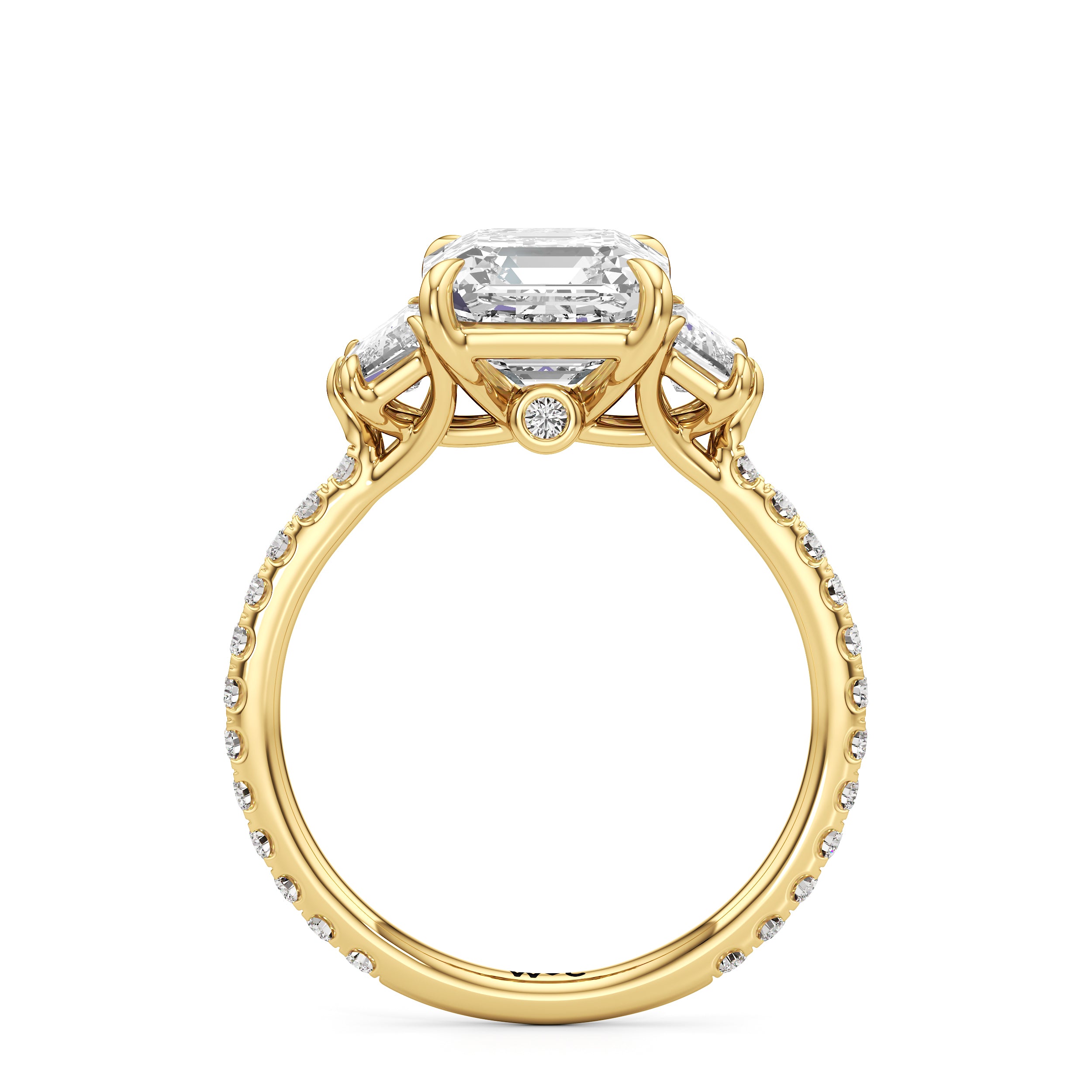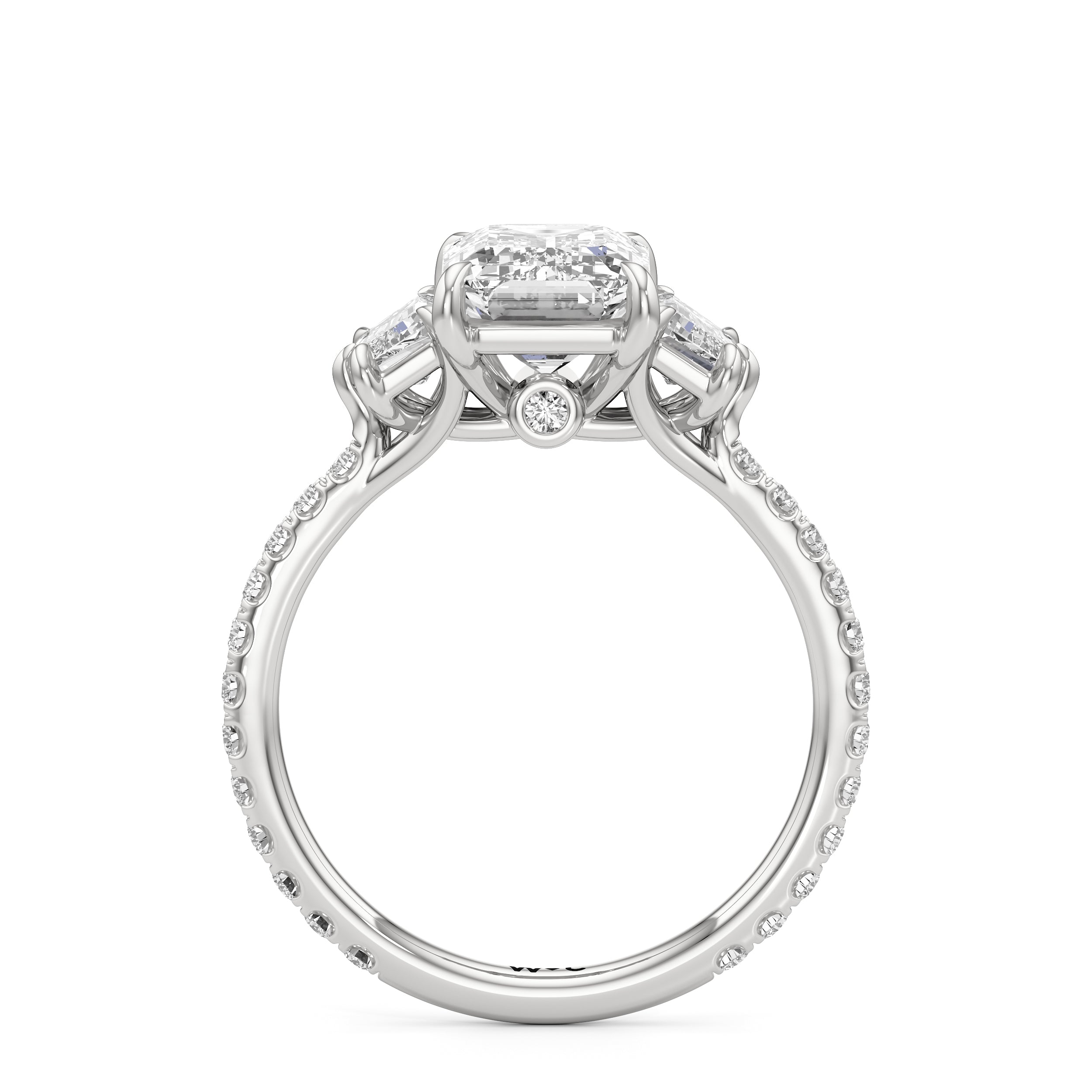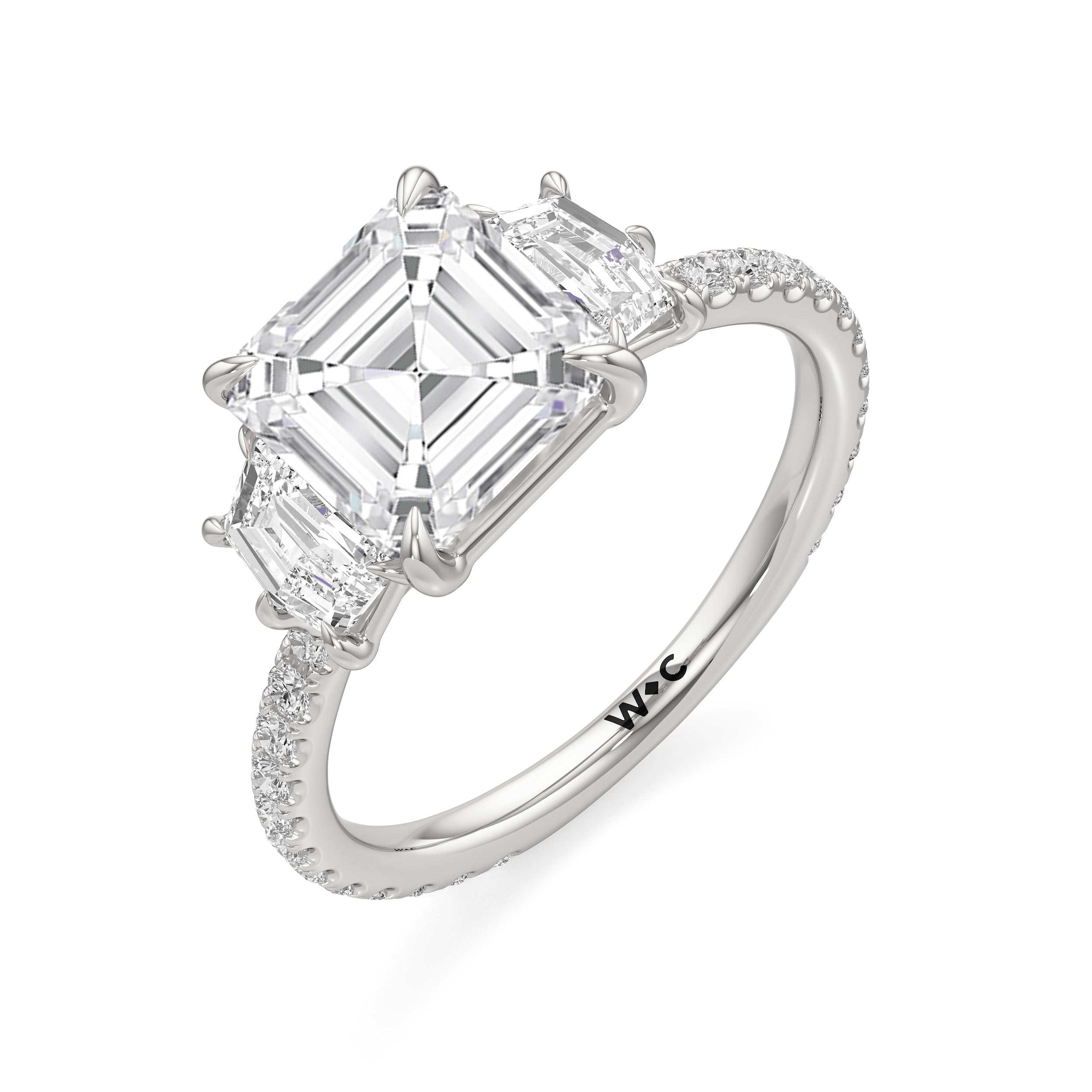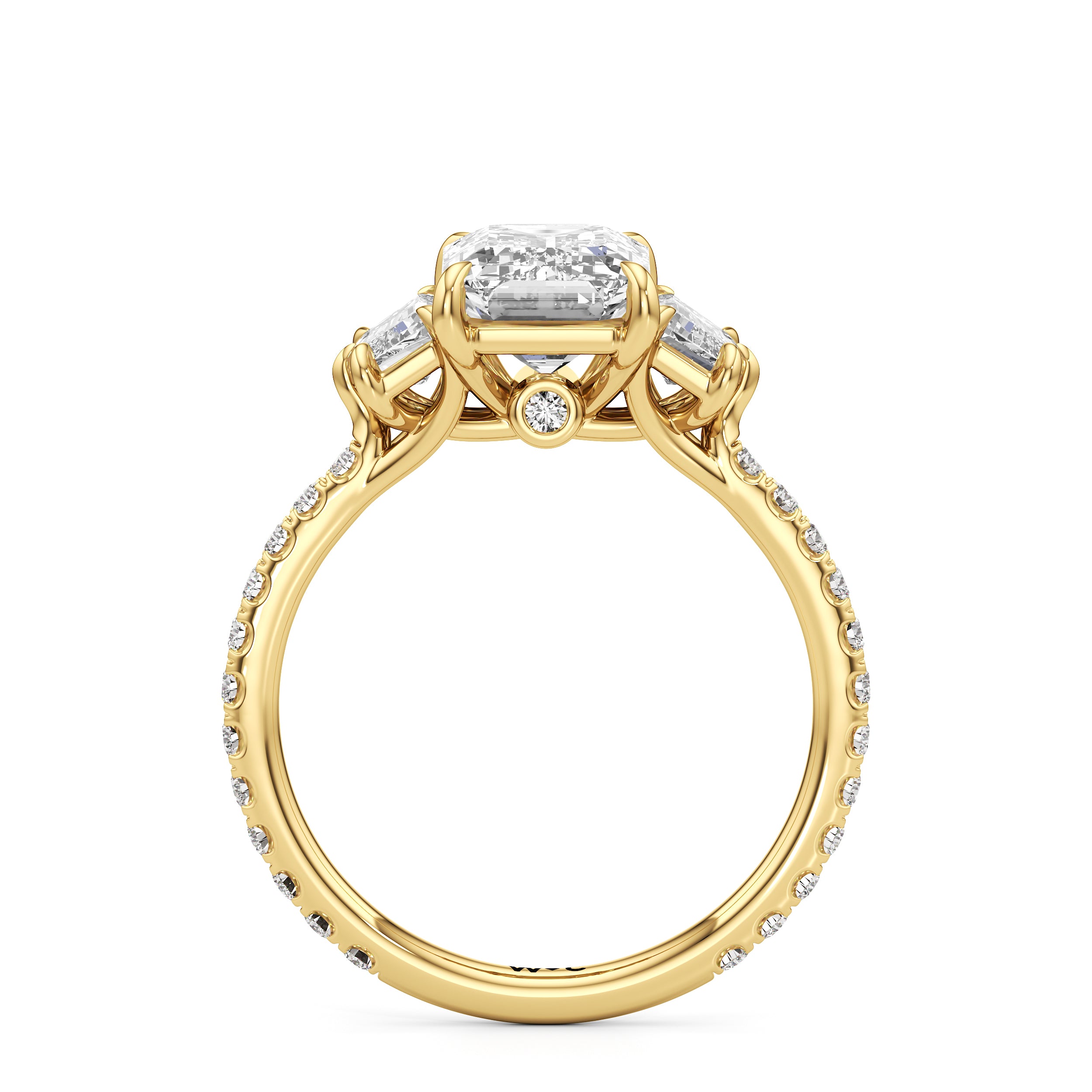 Proportion and balance were carefully considered when designing this trilogy ring. It features a shapely band with tapering round diamonds running along its sloping shoulders. The cathedral setting showcases the magnificent center stone set in between emerald-cut side stones. The prongs that hold the side stones in place extend from the shoulders of the ring, curving up to cradle the precious gems. For added detail, a bezel-set round diamond punctuates the ring's bridge.