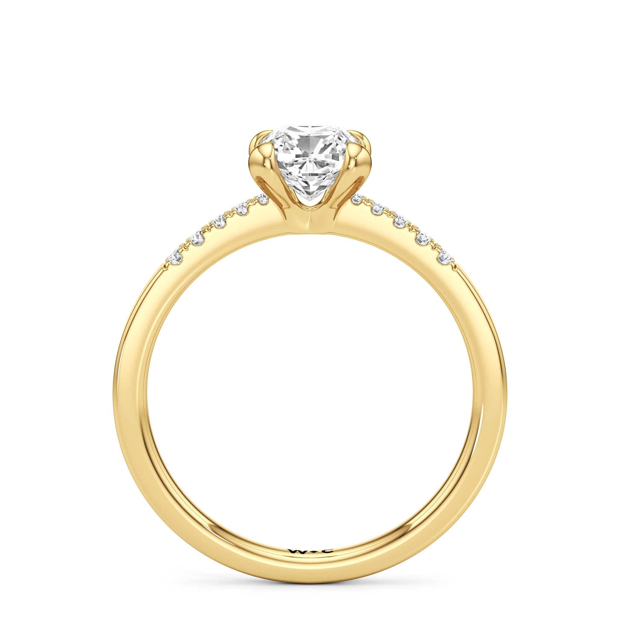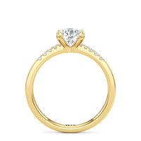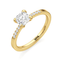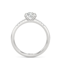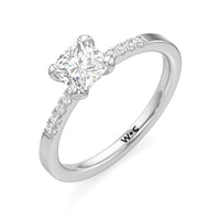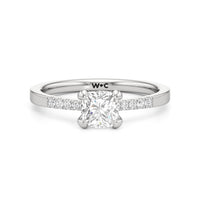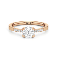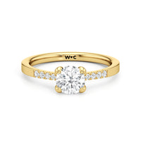 A pretty choice to symbolise commitment and is understated enough for everyday wear. This engagement ring features a polished band that tastefully narrows as it approaches the focal stone. Gripping the diamond centre stone are four claws. Pavé-set round diamonds form a short row along the tapered part of the band, providing a brilliant backdrop that augments the centre stone's brilliance.