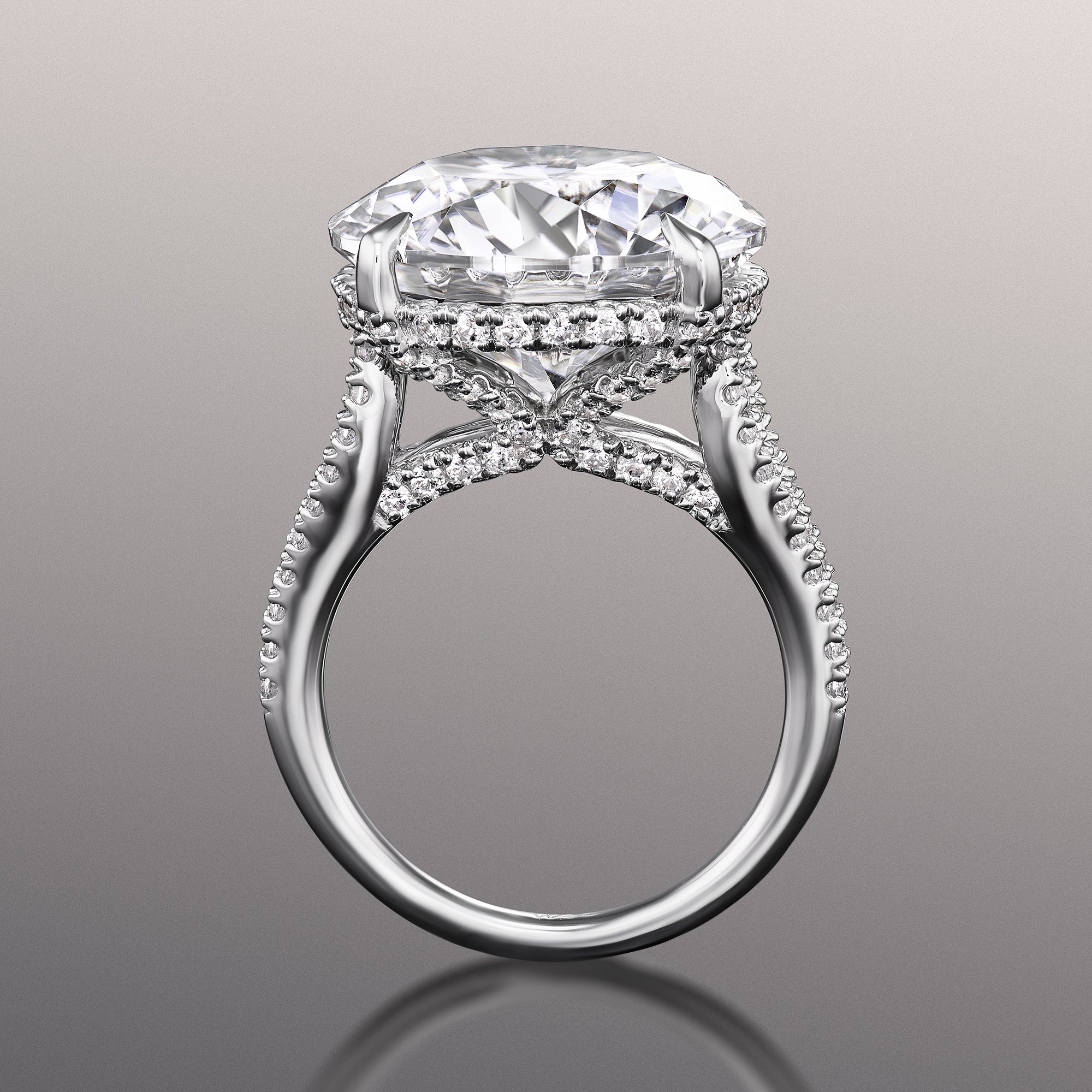 Capture the heart of a true romantic with the Signac ring. This diamond engagement ring presents a heartstring-tugging beauty with its 15.0 ct round diamond center stone. The sizeable carat weight of the incredibly brilliant centerpiece is complemented by the eye-catching glitter of petite round diamonds that trace the split shoulders of the shapely cathedral shank. A hidden halo and a diamond-encrusted trellis bring added elegance to the ring, infusing it at once with a sense of opulence and refinement.