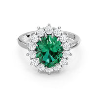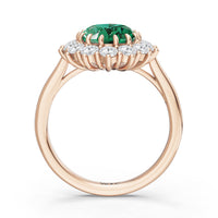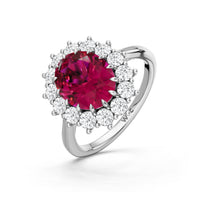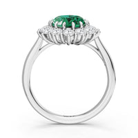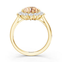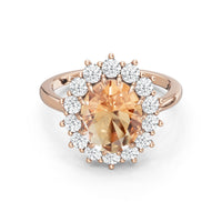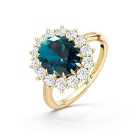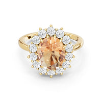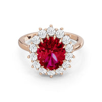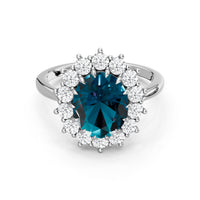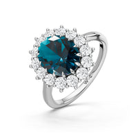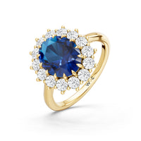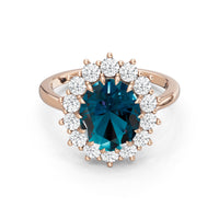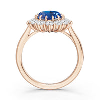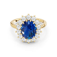A blue sapphire in oval shape rises in a multi-prong setting, framed by a halo of delicate diamonds. The cathedral shank lifts the colored gem with grace, letting light trace every curve. Inspired by a royal legacy, this engagement ring carries a princess' noble charm.