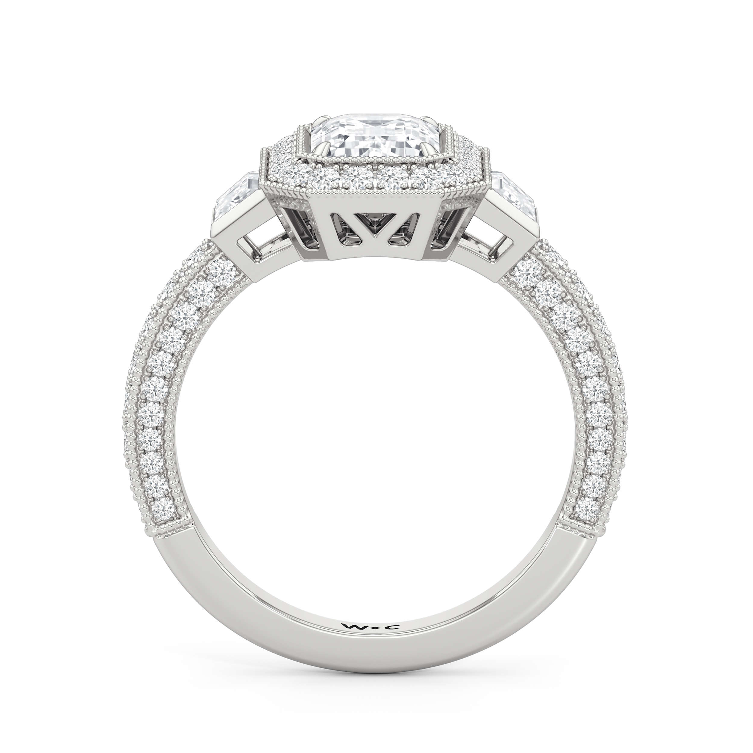 The Steinman Ring takes cues from the prominent steel arch structure that connects northern Manhattan to the Bronx. Its design is structured around the commanding lines and graceful curves of the Henry Hudson Bridge, echoing its powerful silhouette. An emerald-cut stone sits at the center of the band, framed by an octagonal halo of round diamonds and flanked by a duo of trapezoid-cut diamonds. The brilliant shine is carried through from the centerpiece to the band, with more round diamonds on baby prongs lining the three sides of the shank. Rows of tiny beads—done through a hand milgraining process—trace every edge, giving the ring the perfect blend of strength and sophistication.