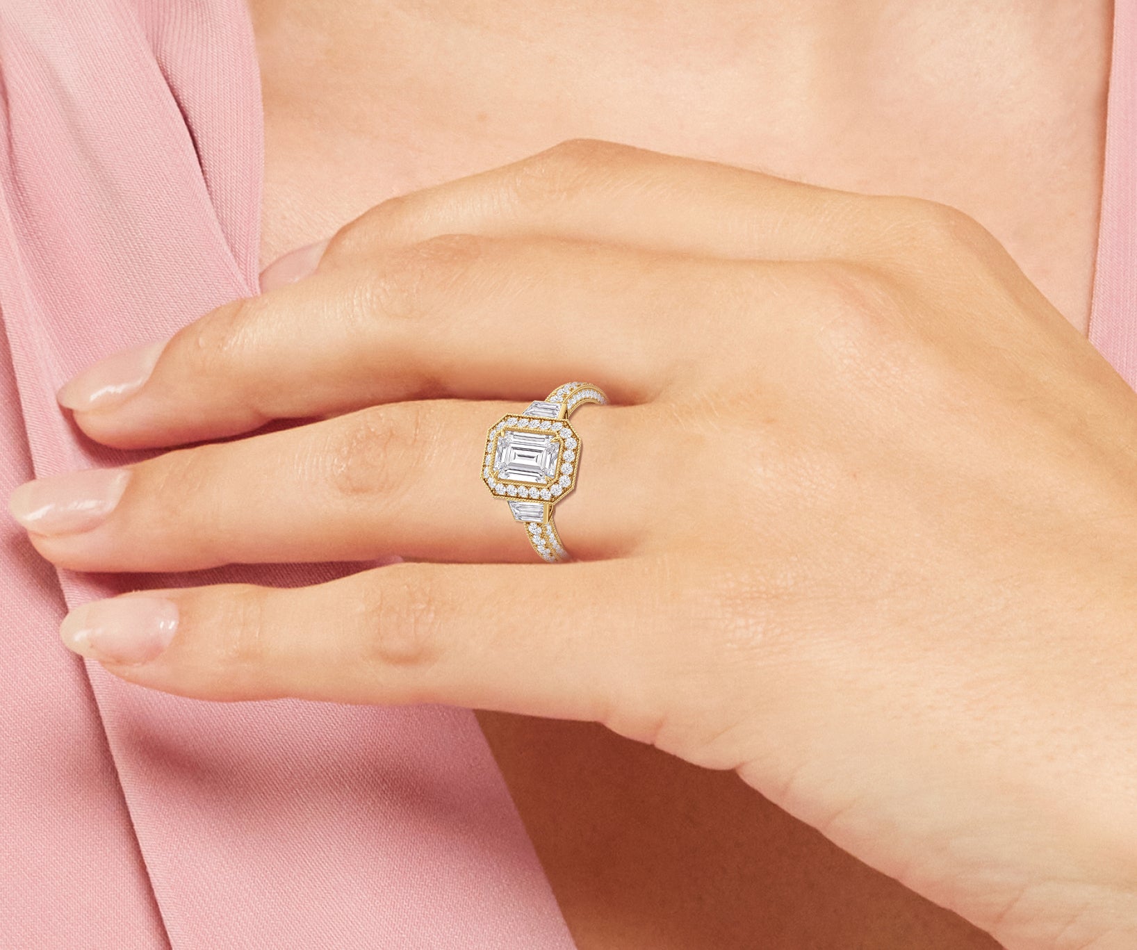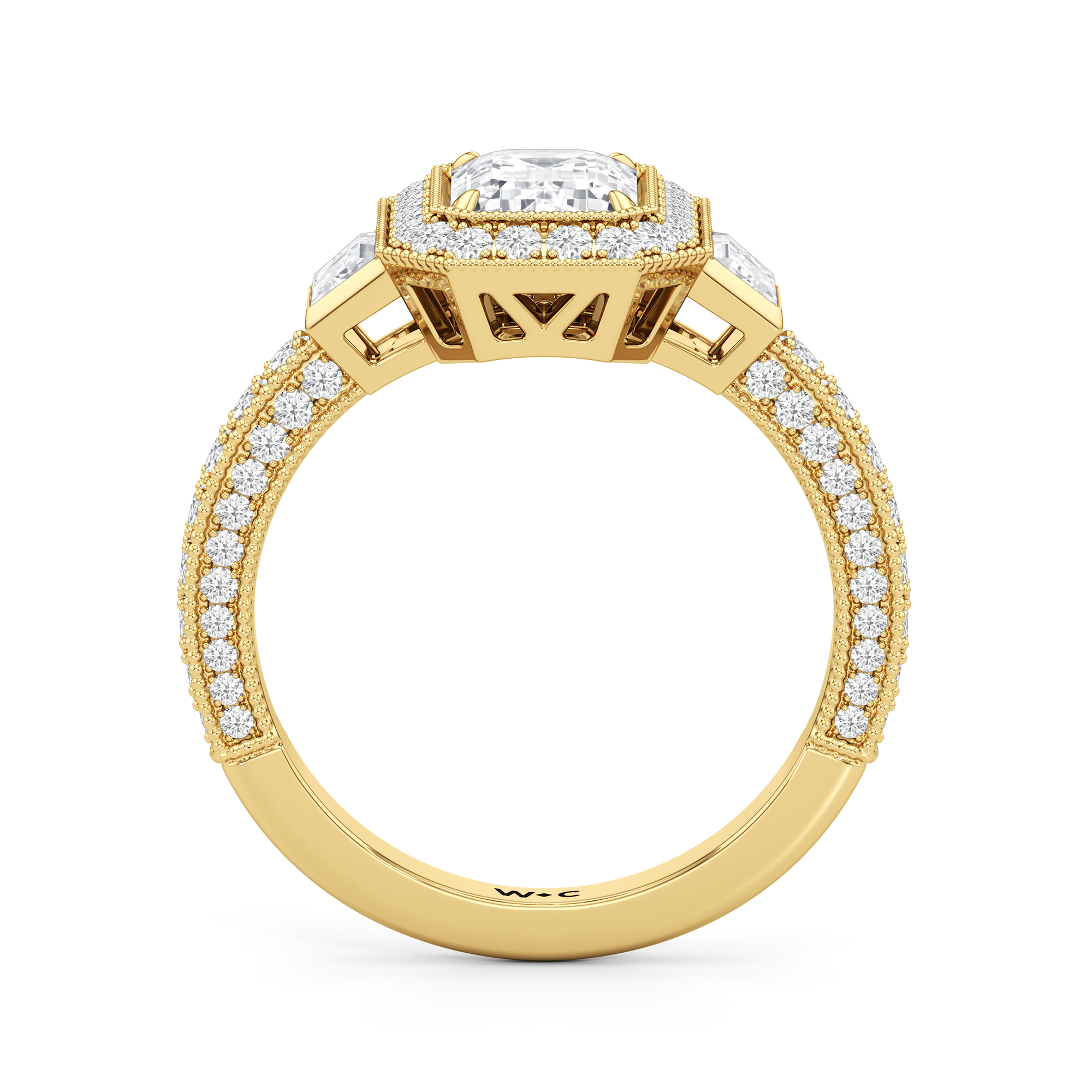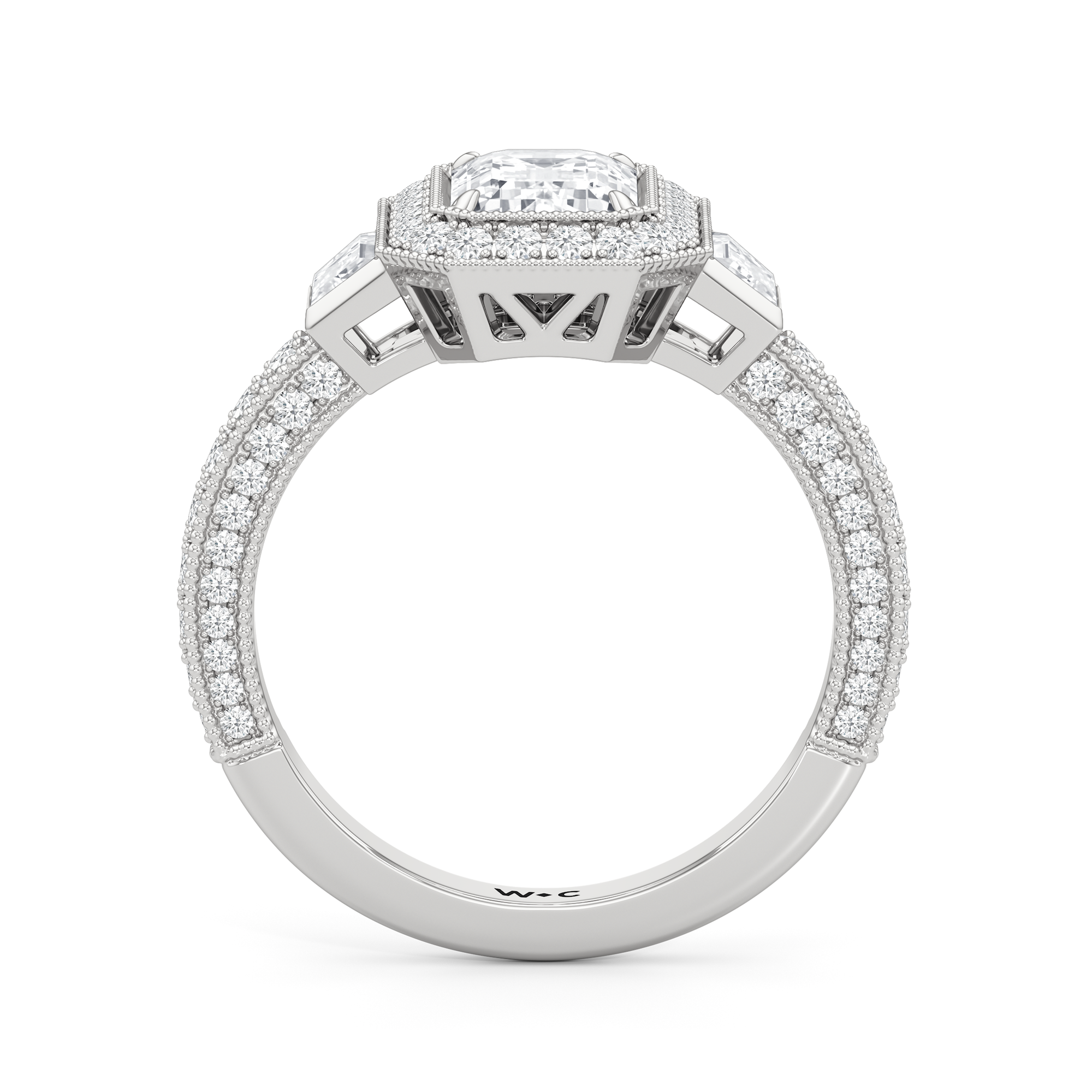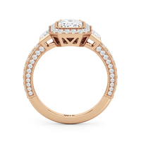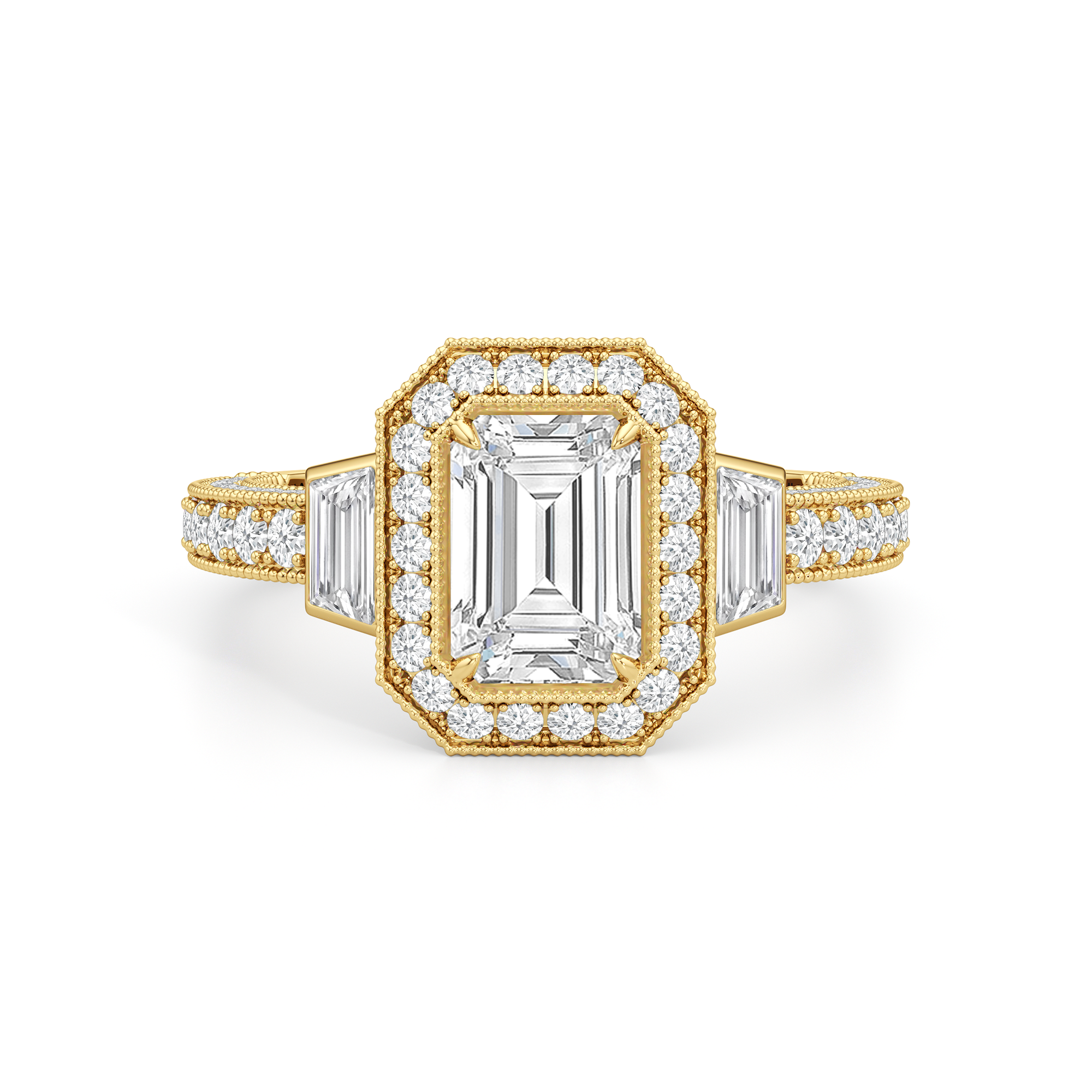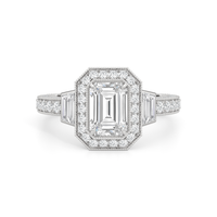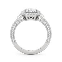 The Steinman Ring takes cues from the prominent steel arch structure that connects northern Manhattan to the Bronx. Its design is structured around the commanding lines and graceful curves of the Henry Hudson Bridge, echoing its powerful silhouette. An emerald-cut stone sits at the center of the band, framed by an octagonal halo of round diamonds and flanked by a duo of trapezoid-cut diamonds. The brilliant shine is carried through from the centerpiece to the band, with more round diamonds on baby prongs lining the three sides of the shank. Rows of tiny beads—done through a hand milgraining process—trace every edge, giving the ring the perfect blend of strength and sophistication.