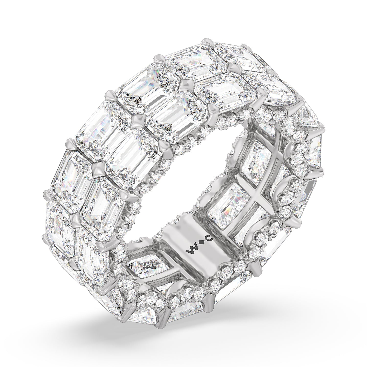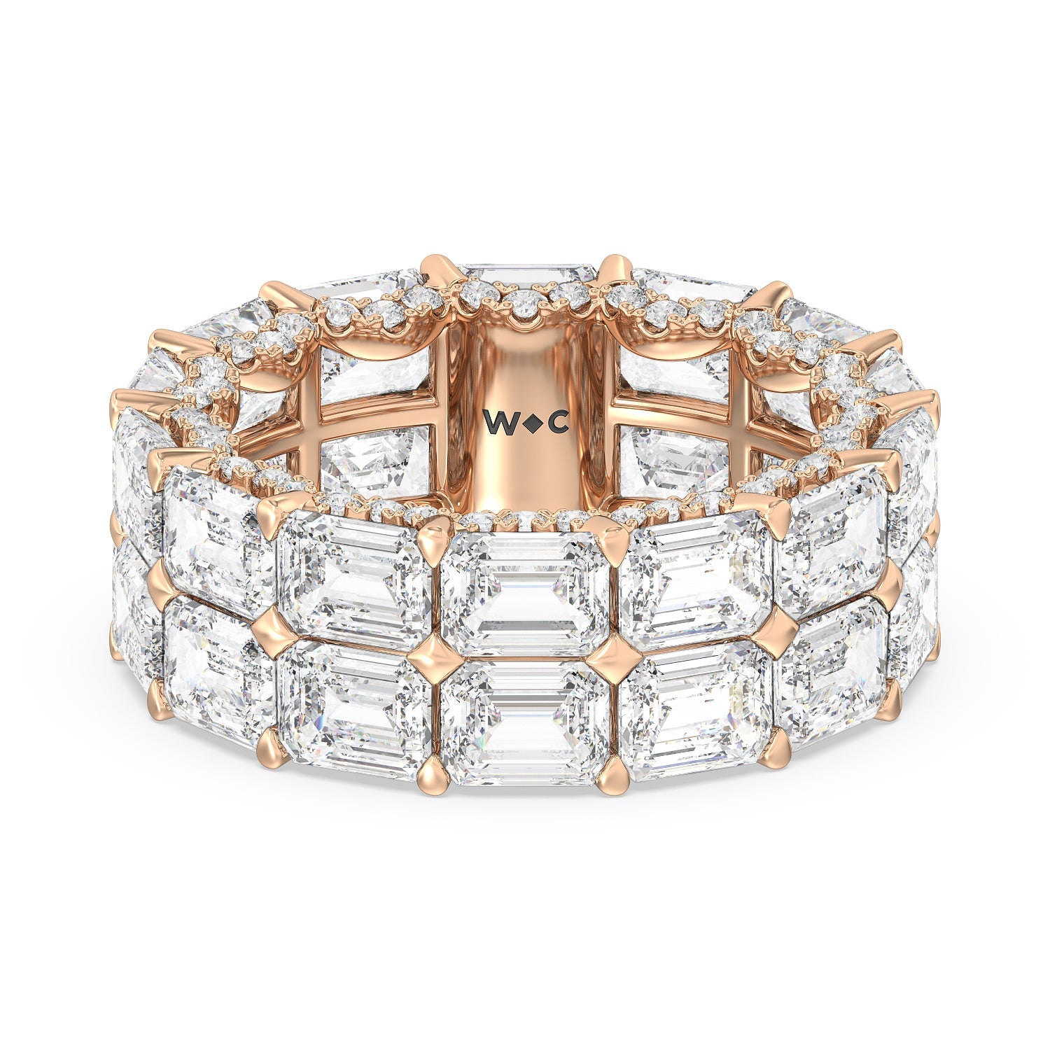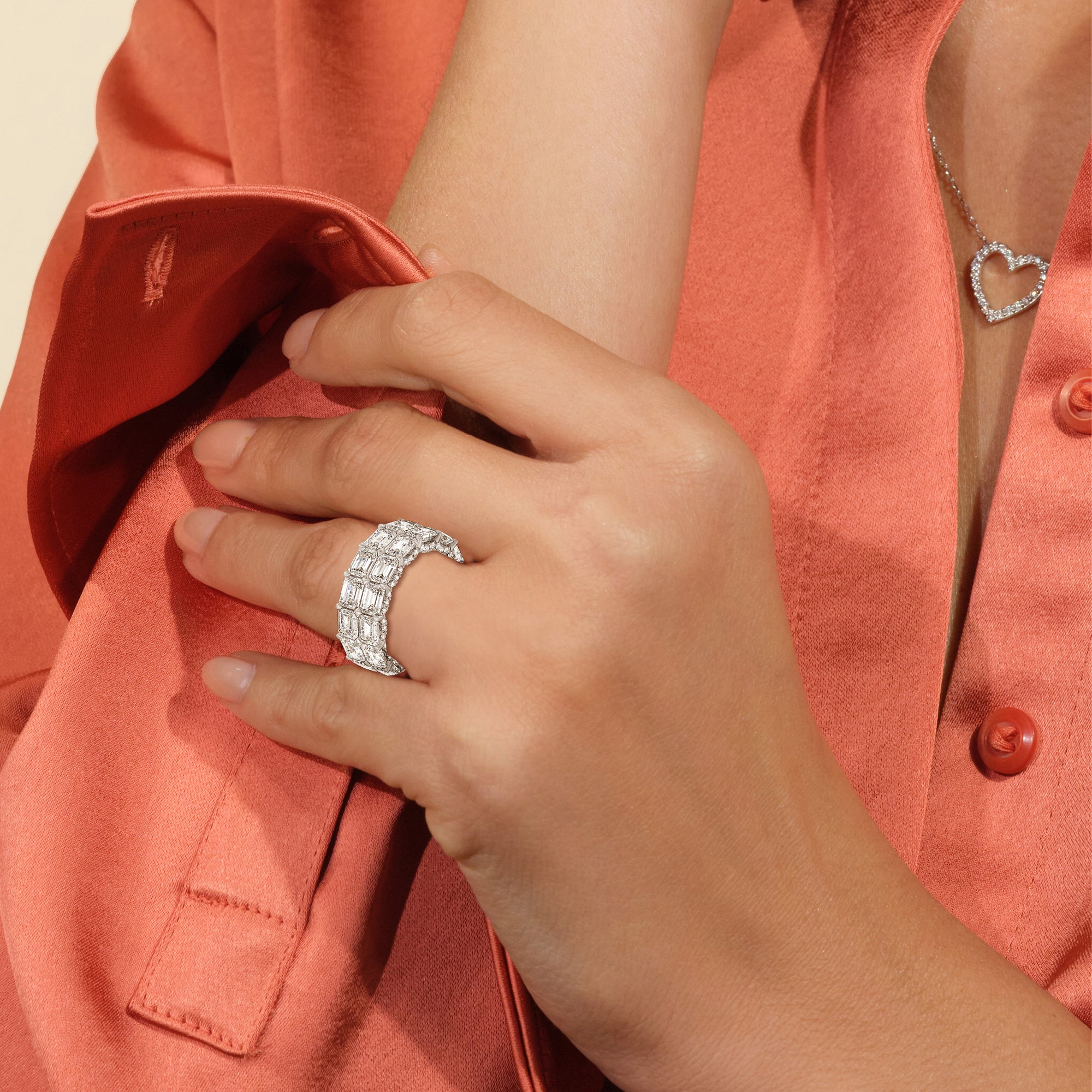 An opulent testament to grand design. This regal piece is fully embraced by two circular rows of emerald-cut diamonds. The never-ending shine truly doesn't stop for the band's edges are decorated with round diamonds meticulously mounted on a scalloped setting. A total of 112 diamonds make up the unmistakable charm of this ring.
