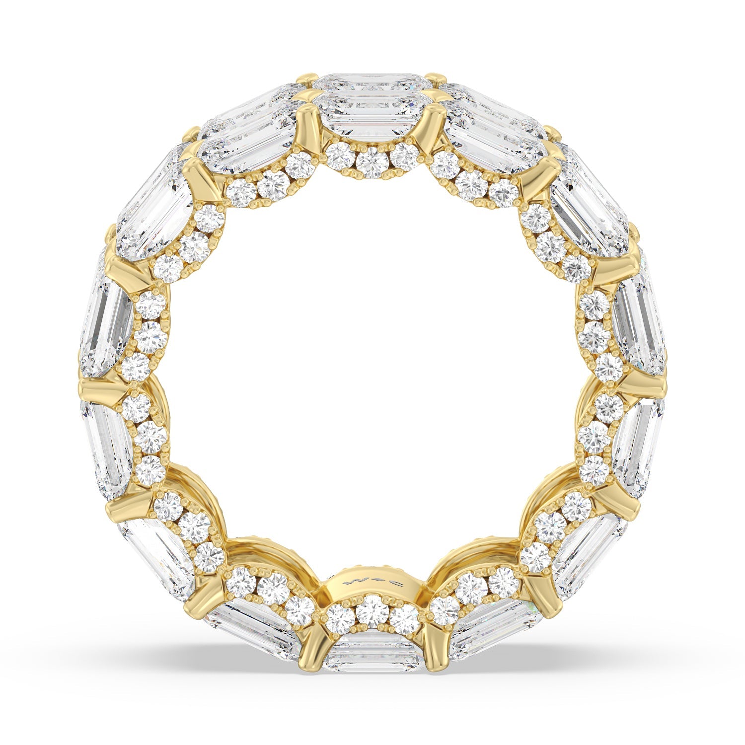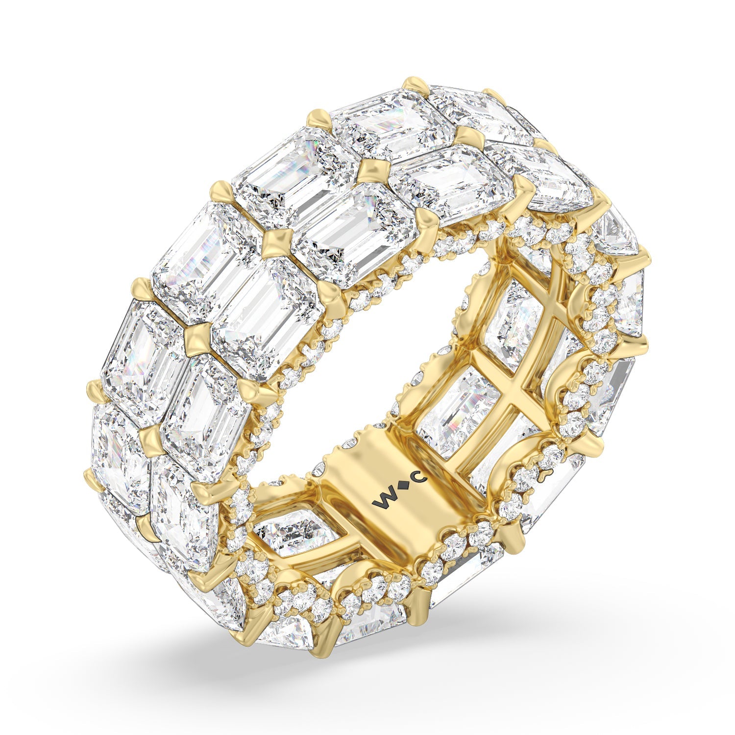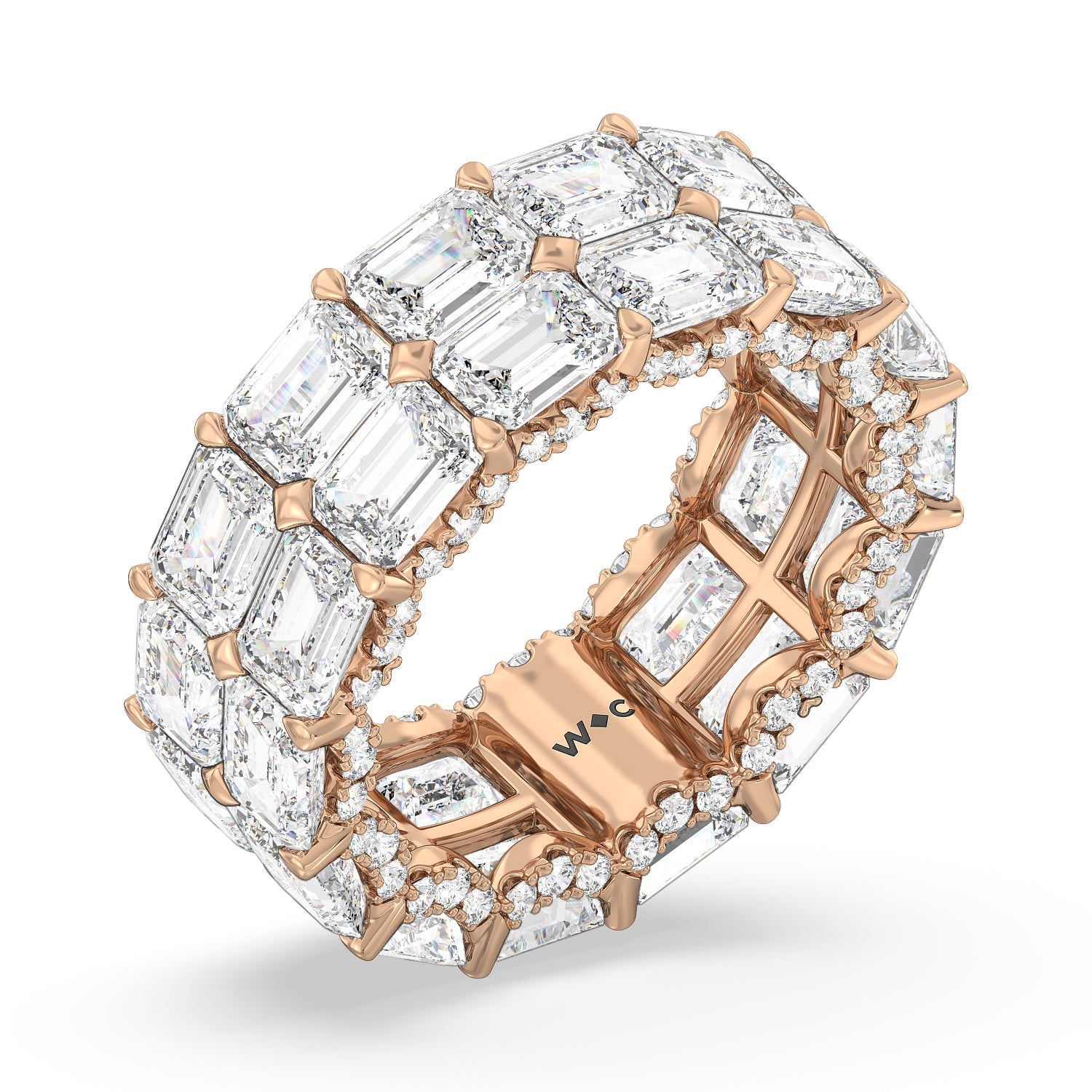 An opulent testament to grand design. This regal piece is fully embraced by two circular rows of emerald-cut diamonds. The never-ending shine truly doesn't stop for the band's edges are decorated with round diamonds meticulously mounted on a scalloped setting. A total of 112 diamonds make up the unmistakable charm of this ring.