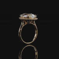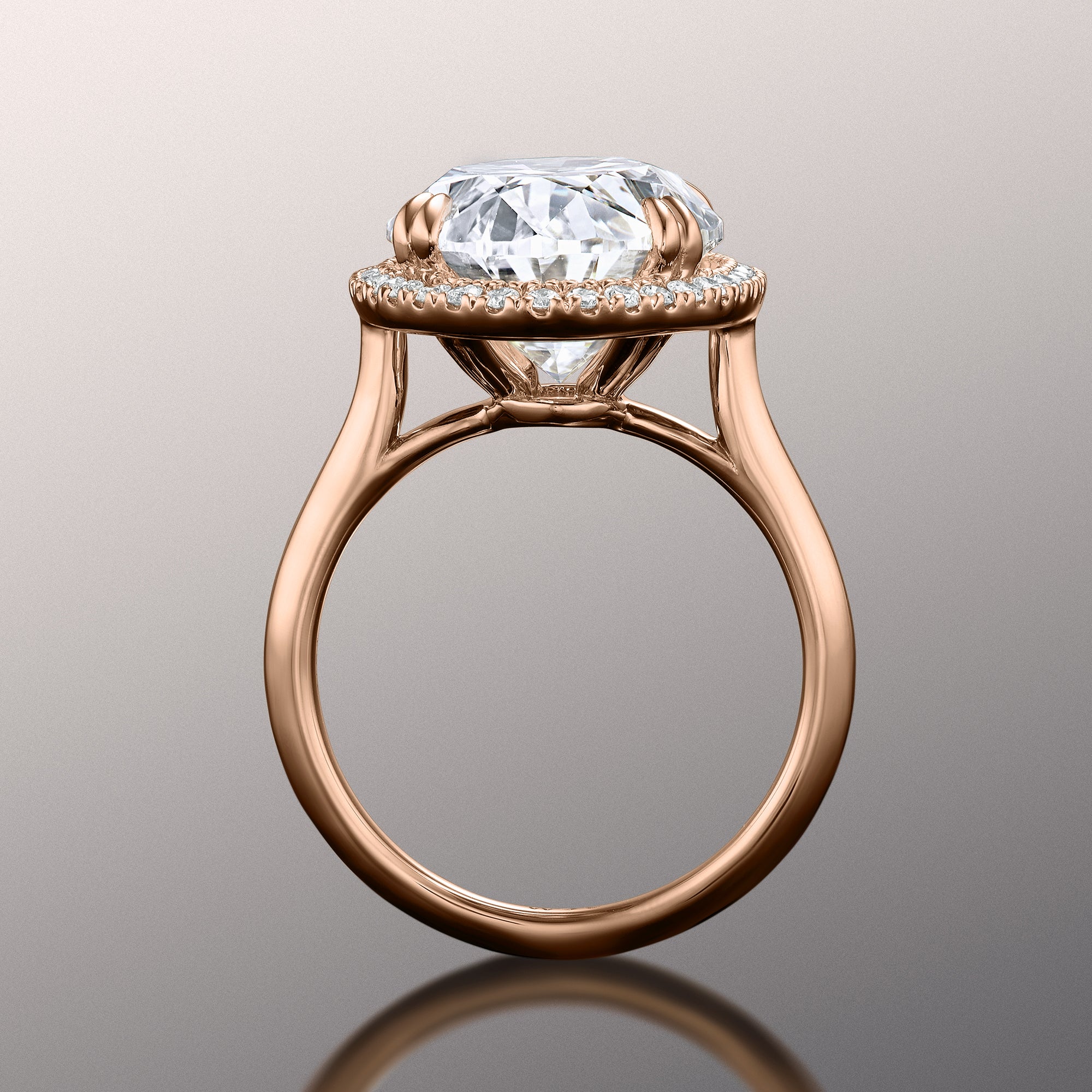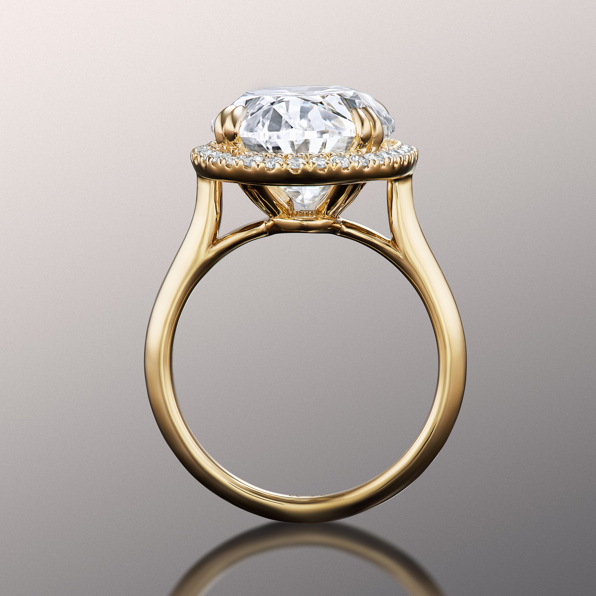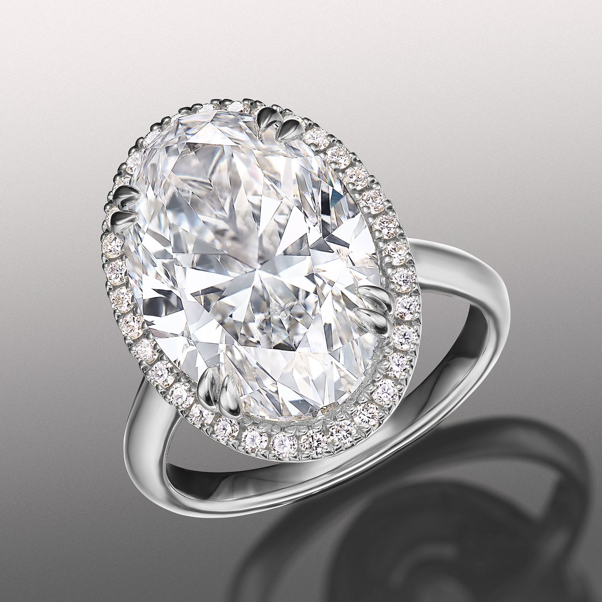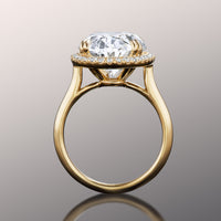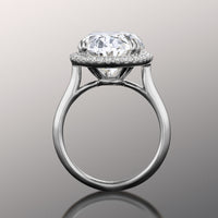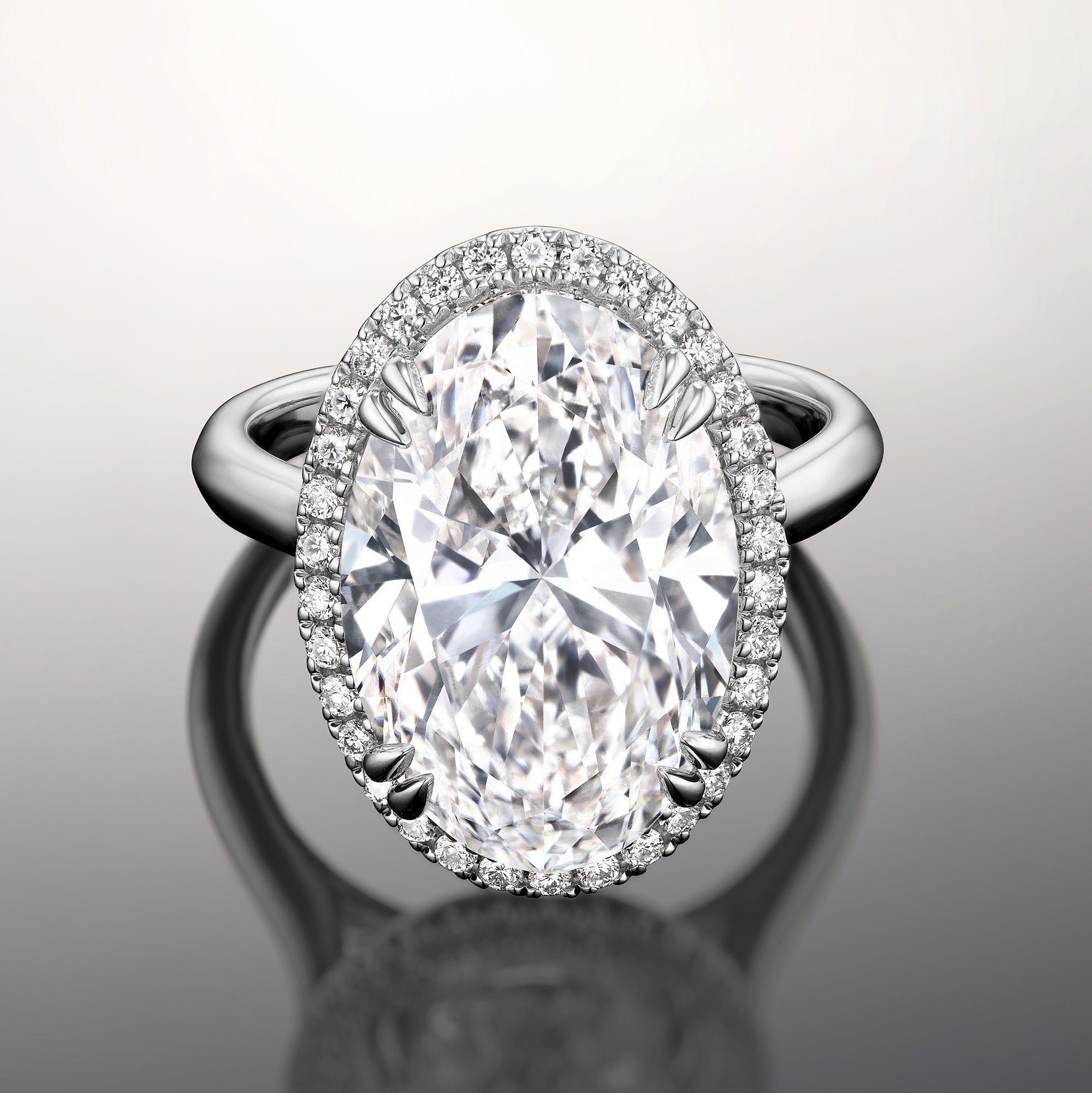 Designed to turn heads, this ring commands focus on its brilliance and innate beauty. The luxurious design captivates with its oval diamond center stone surrounded by a mesmerizing halo of round-cut diamonds. The highly brilliant central gem sits on a well-proportioned cathedral shank with a polished, knife-edge design.
