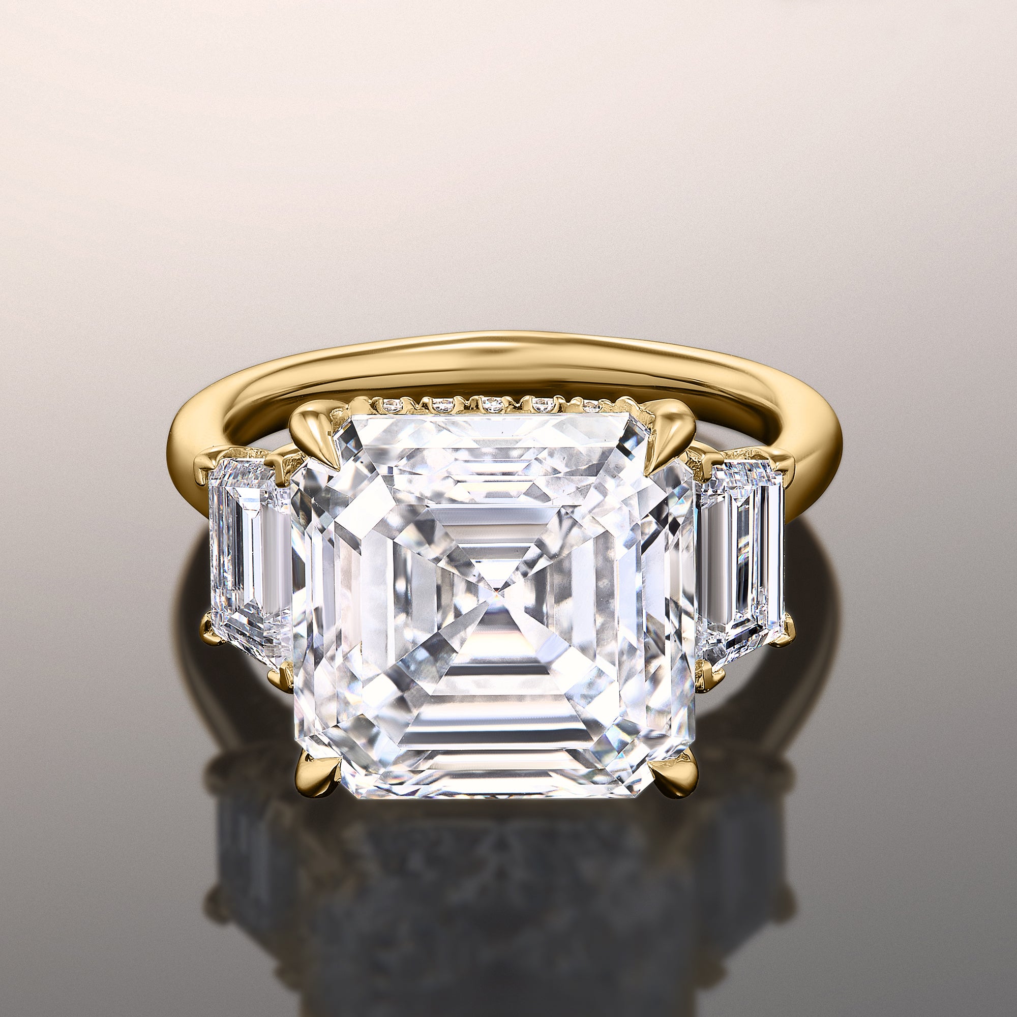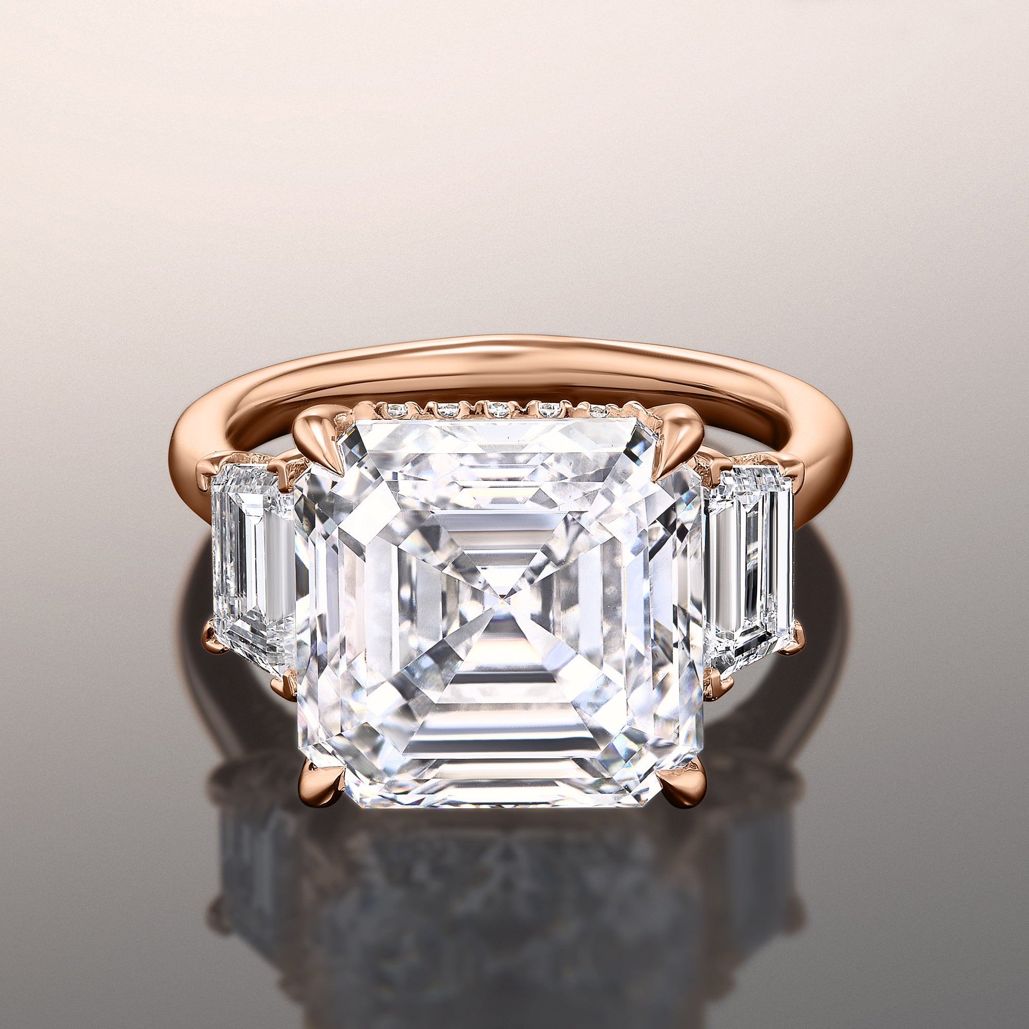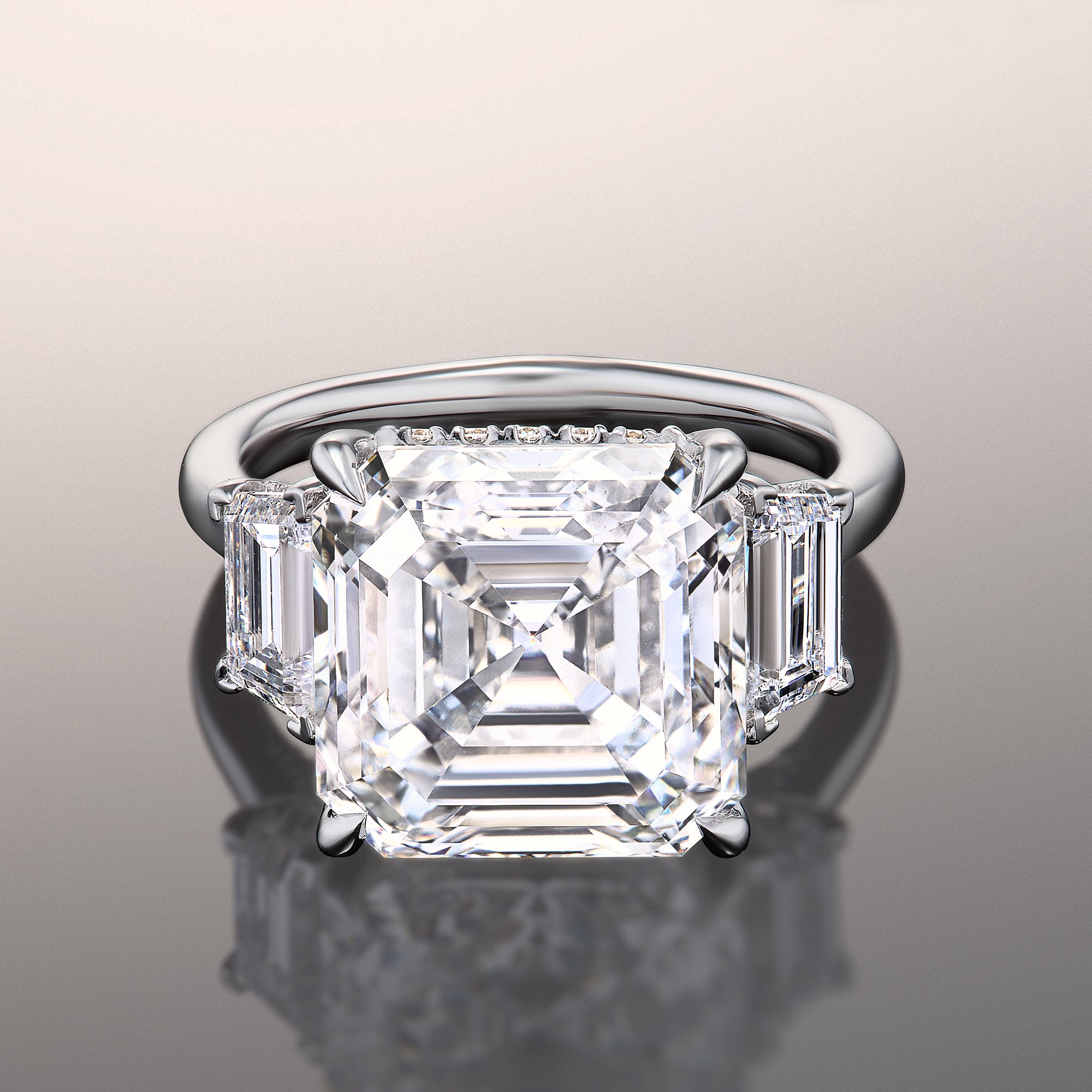 How can the Vecellio be the perfect representation of your love? This beauty boasts a three-stone engagement ring style, symbolizing the past, present, and future of a love story. It impresses with a radiant 10.0 ct Asscher diamond at the center flanked by unique yet perfectly matched trapezoid-cut diamond side stones. Accompanying the three main gems are round diamonds trailing the rails of each of the four-prong settings. More round diamonds line the bridge for a remarkable sparkle.