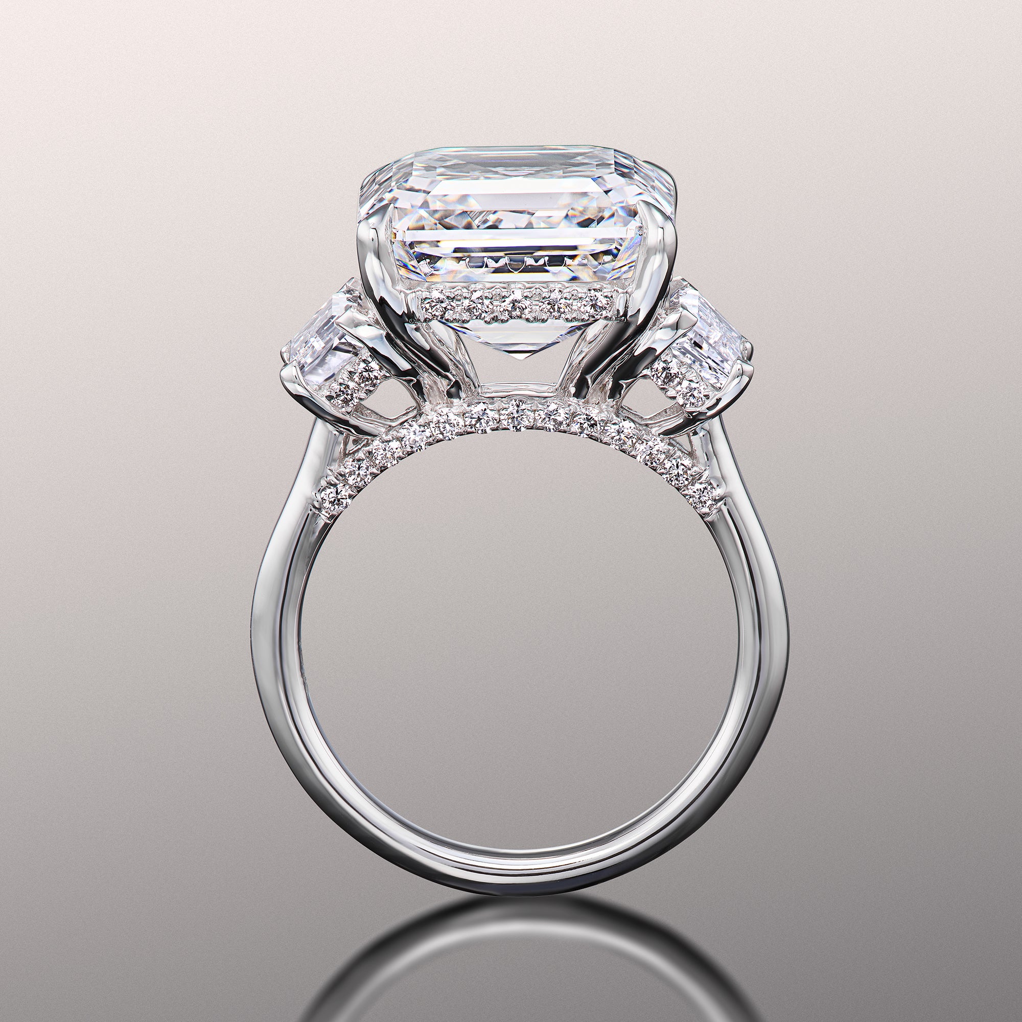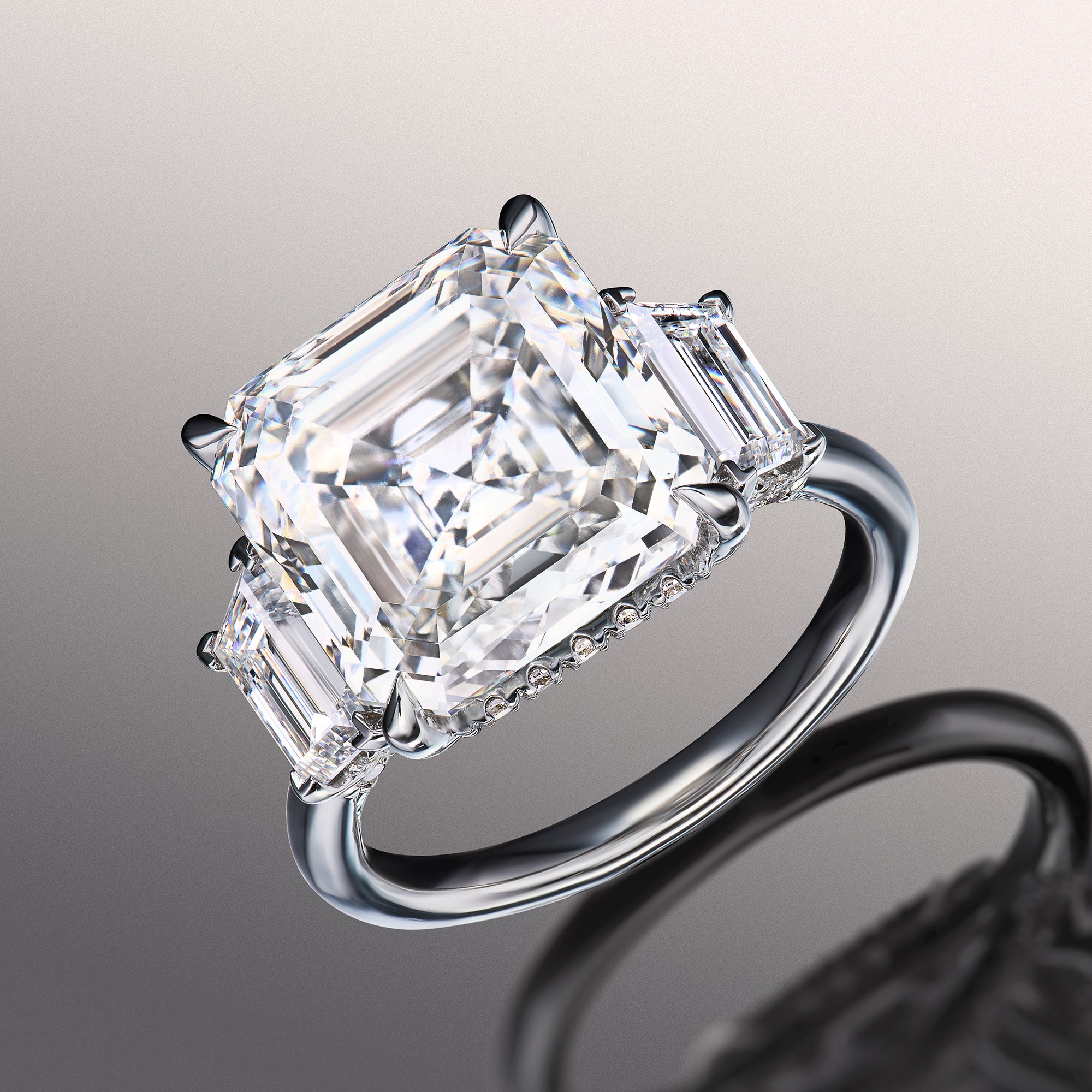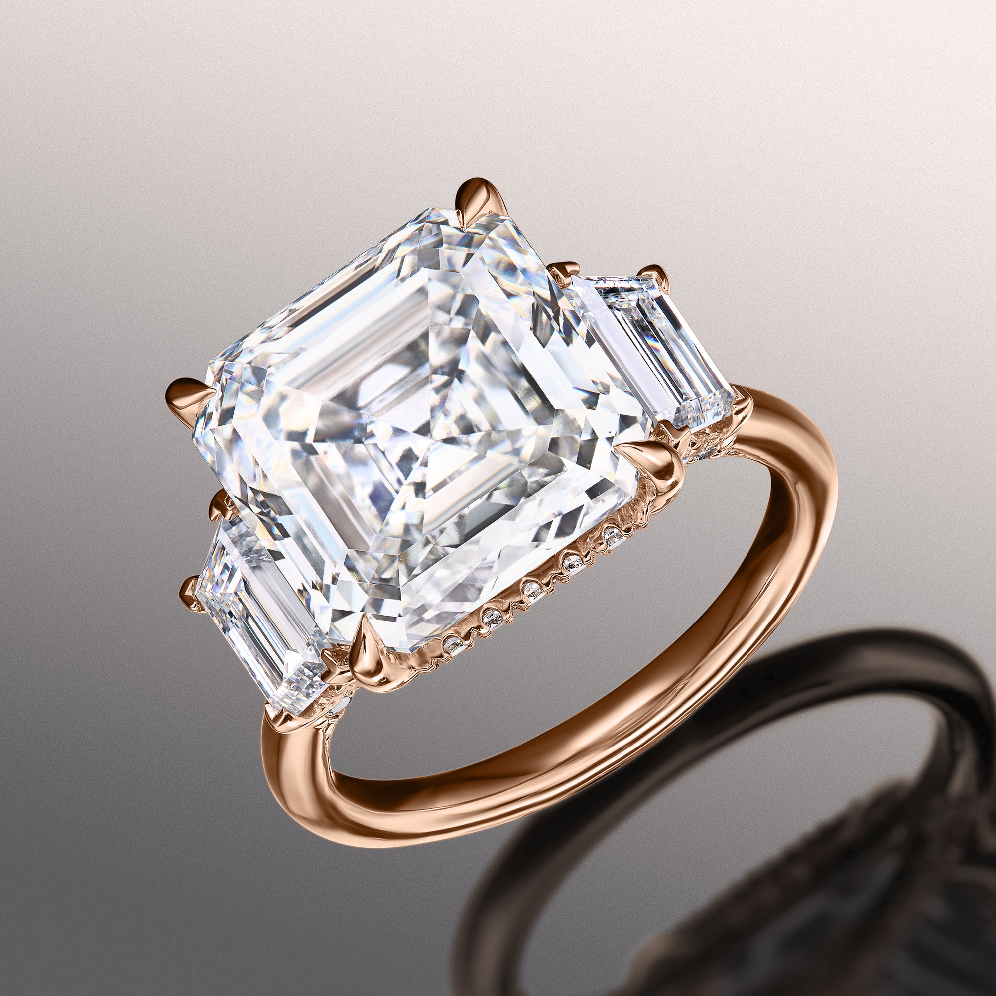 How can the Vecellio be the perfect representation of your love? This beauty boasts a three-stone engagement ring style, symbolizing the past, present, and future of a love story. It impresses with a radiant 10.0 ct Asscher diamond at the center flanked by unique yet perfectly matched trapezoid-cut diamond side stones. Accompanying the three main gems are round diamonds trailing the rails of each of the four-prong settings. More round diamonds line the bridge for a remarkable sparkle.