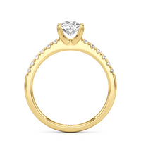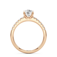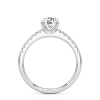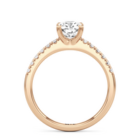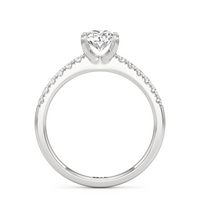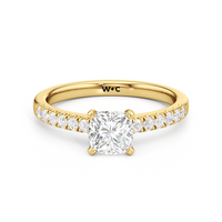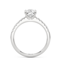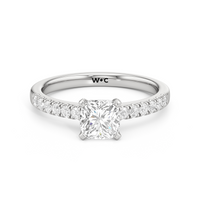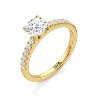 The sophisticated Vera Engagement Ring is set with a diamond in a four-prong setting. The ring's shoulders are adorned with numerous round diamonds on scalloped prongs, offering a look that will never go out of style.