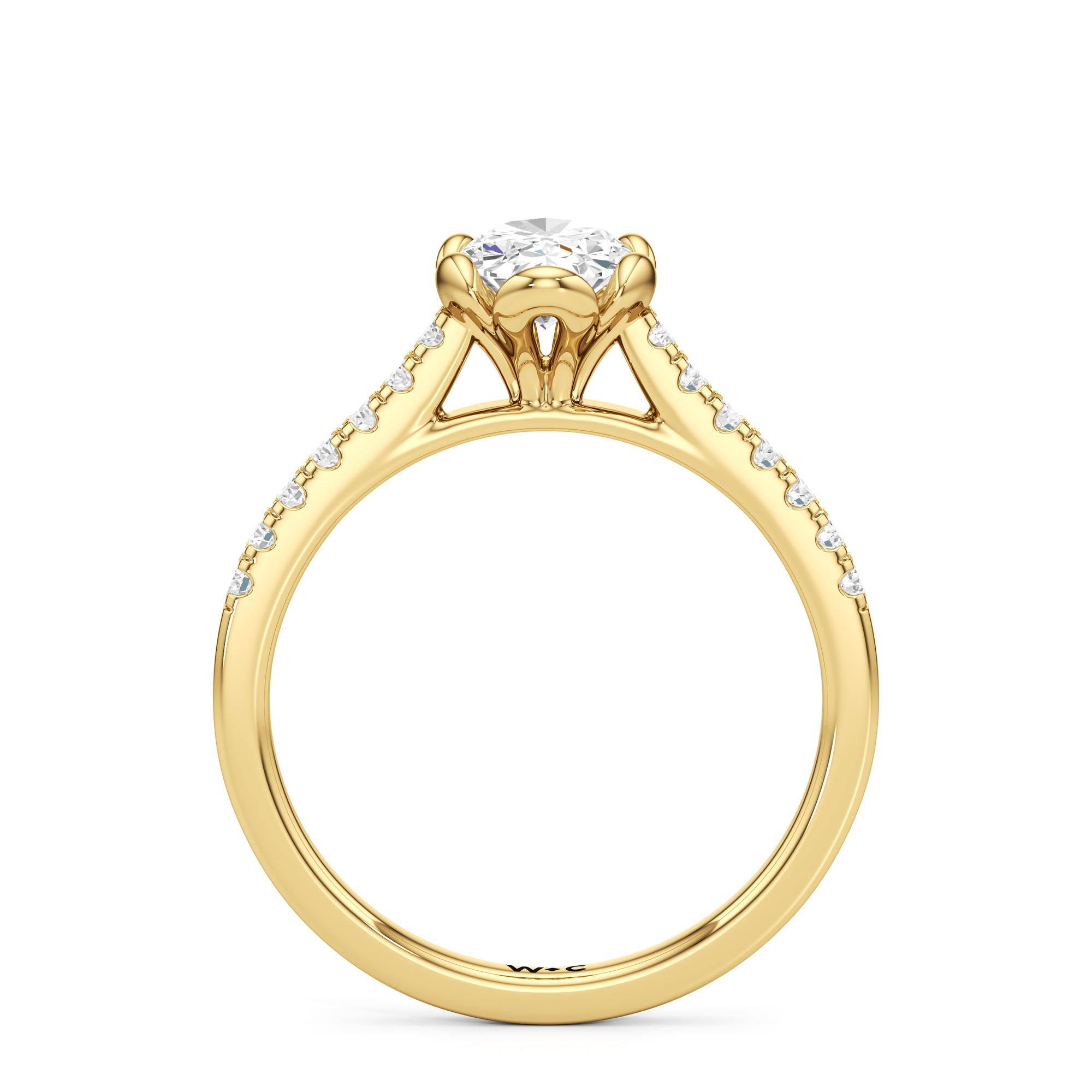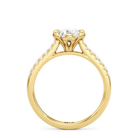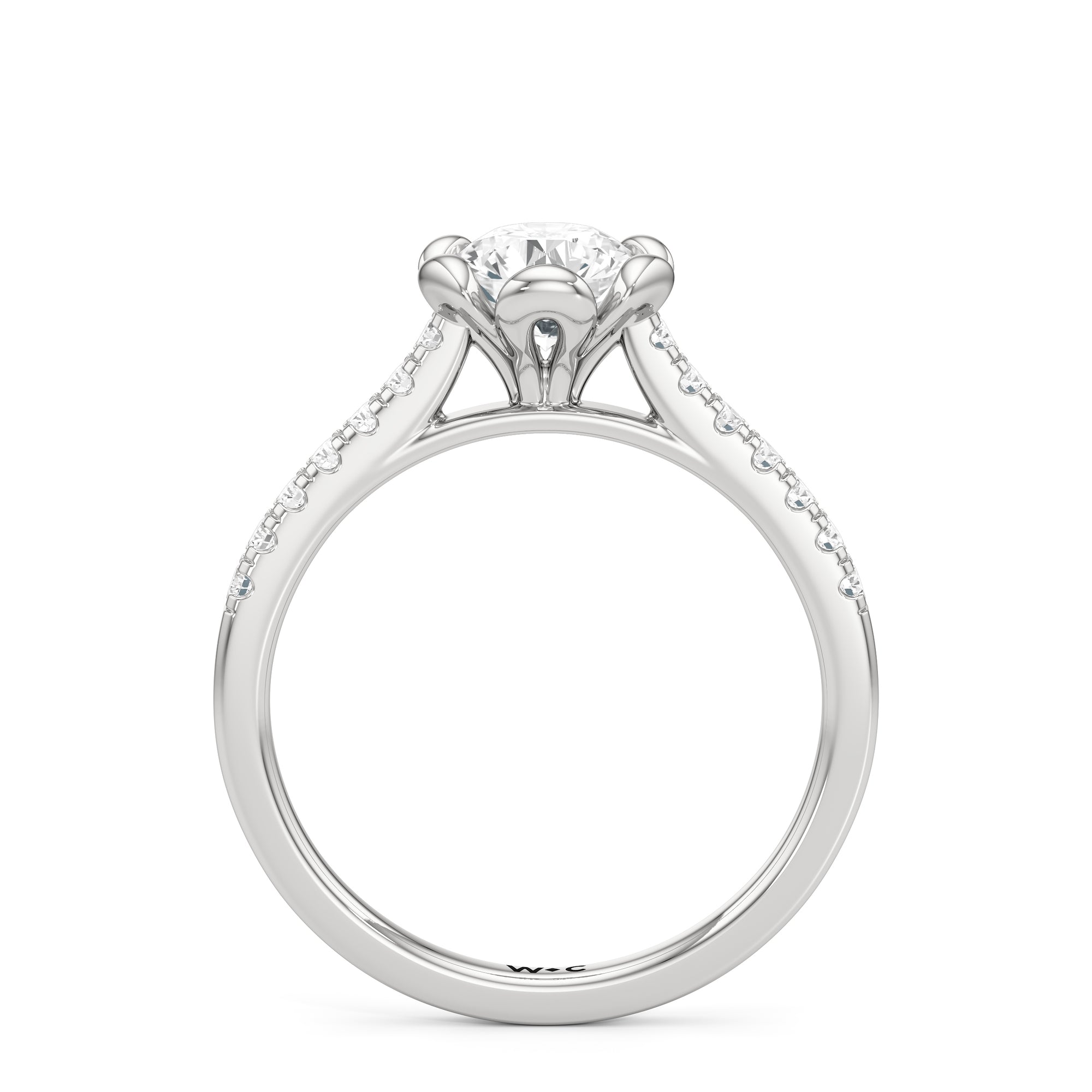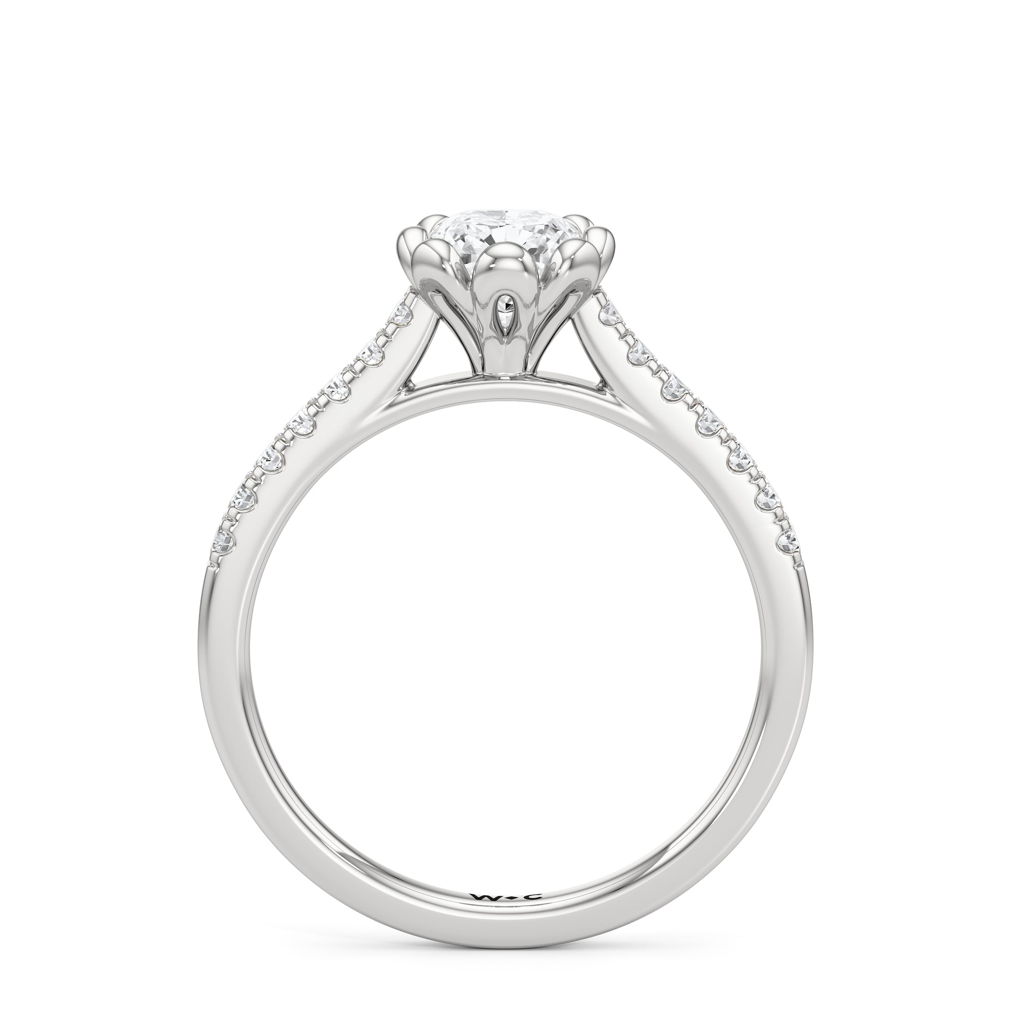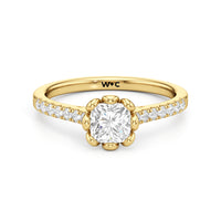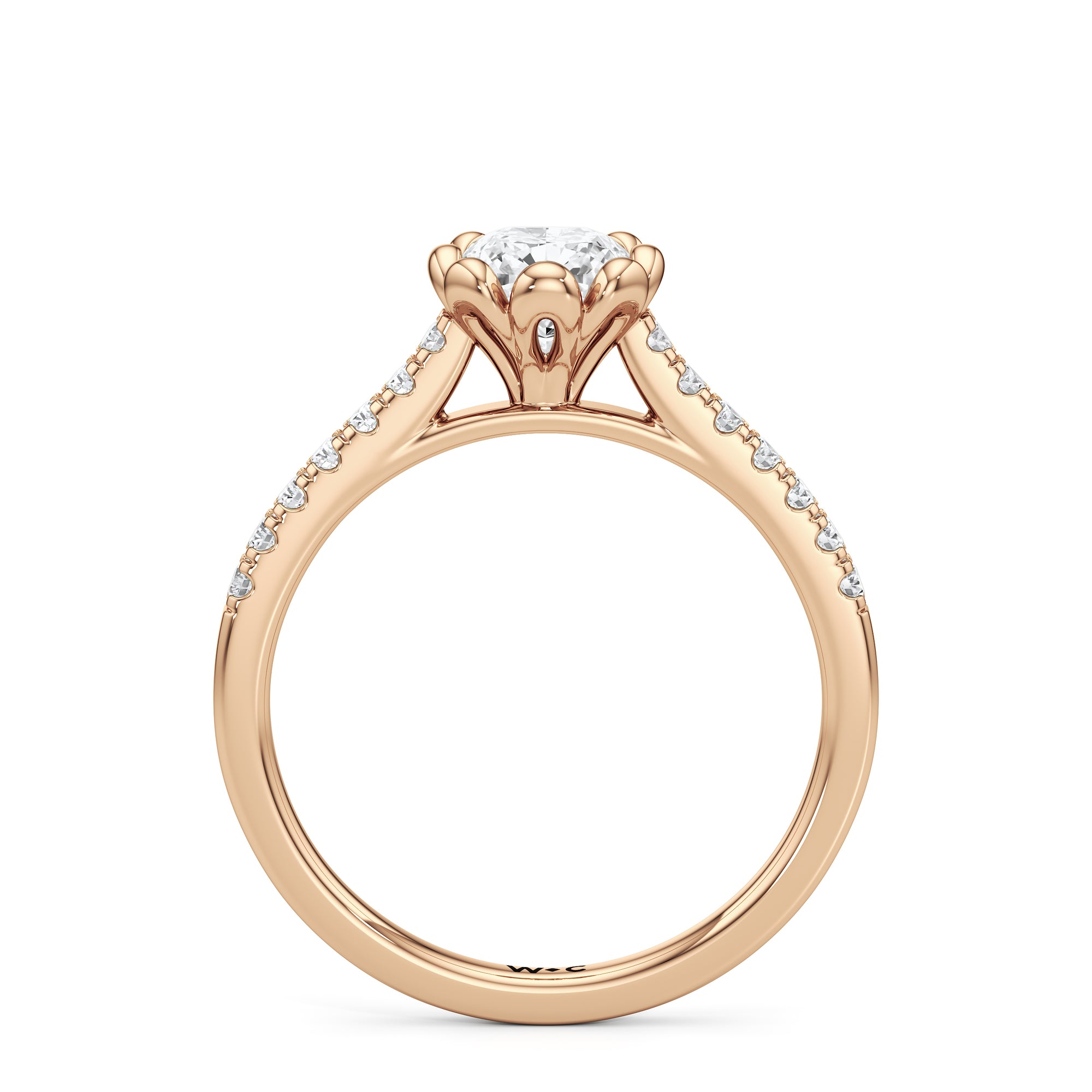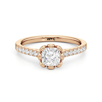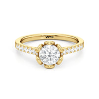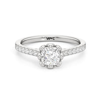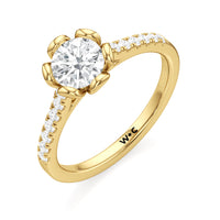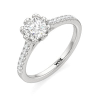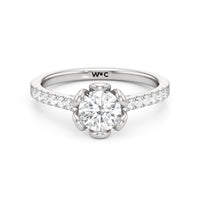 Celebrate your blooming love with this flower-inspired engagement ring. The Violet features a cathedral shank with shoulders adorned with French pavé diamonds that give the band a dramatic appearance. It carries a diamond at its heart, cradled by sculpted claws that resemble a flower's petals. This masterpiece blends natural beauty with refined artistry to showcase the essence of timeless romance.