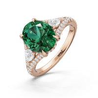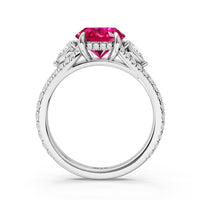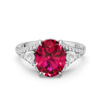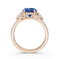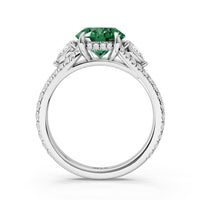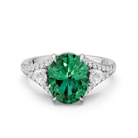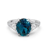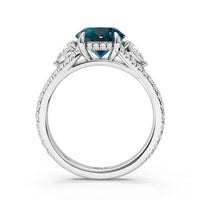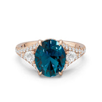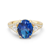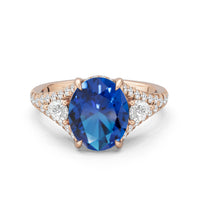 Four prongs hold an oval blue sapphire, framed by a hidden halo that glimmers softly. The diamond-traced cathedral split shank curves gracefully, with pear-cut side stones set along its sweep. The design, inspired by natural forms, is indeed a subtle reflection of verdant life.