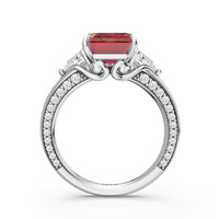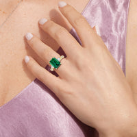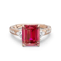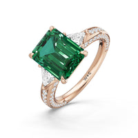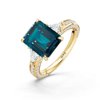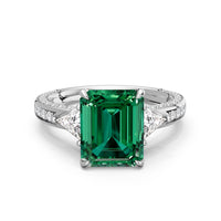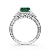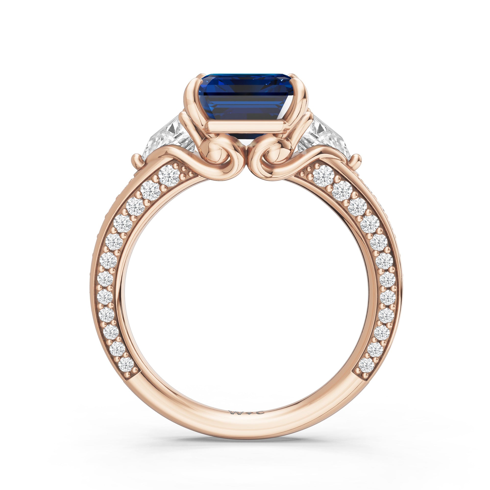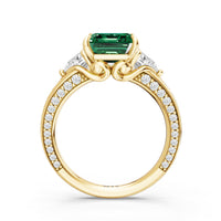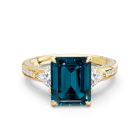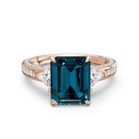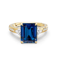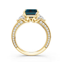 Centered on a rich blue sapphire, the green stone is lifted by four prongs and framed by trillion-cut diamond side stones. A filigree motif beneath the centerpiece adds a subtle lace of craftsmanship, while three rows of diamonds along the shank provide the perfect sparkle.
