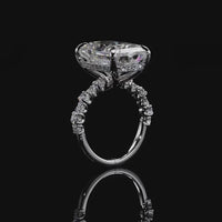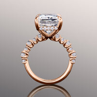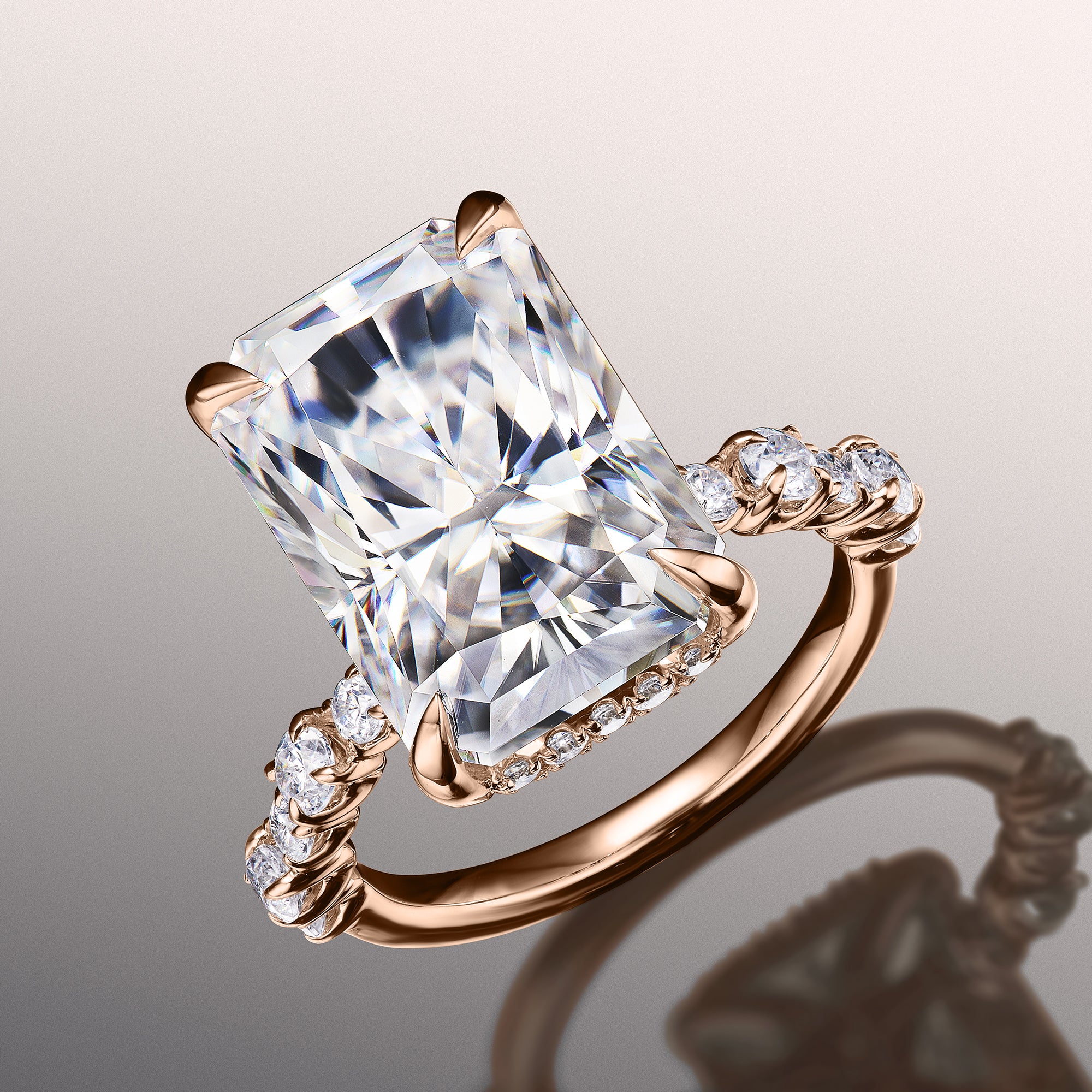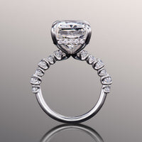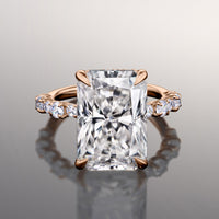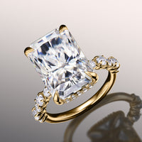 Immerse yourself in a creative masterpiece that defies the notion of tradition. This ring boasts a jaw-dropping radiant-cut diamond center stone. The central gem is cradled by a four-prong setting with a rail sophisticatedly traced by round diamonds. The band's shoulders feature a stylized row of big and small round diamonds set in shared u-shaped prongs.