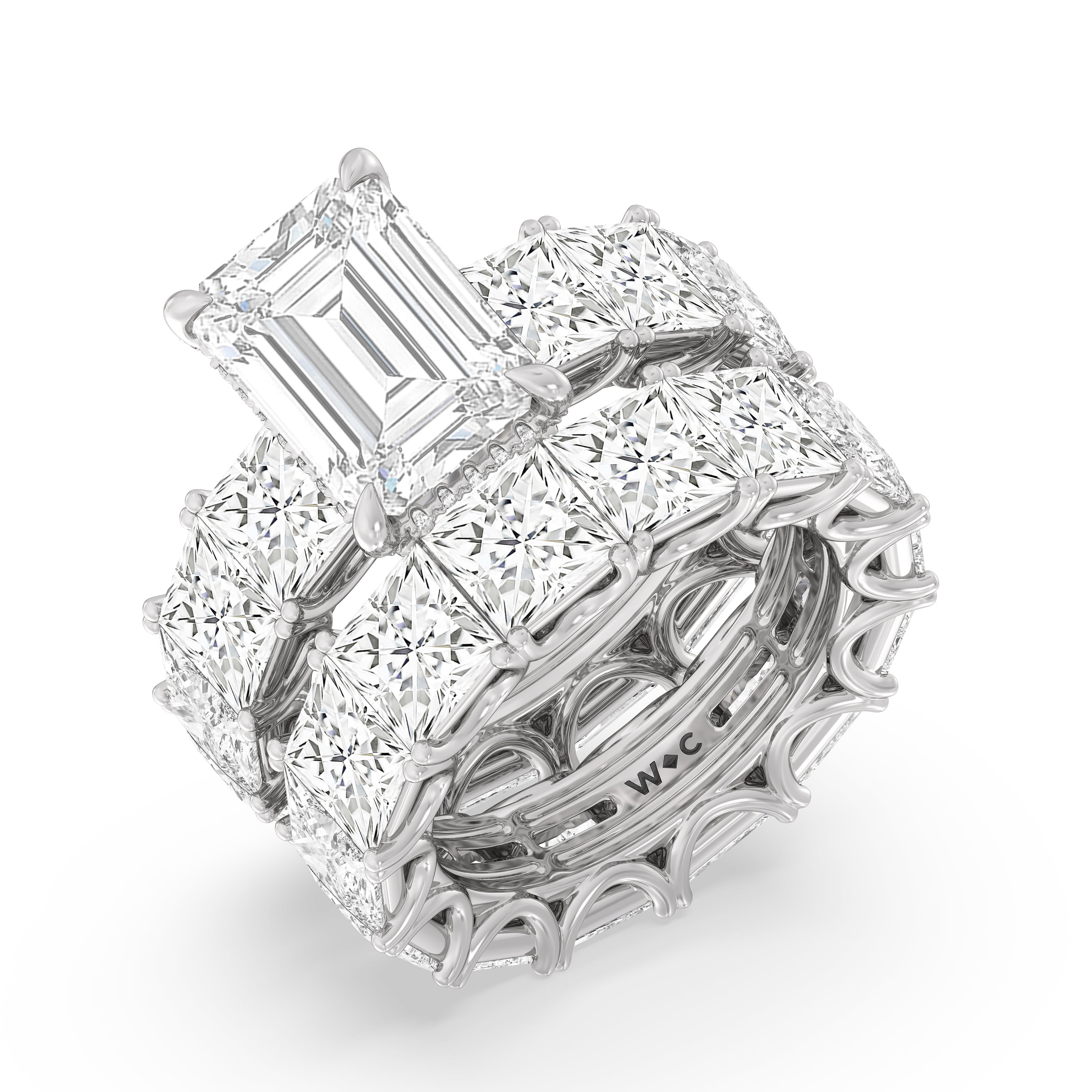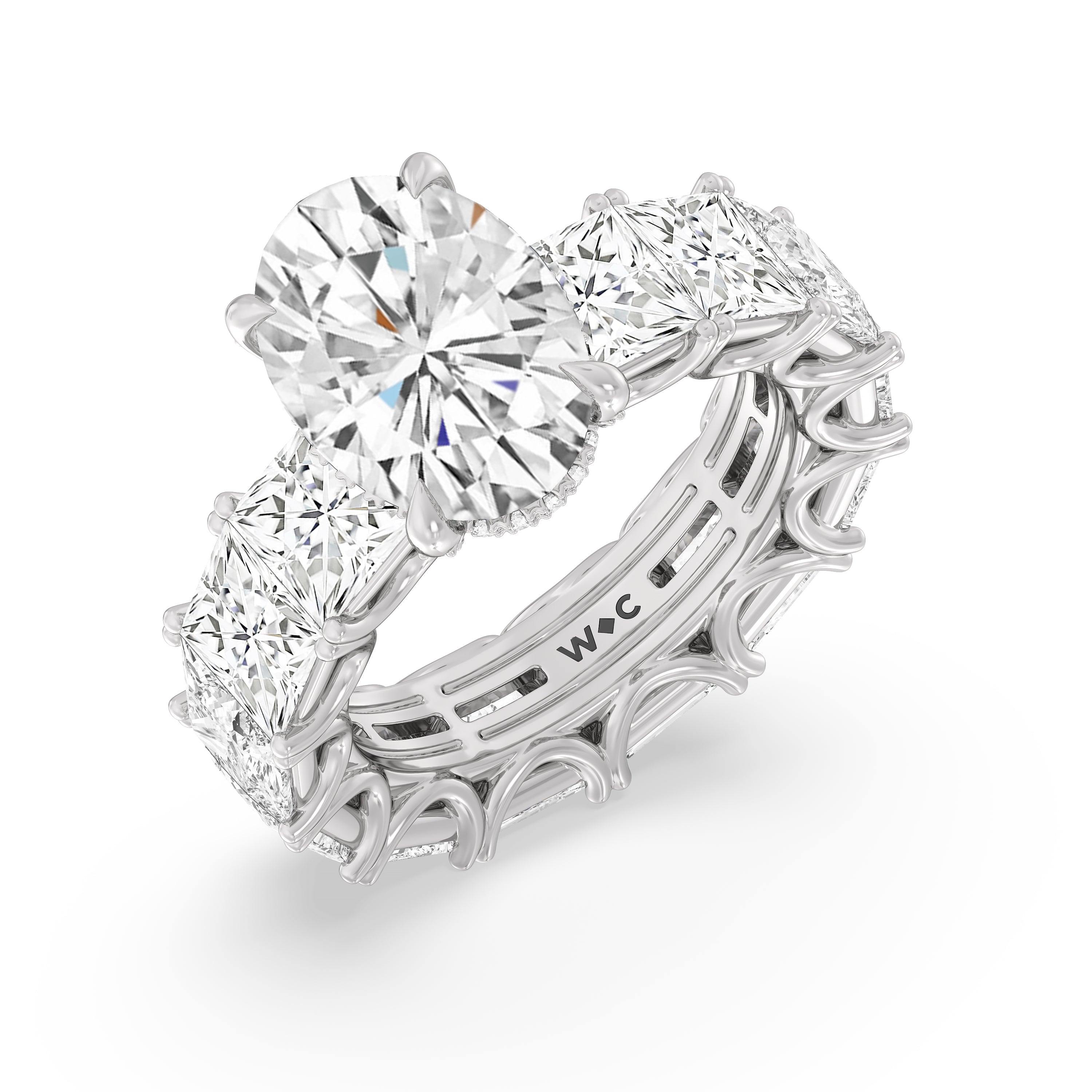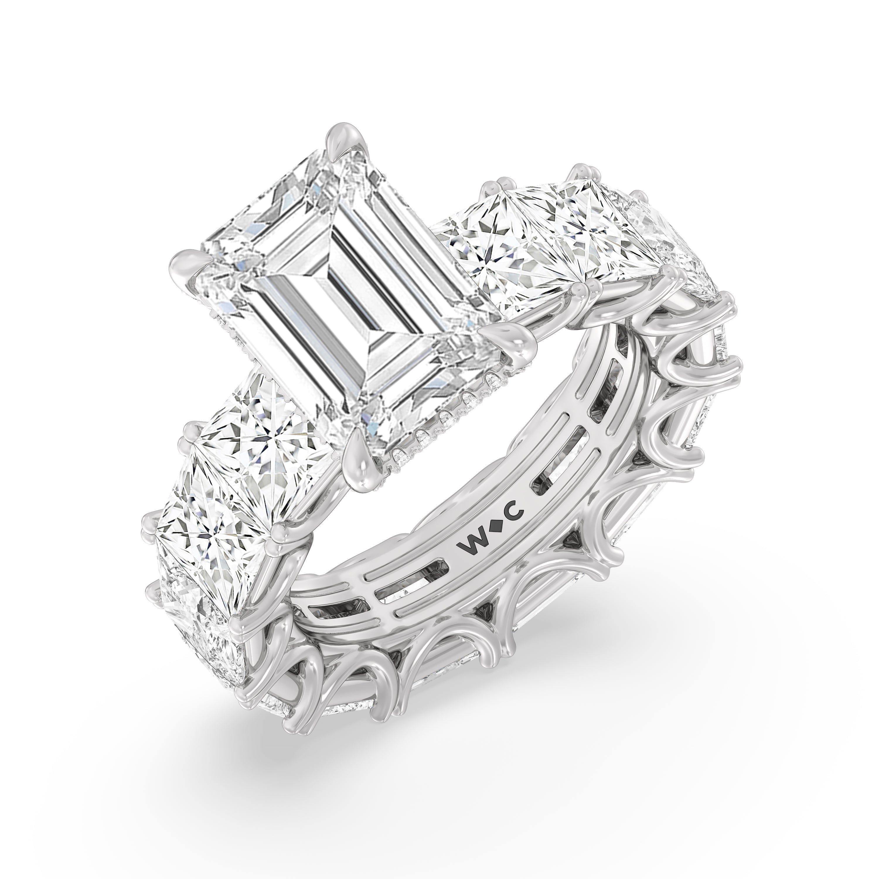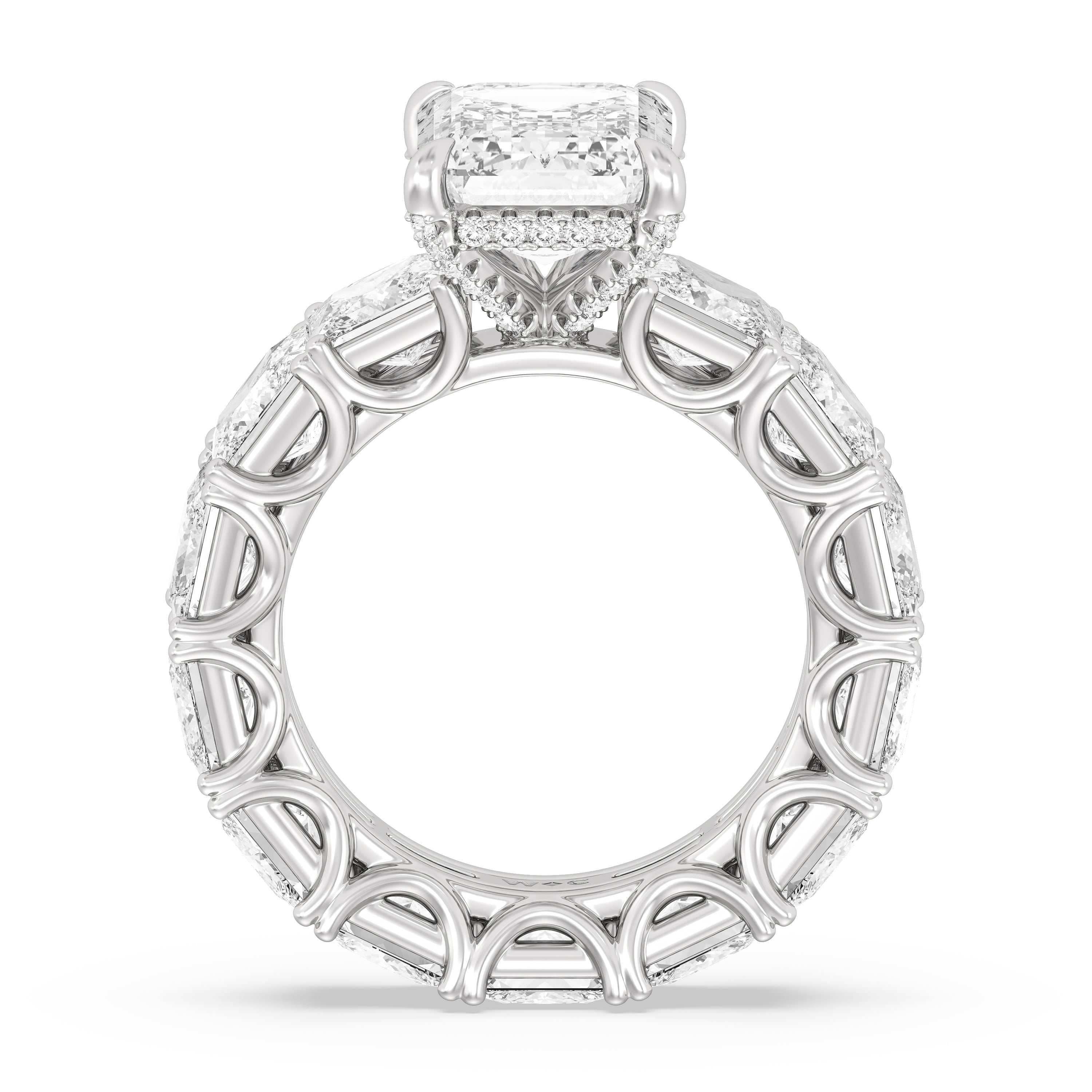 Celebrate the love that turned your world around with this diamond engagement ring that offers 360 degrees of sparkle. It is graced with a striking diamond center stone in your choice of cut: round, oval, or emerald. Thirteen princess-cut diamonds, each mounted on a u-shaped prong setting, run along the band's entire circumference, ensuring the ring's exceptional brilliance.
