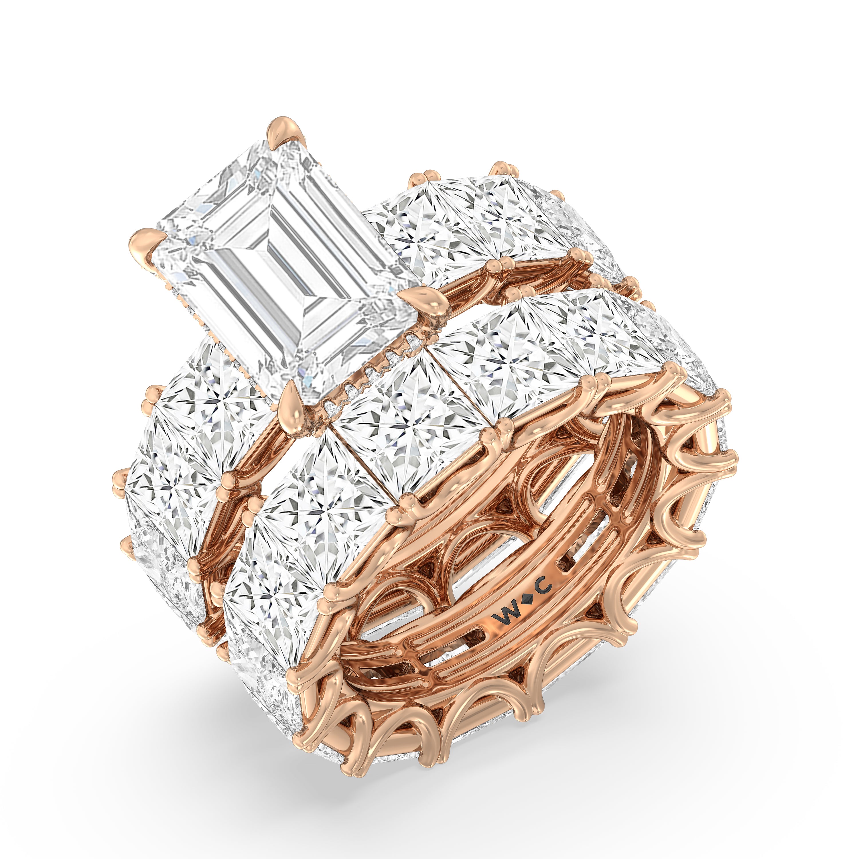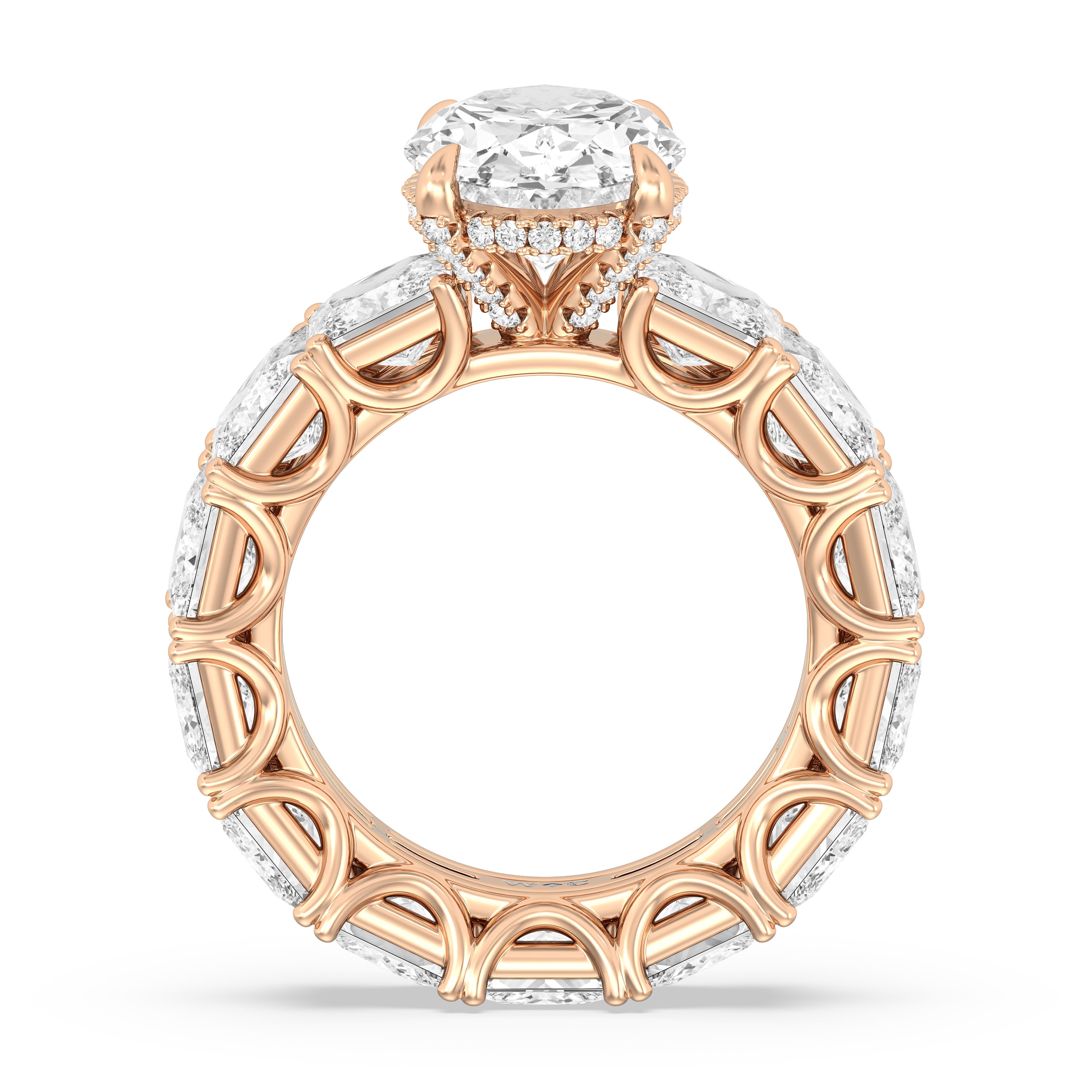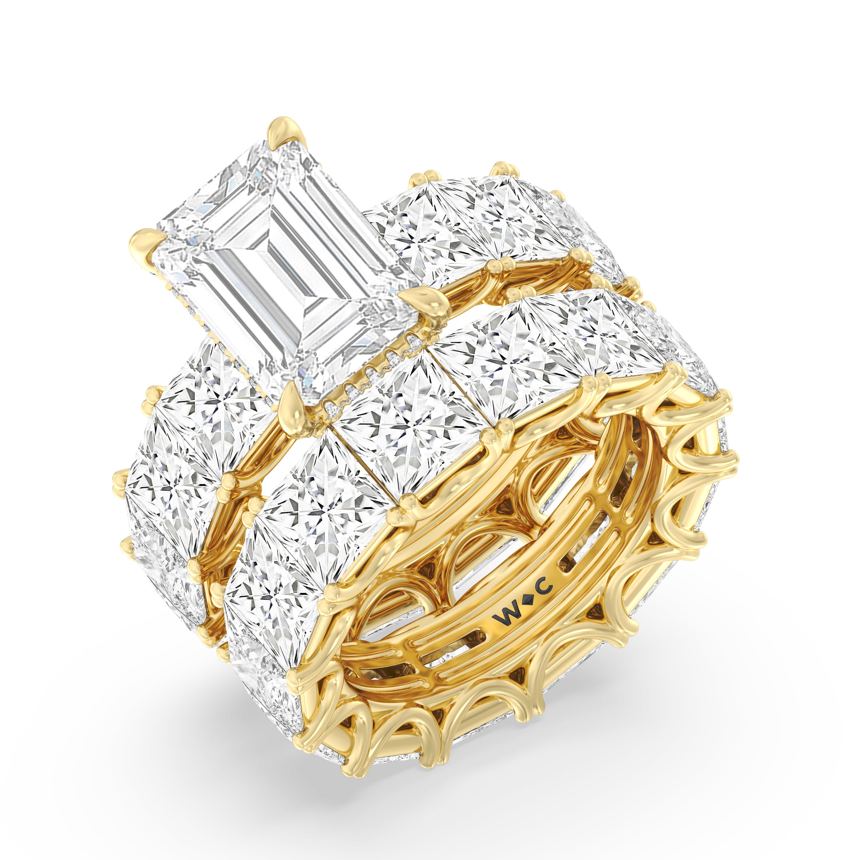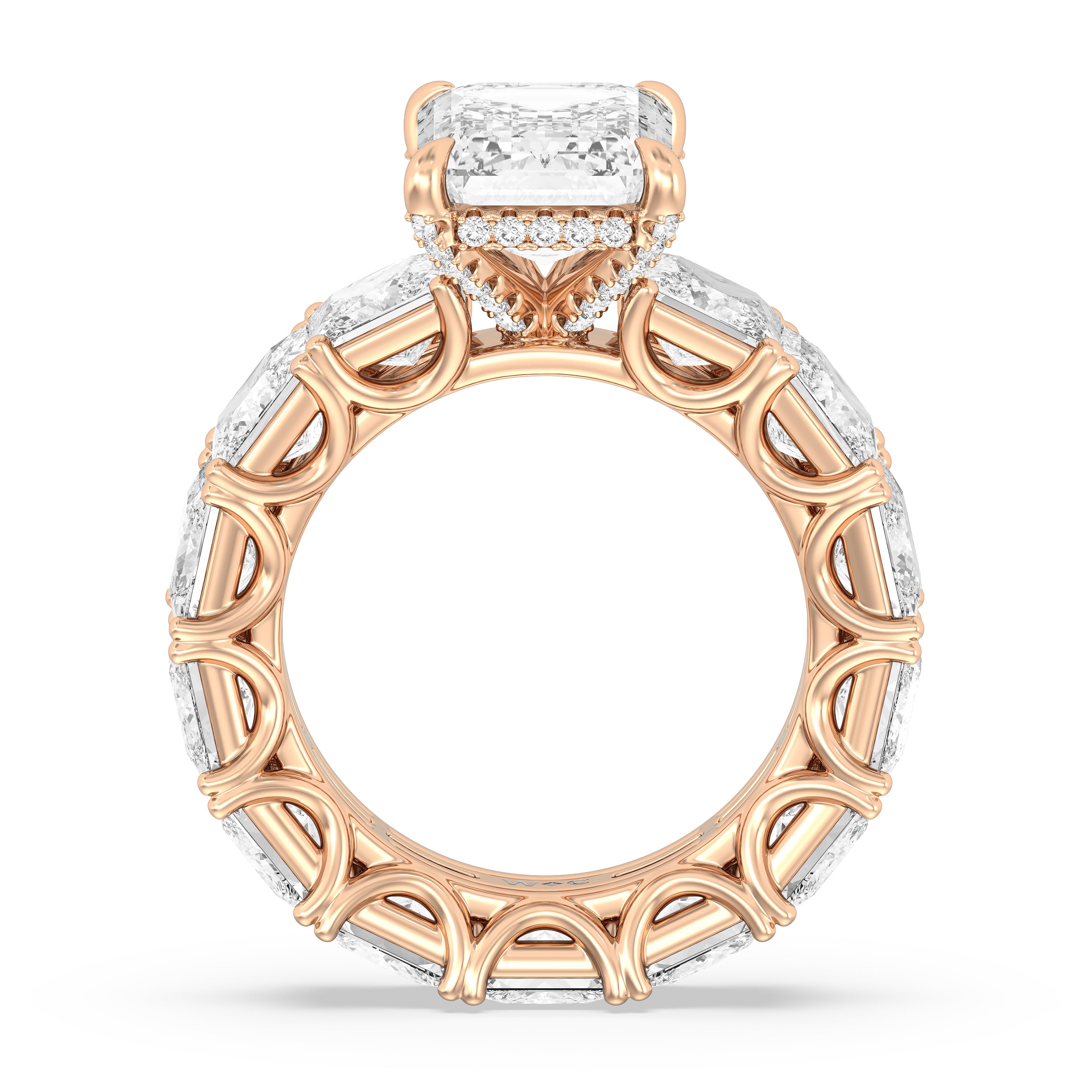 Celebrate the love that turned your world around with this diamond engagement ring that offers 360 degrees of sparkle. It is graced with a striking diamond center stone in your choice of cut: round, oval, or emerald. Thirteen princess-cut diamonds, each mounted on a u-shaped prong setting, run along the band's entire circumference, ensuring the ring's exceptional brilliance.