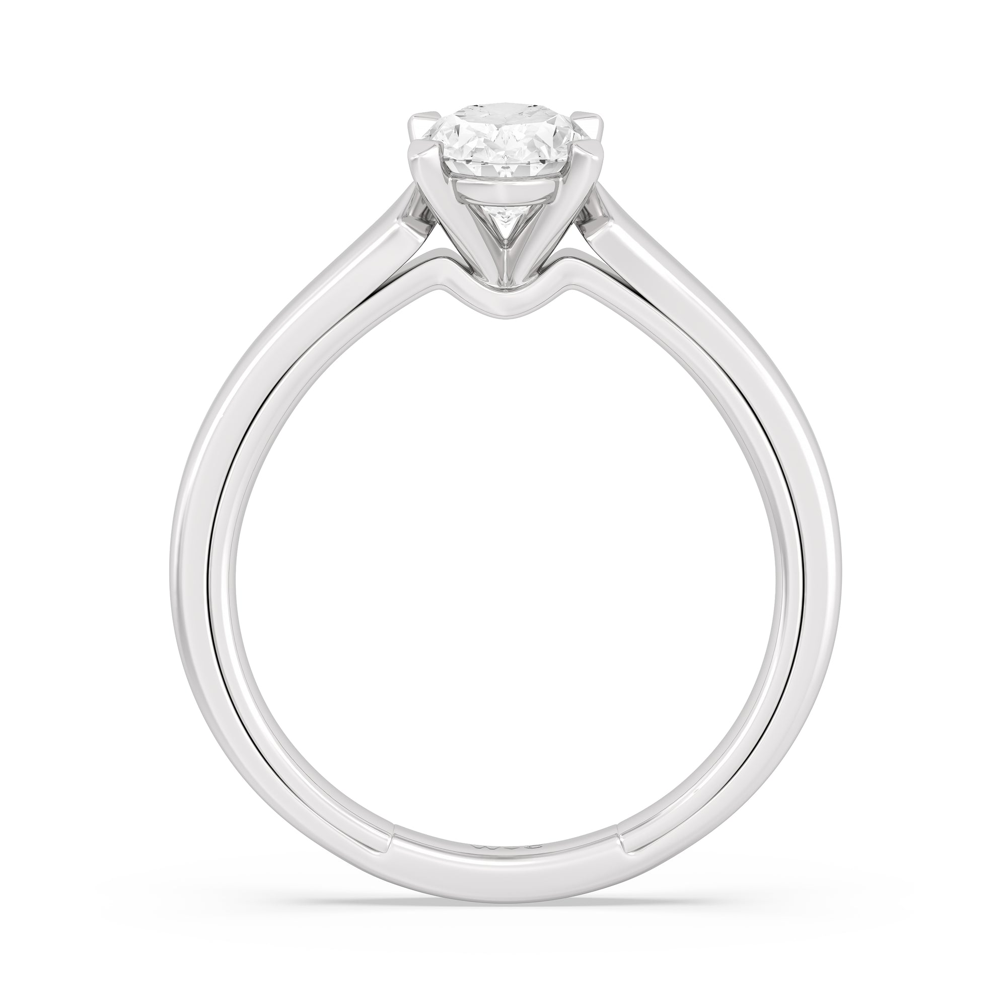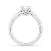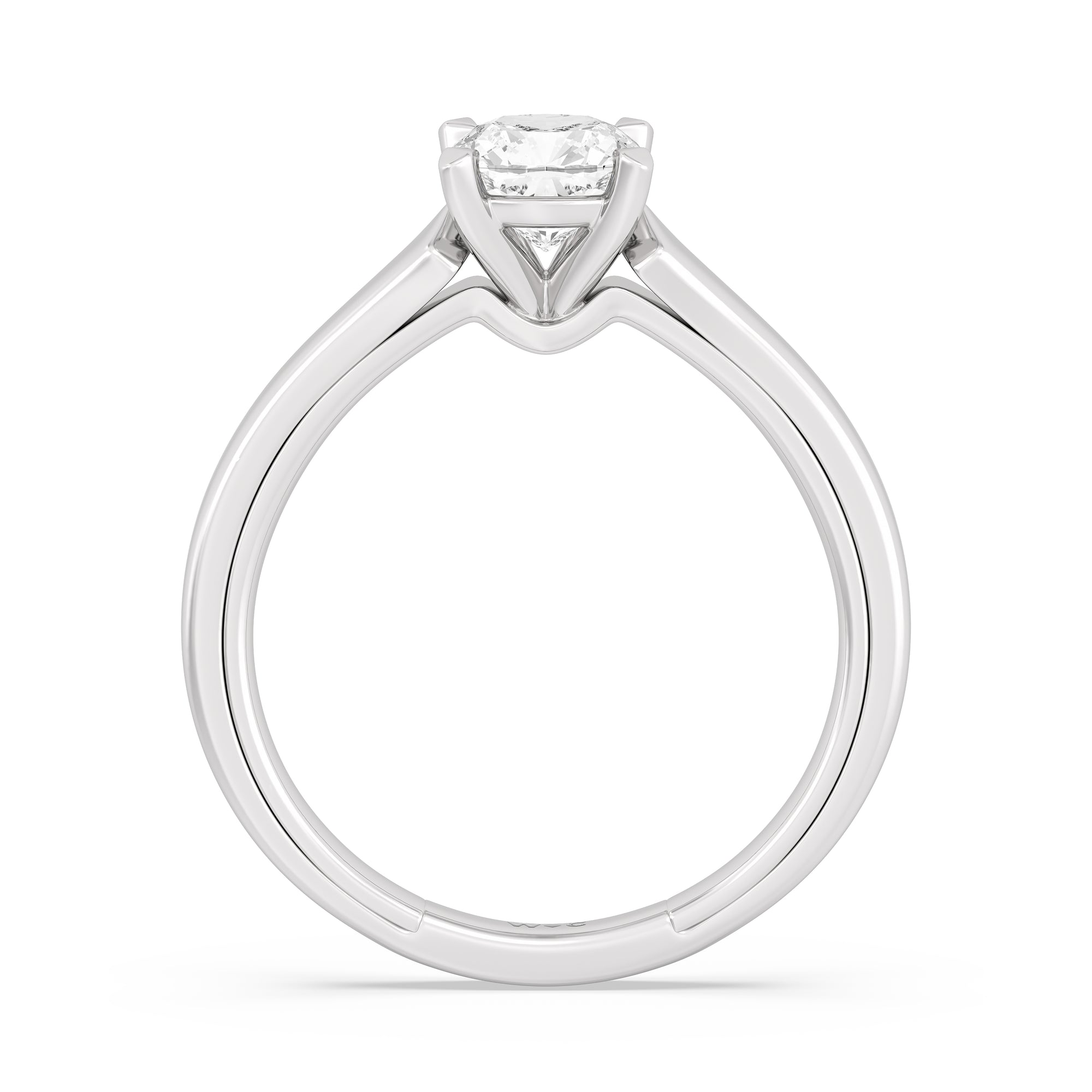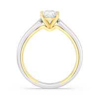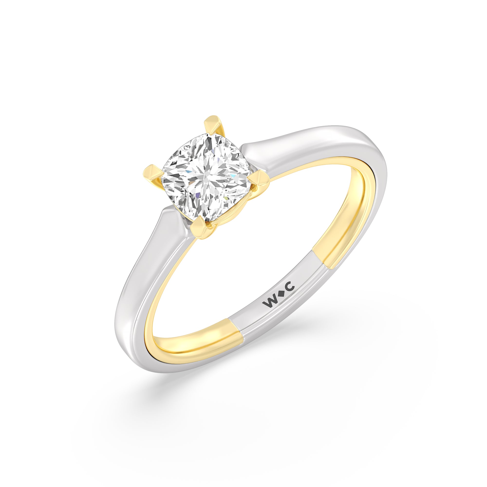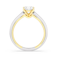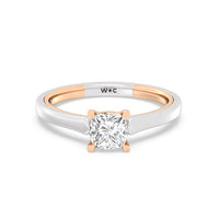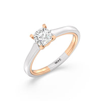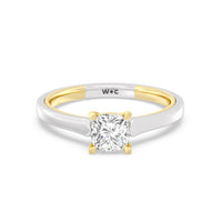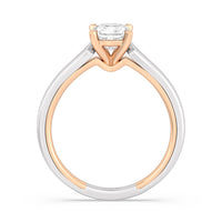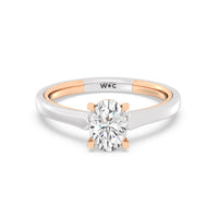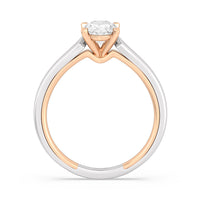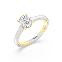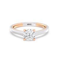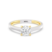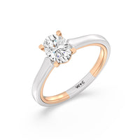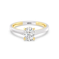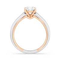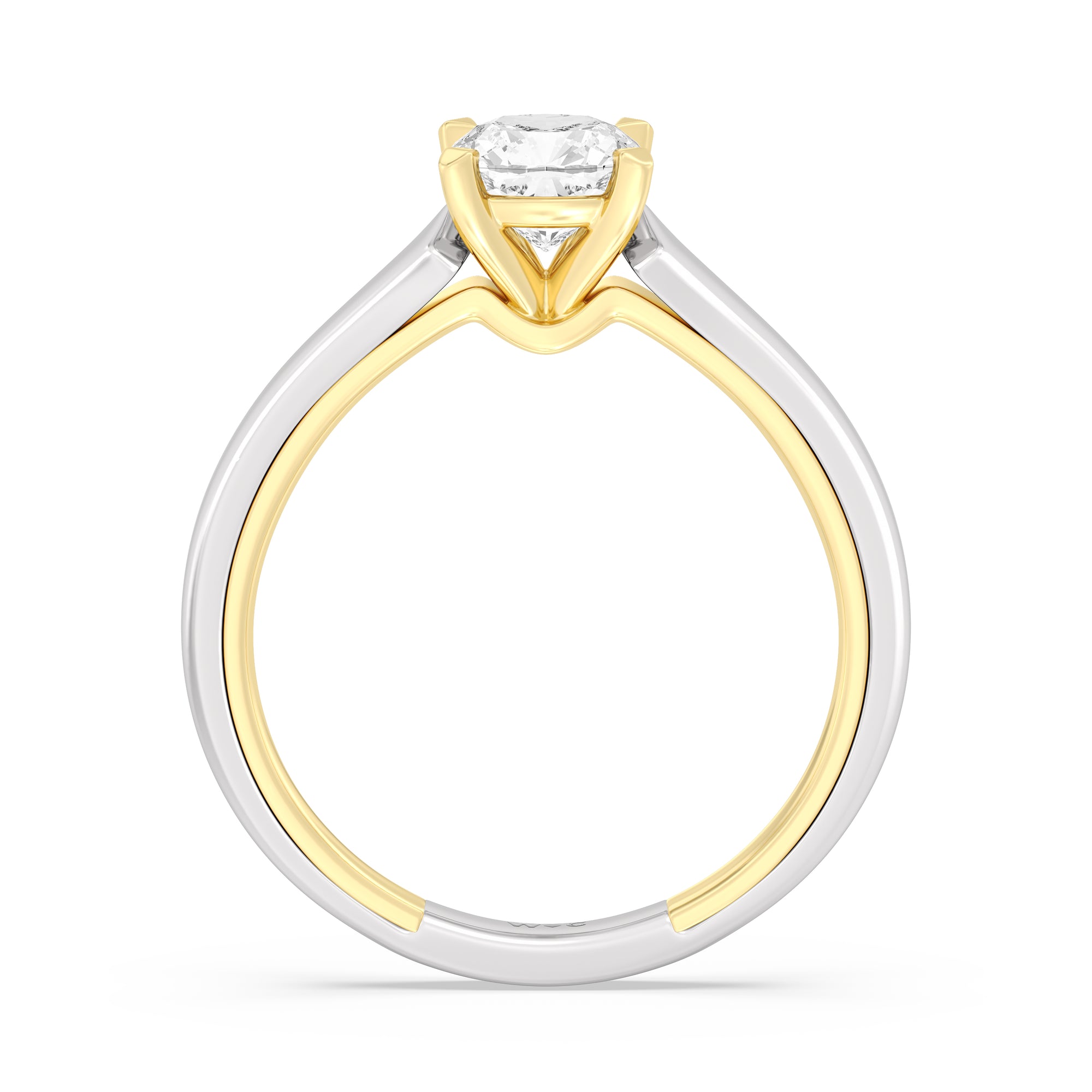This solitaire puts a unique spin on a timeless classic. The solitary diamond sits on a modern, two-toned, layered cathedral shank. The gem is secured by our signature four-prong setting. Ordinarily, a plain and polished single-metal band would do the trick. However, using another metal adds more personality to an otherwise standard solitaire engagement ring.