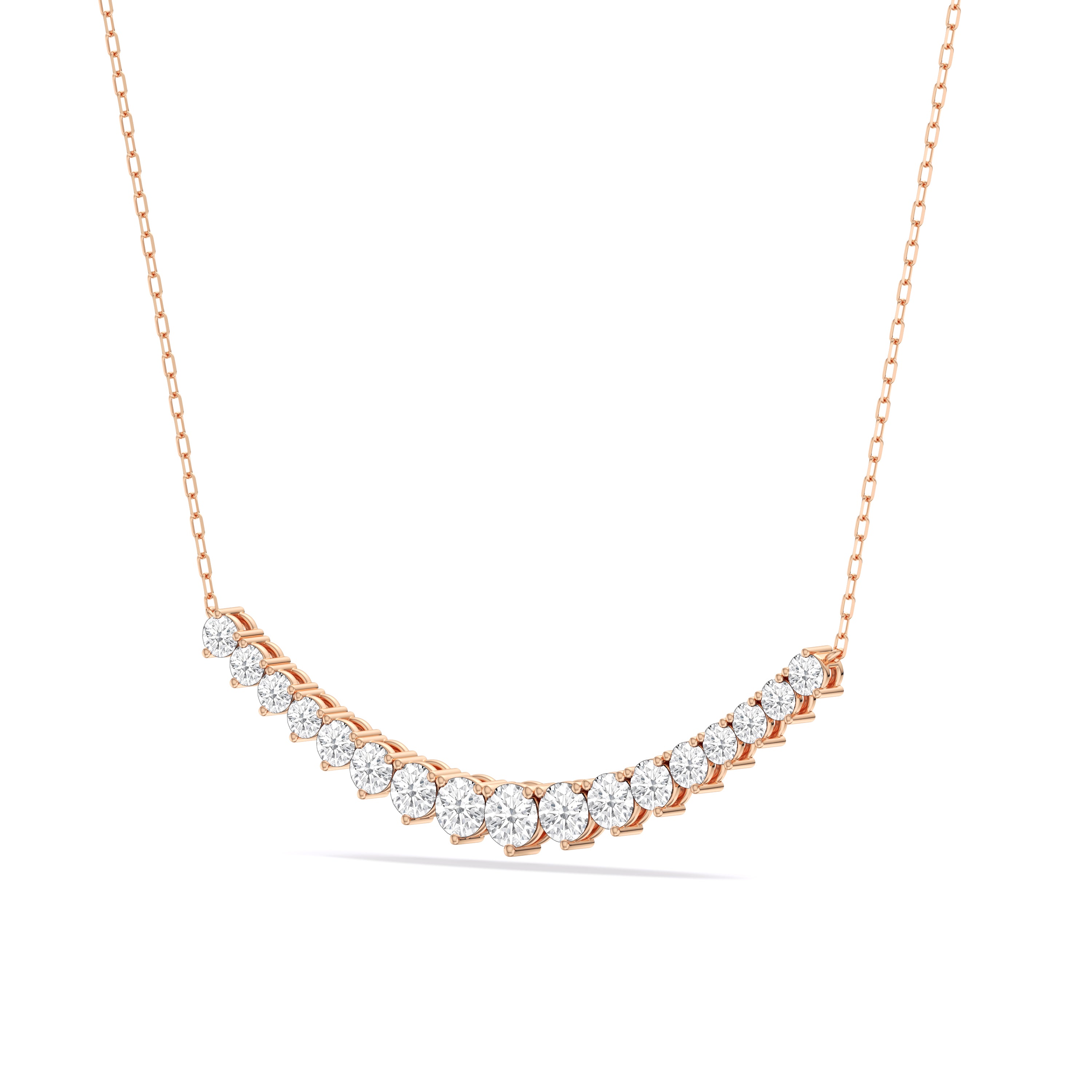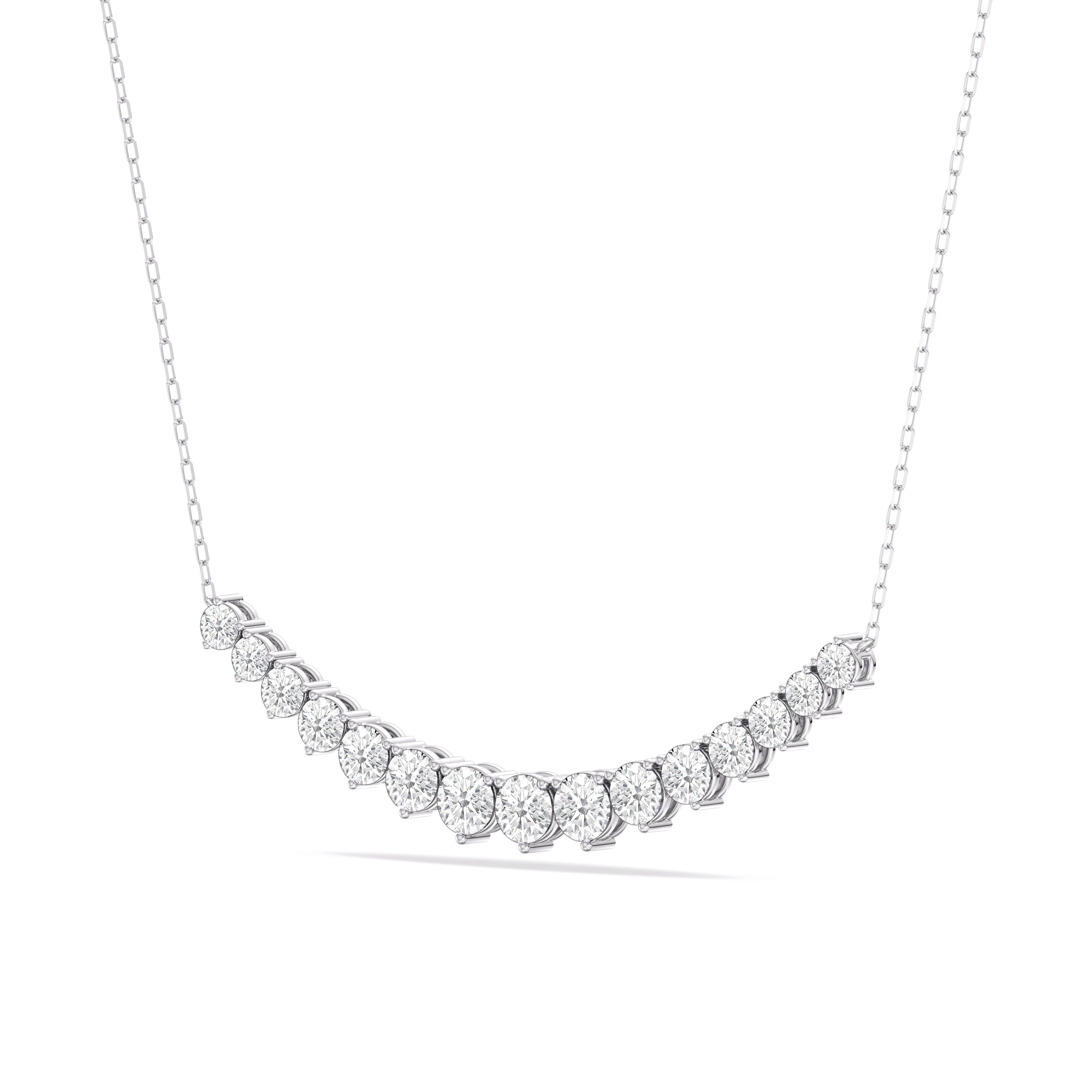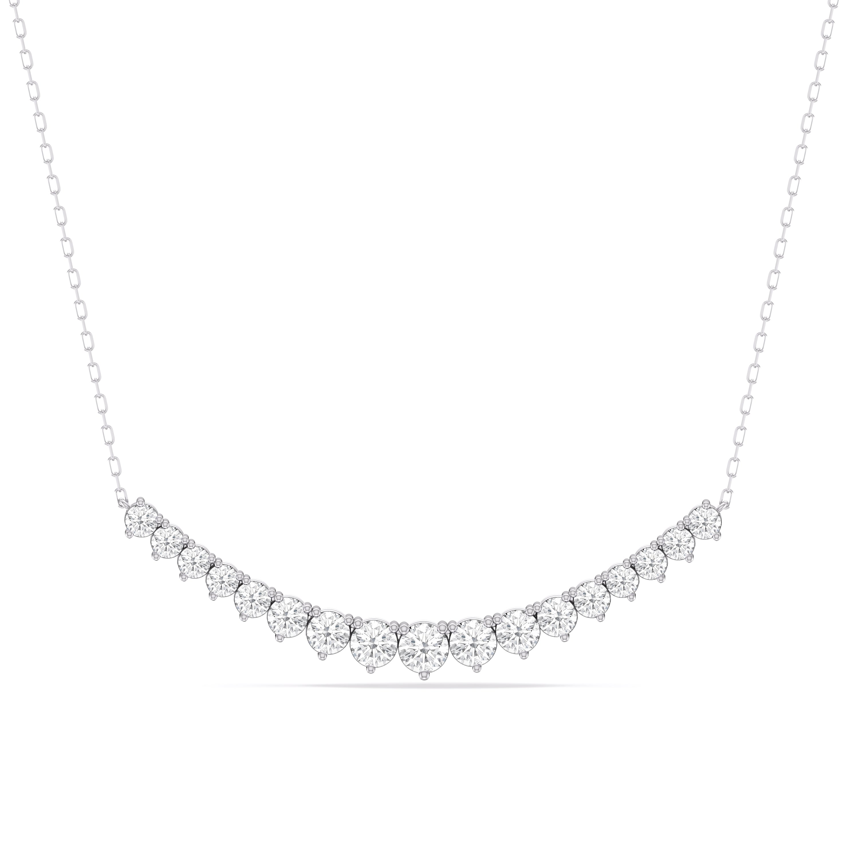For a fresh take on the classic tennis necklace, consider this sparkling strand with diamonds on three prongs. This piece features a stylish chain link necklace adorned at the center with a gorgeous ribbon of round diamonds, each set on a three-prong basket. The triple prongs give each stone a triangular silhouette that delivers an edgy-elegant vibe.