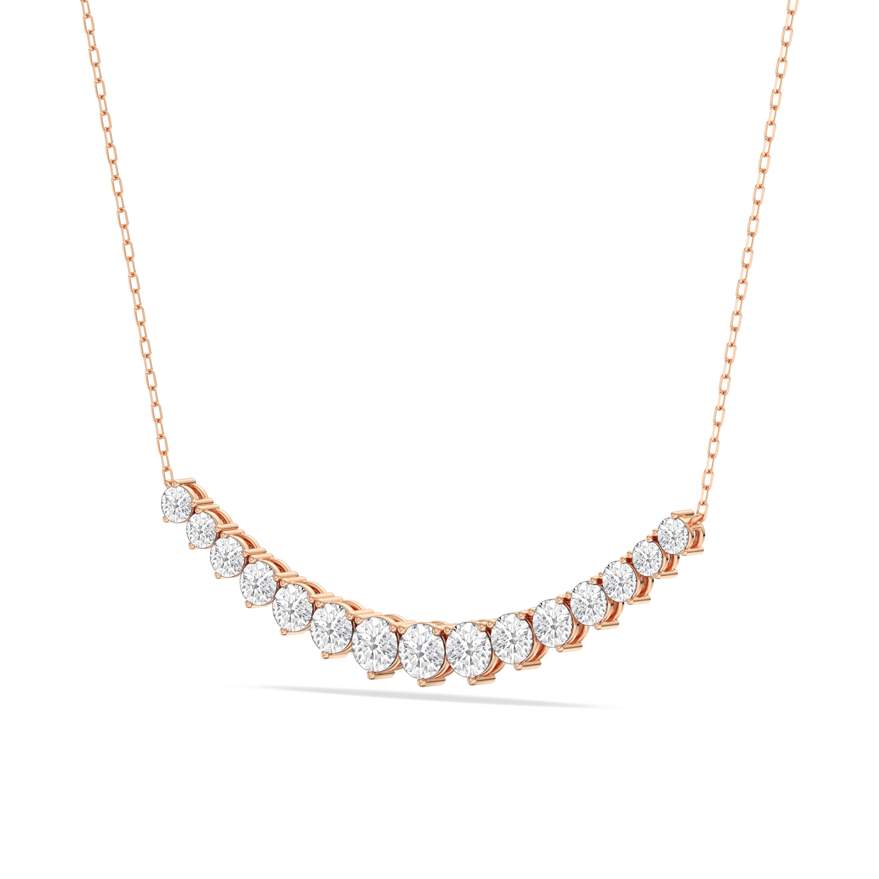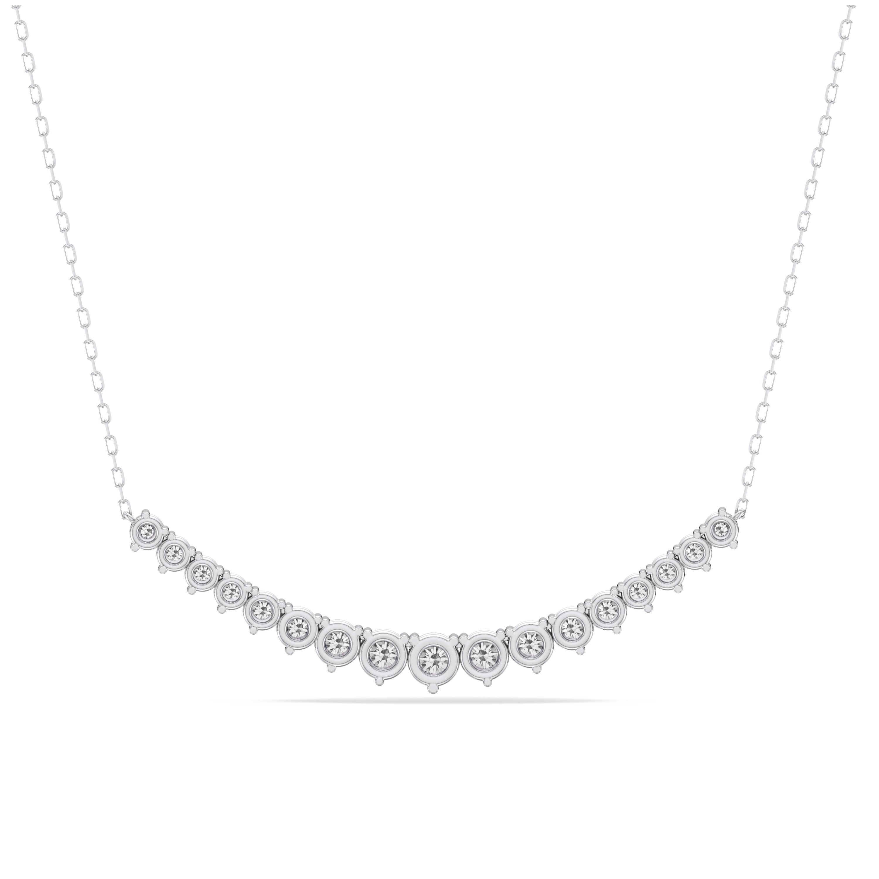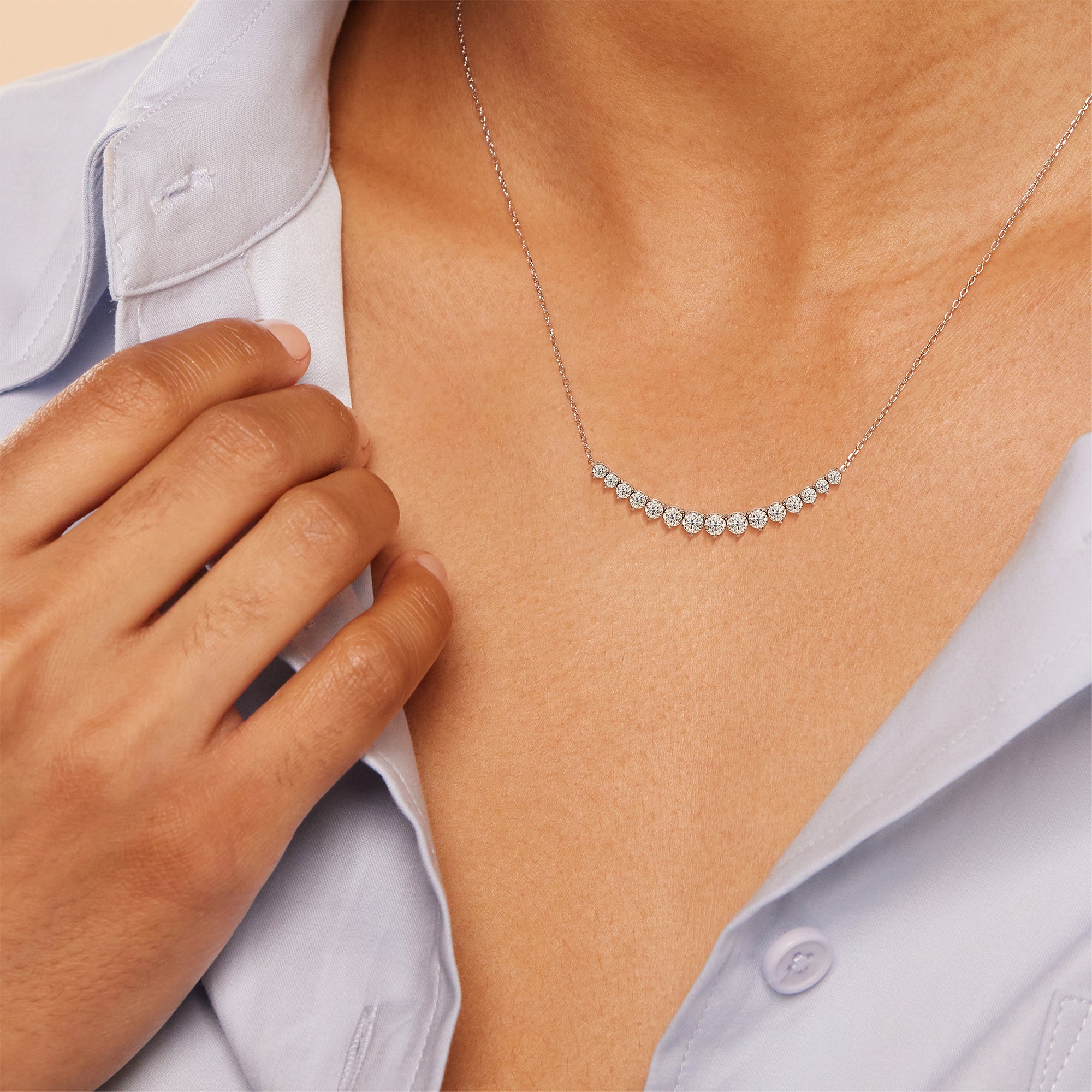 For a fresh take on the classic tennis necklace, consider this sparkling strand with diamonds on three prongs. This piece features a stylish chain link necklace adorned at the center with a gorgeous ribbon of round diamonds, each set on a three-prong basket. The triple prongs give each stone a triangular silhouette that delivers an edgy-elegant vibe.