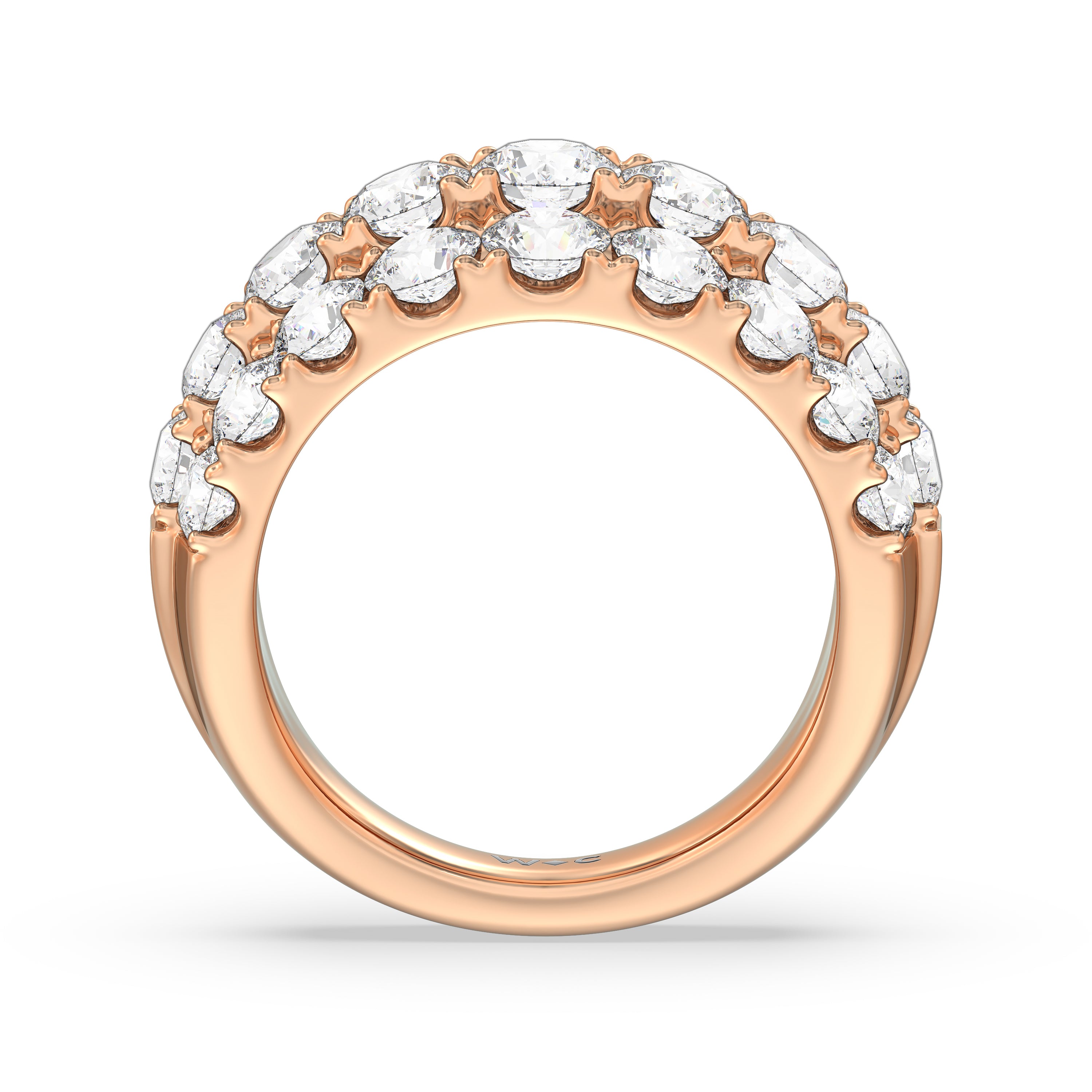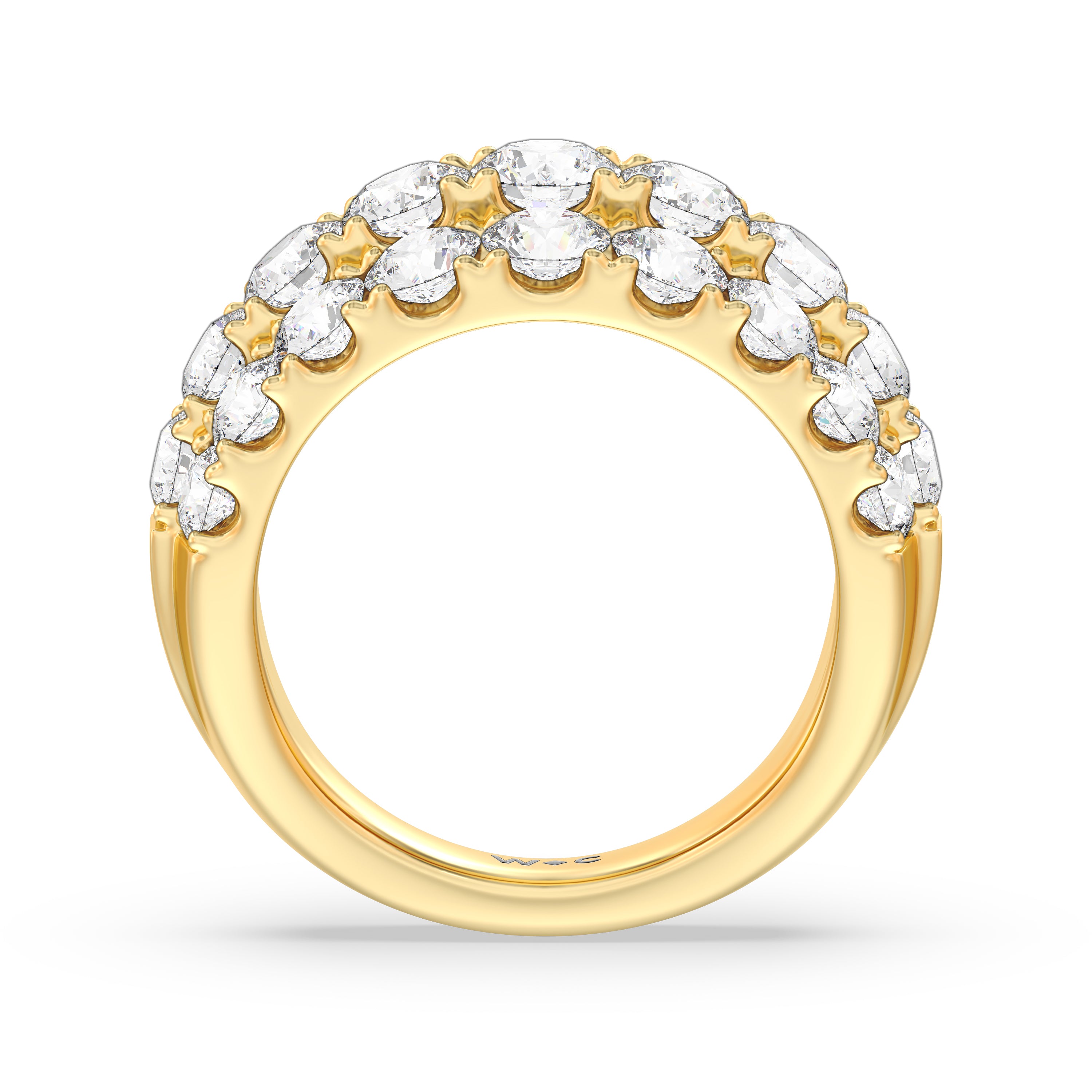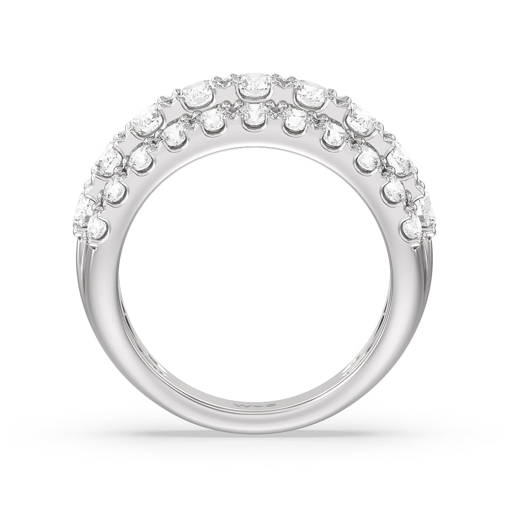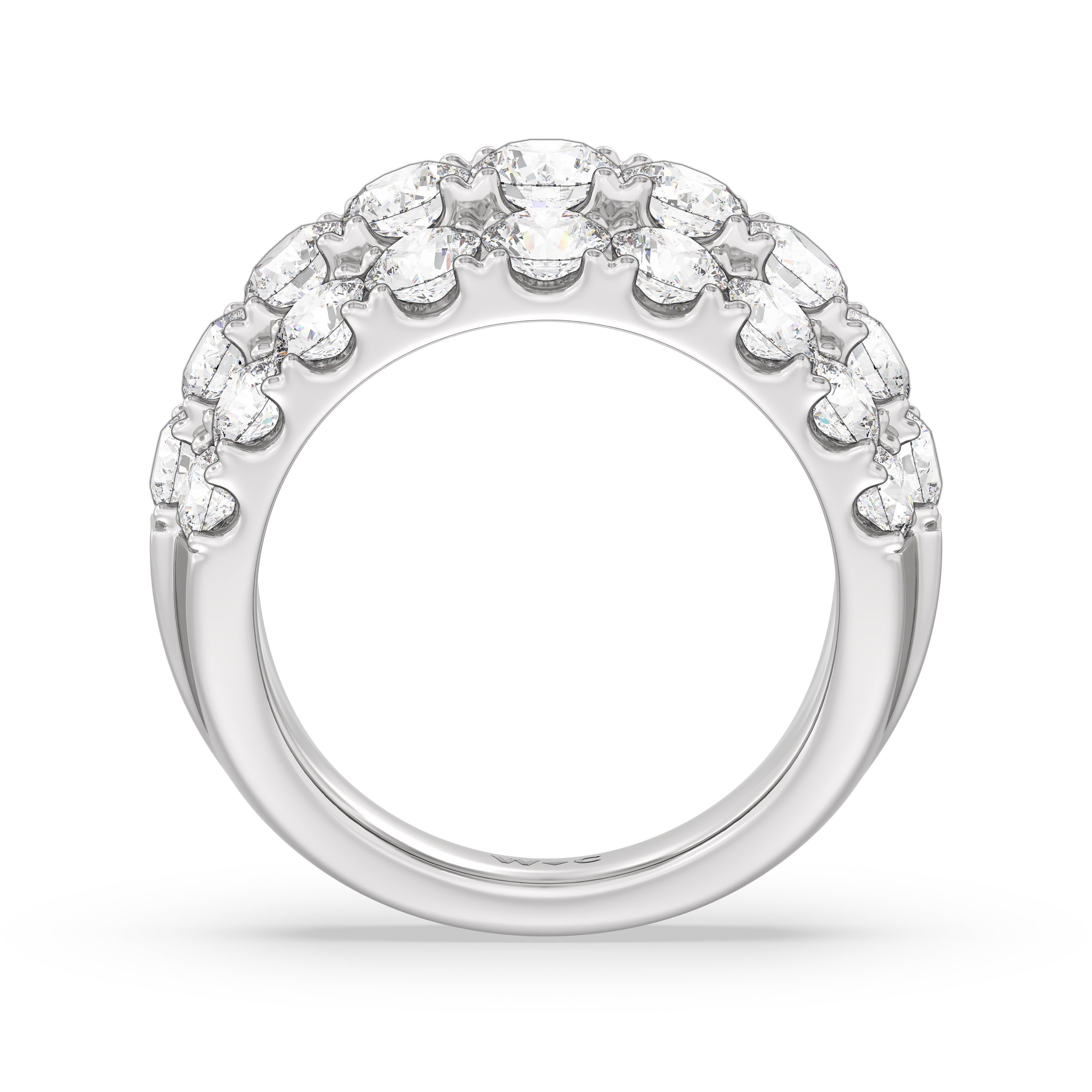 A striking sparkler for someone who prefers her ring to be bright and radiant without being ostentatious. This anniversary ring features a tapering band with a wide top to accommodate three rows of diamonds. The elevated central row of white and bright gemstones features slightly larger diamonds for added visual interest.