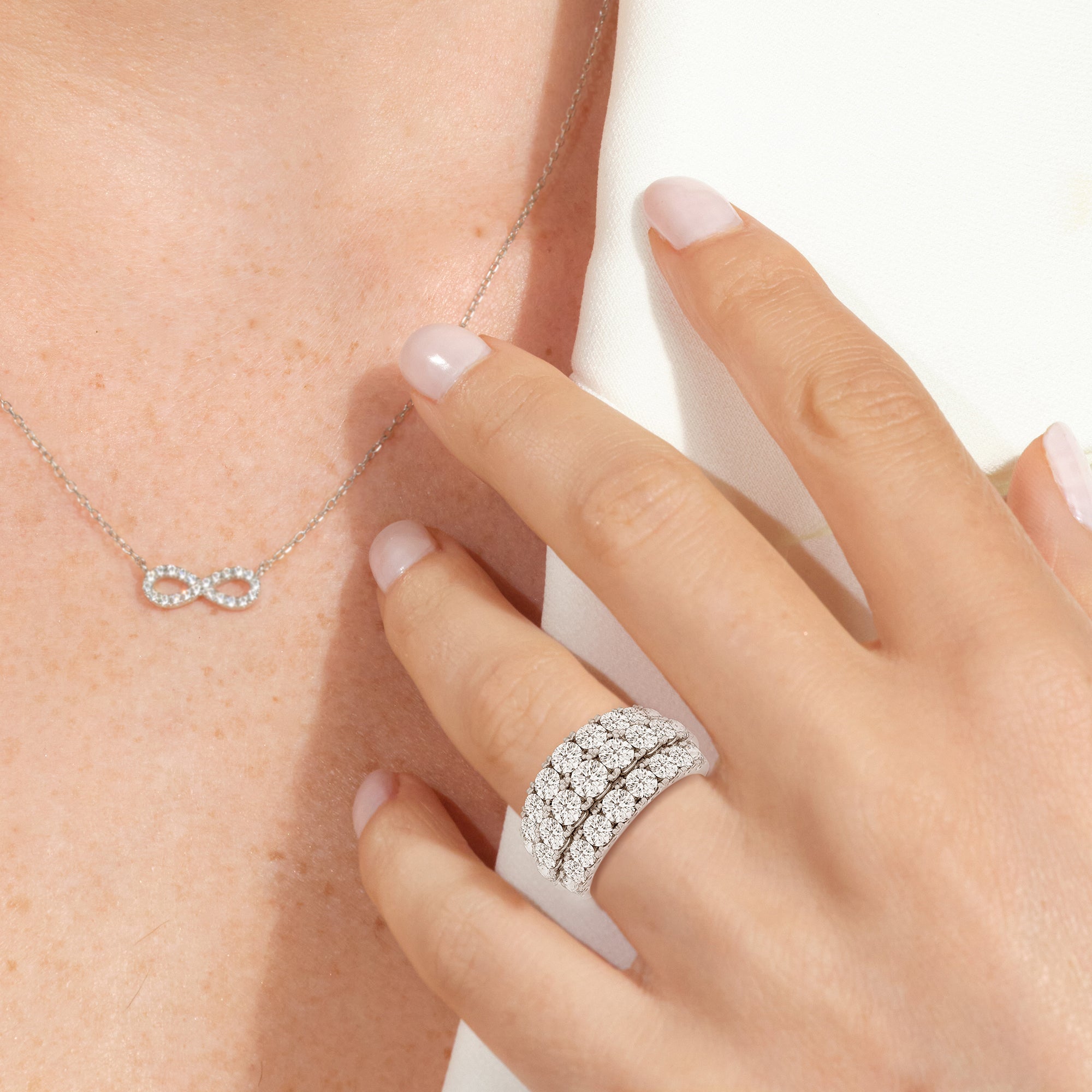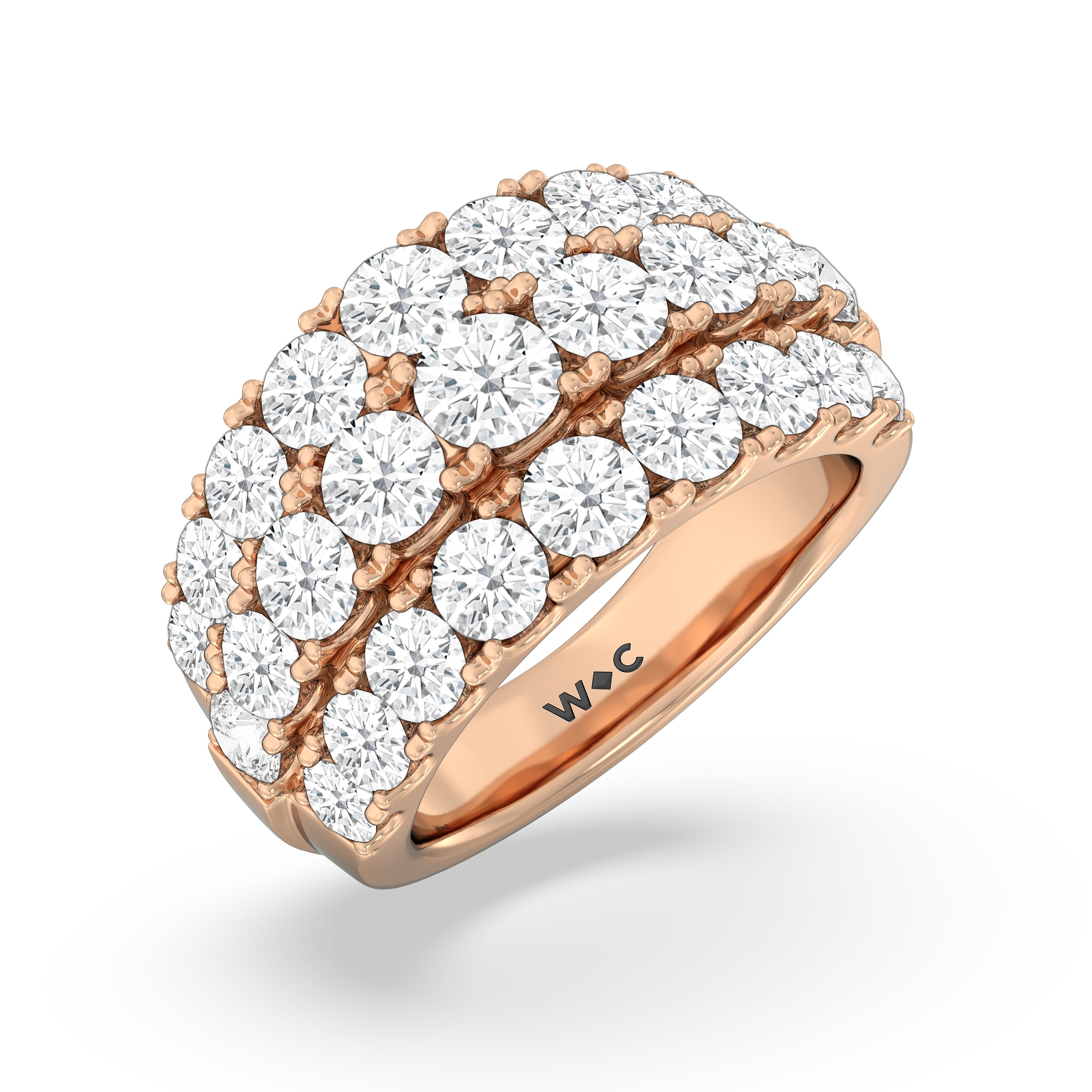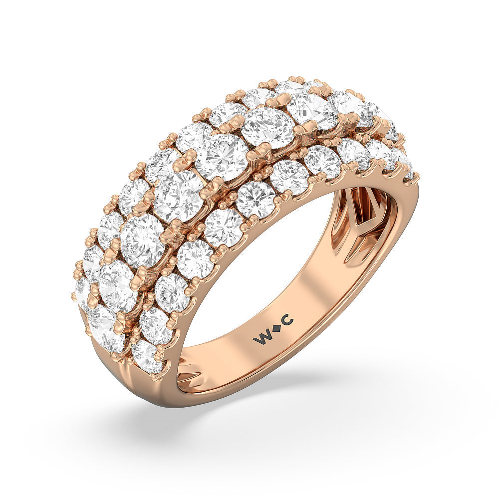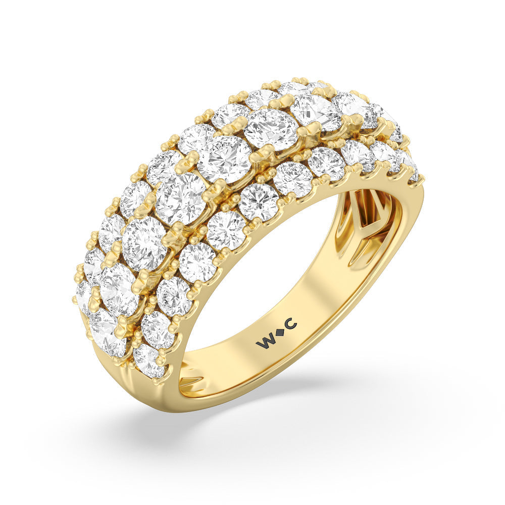 A striking sparkler for someone who prefers her ring to be bright and radiant without being ostentatious. This anniversary ring features a tapering band with a wide top to accommodate three rows of diamonds. The elevated central row of white and bright gemstones features slightly larger diamonds for added visual interest.
