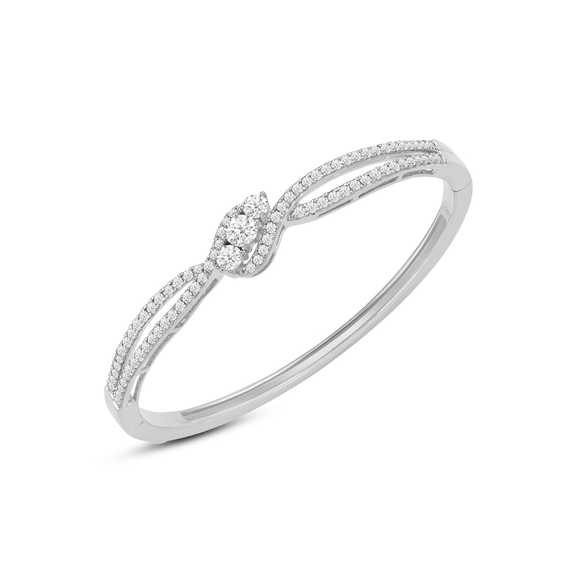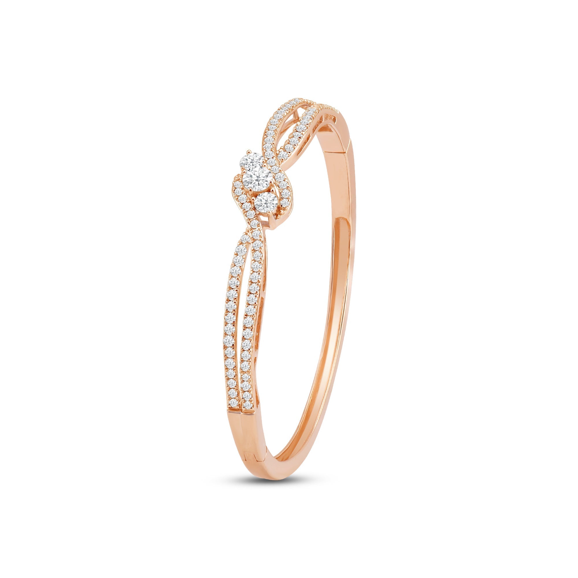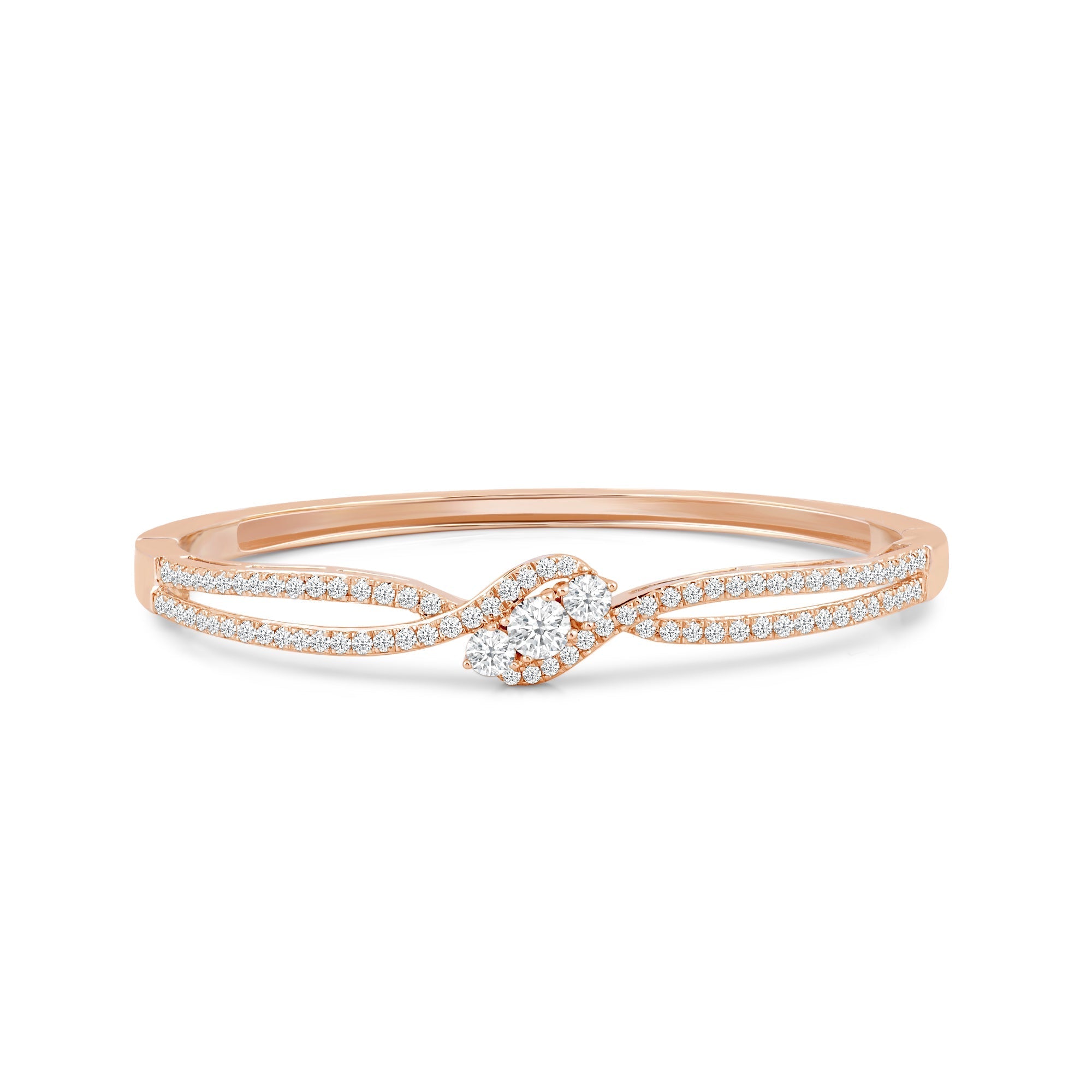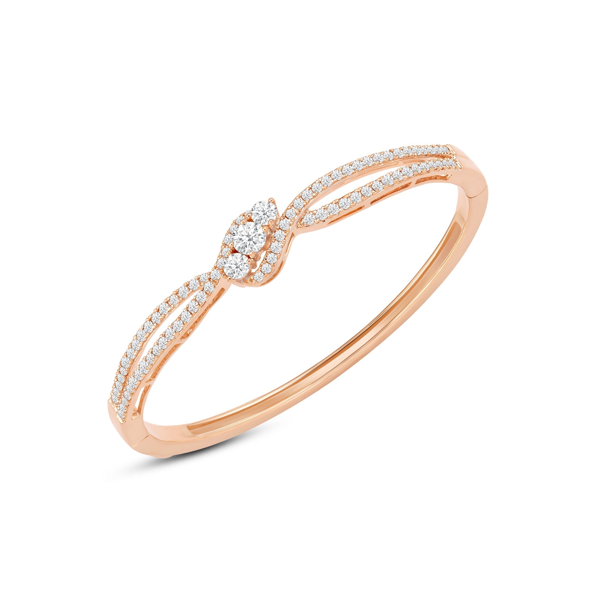 A sweet addition to your daily jewelry rotation. This rigid bracelet in rose gold features a smooth and polished half and a split-bypass other half elegantly traced with diamonds. Embraced by the parting and overlapping ribbons are three central gems with a brilliant white sparkle.