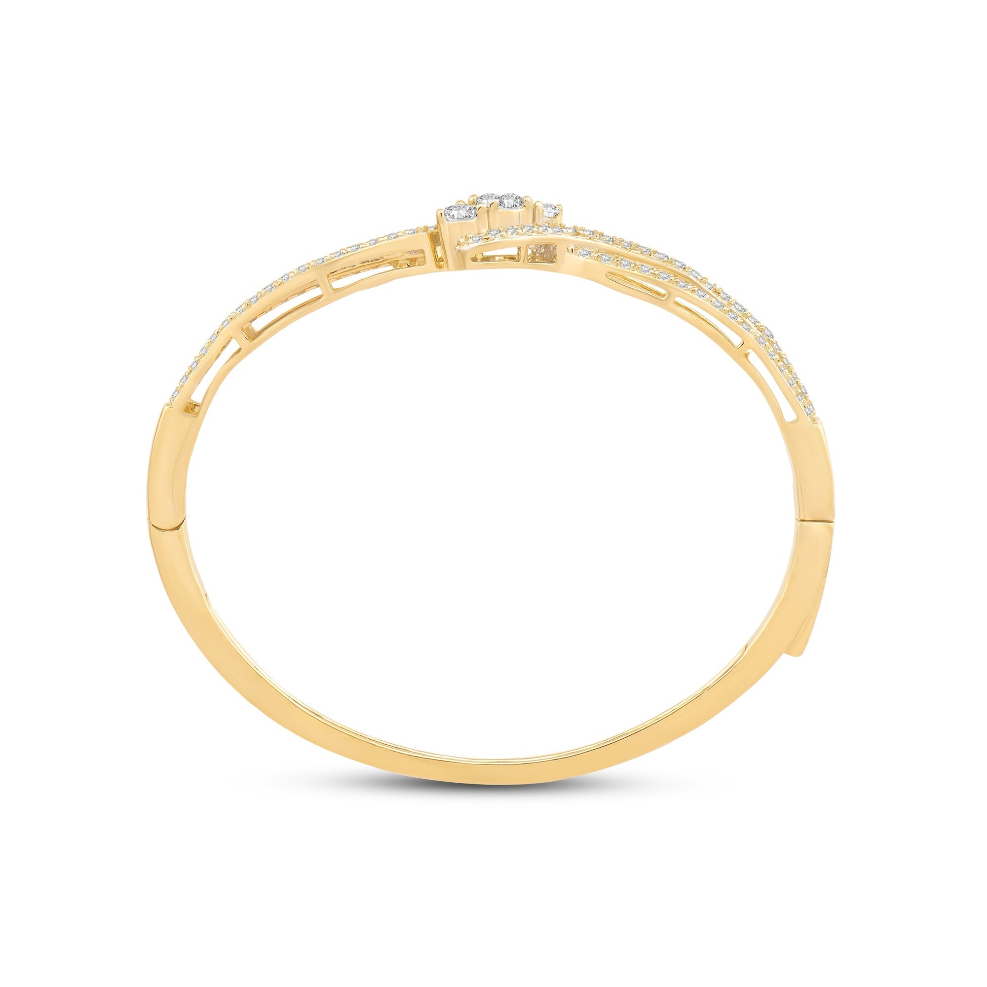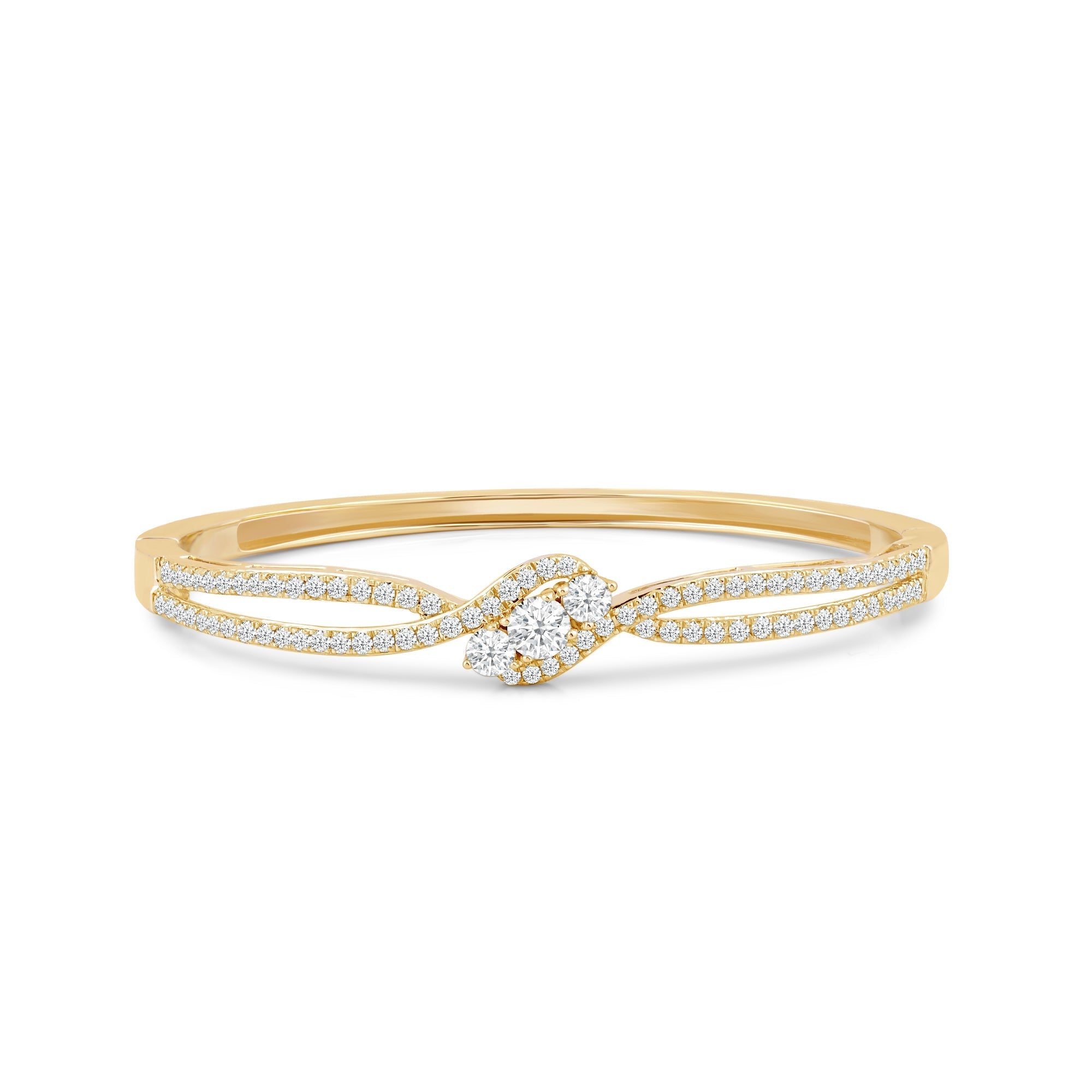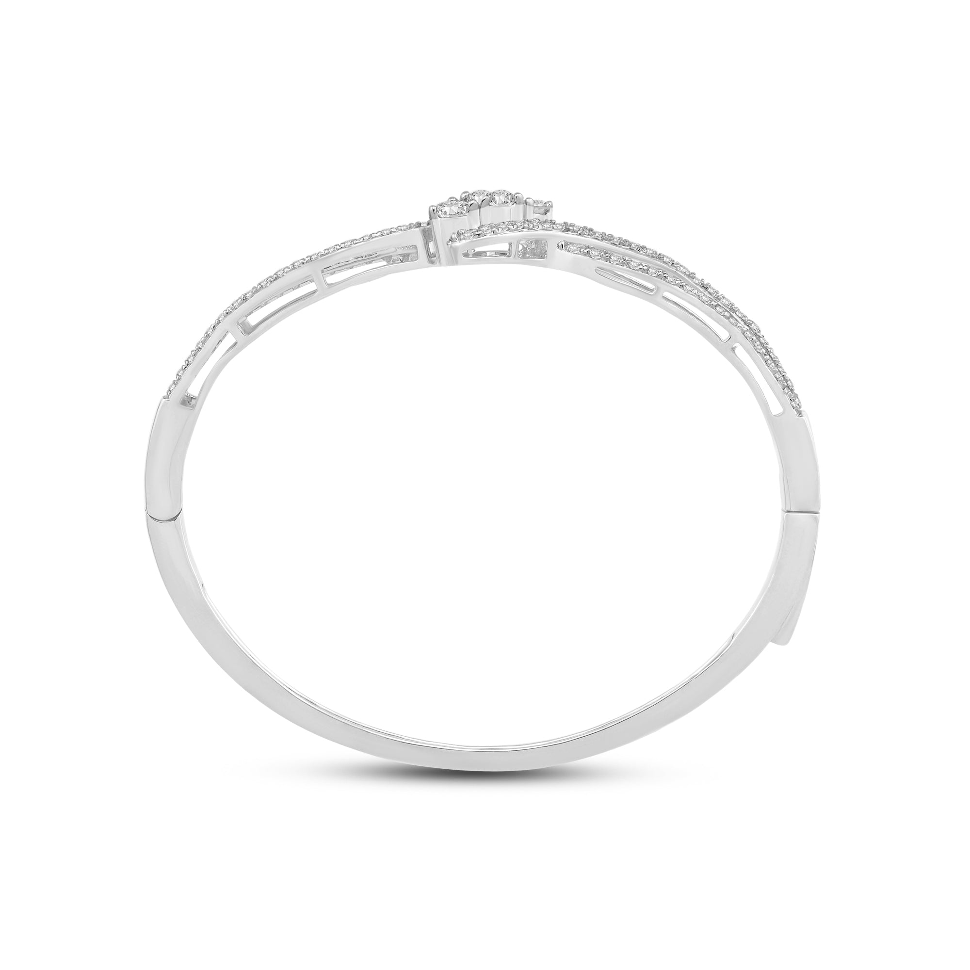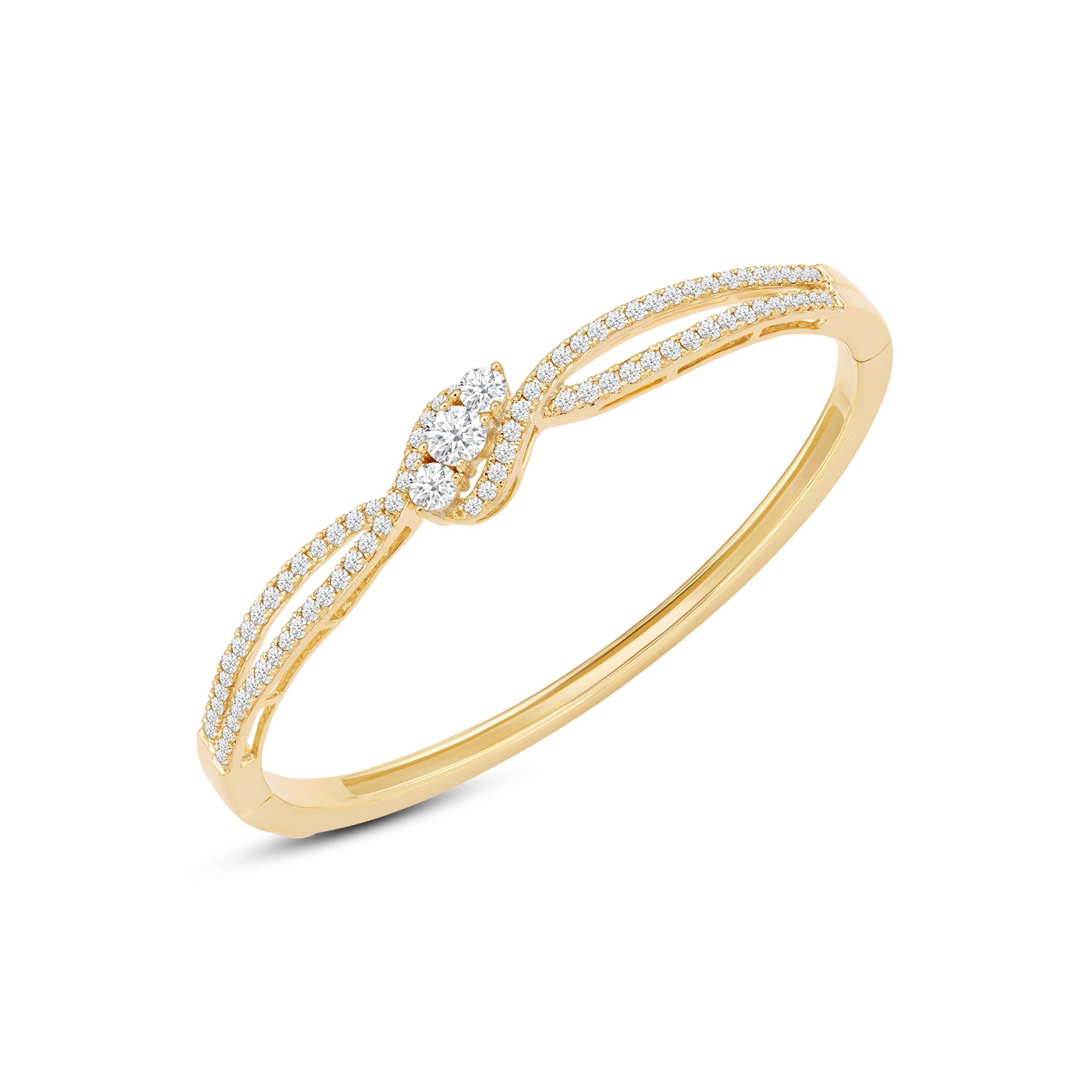 A sweet addition to your daily jewelry rotation. This rigid bracelet in rose gold features a smooth and polished half and a split-bypass other half elegantly traced with diamonds. Embraced by the parting and overlapping ribbons are three central gems with a brilliant white sparkle.