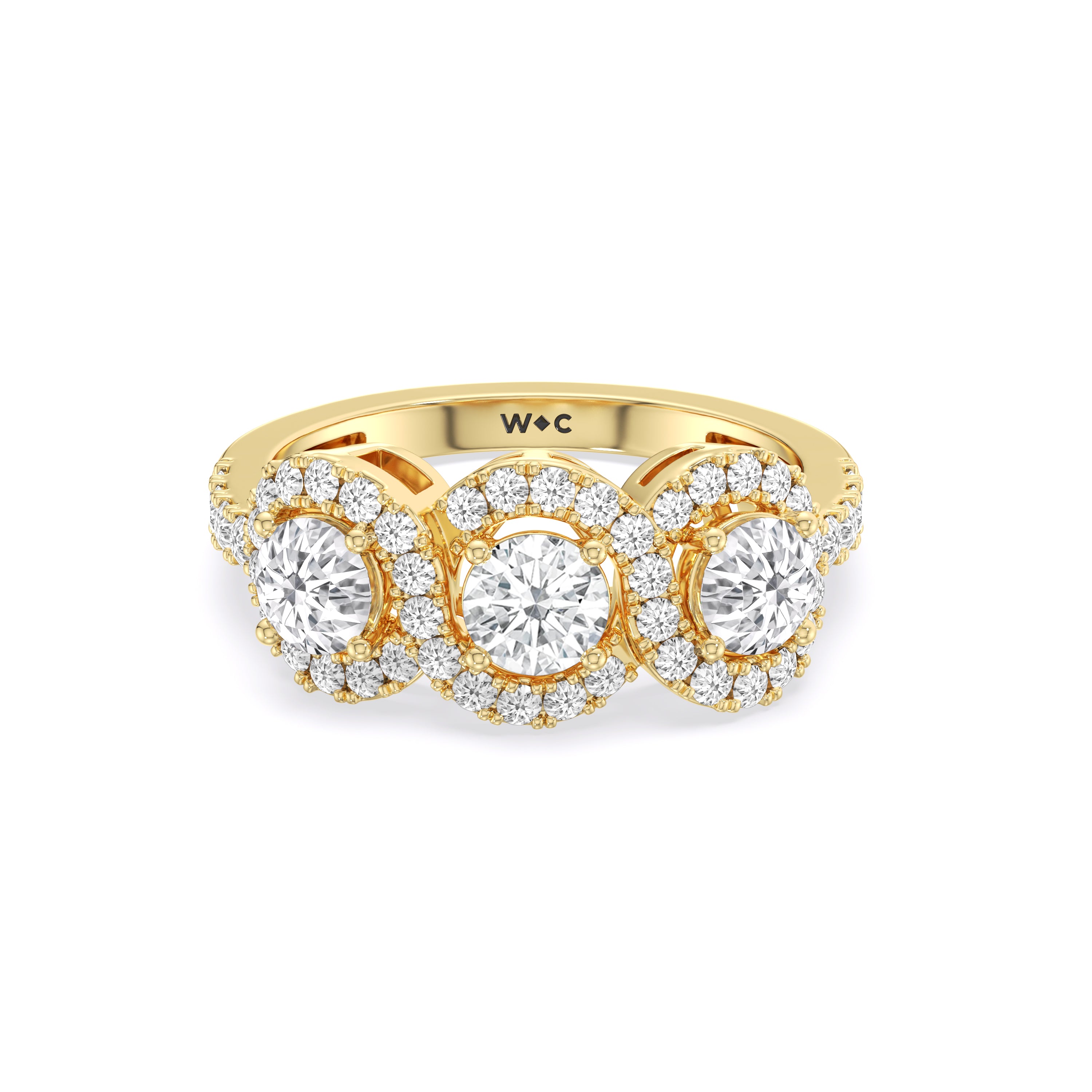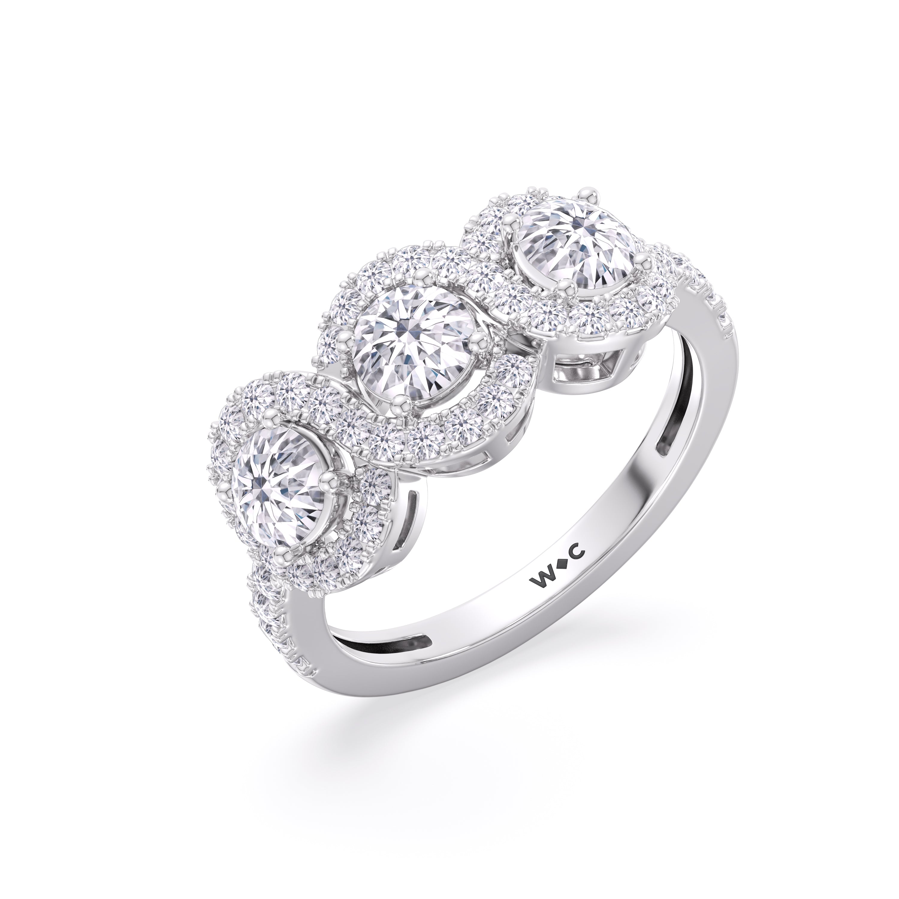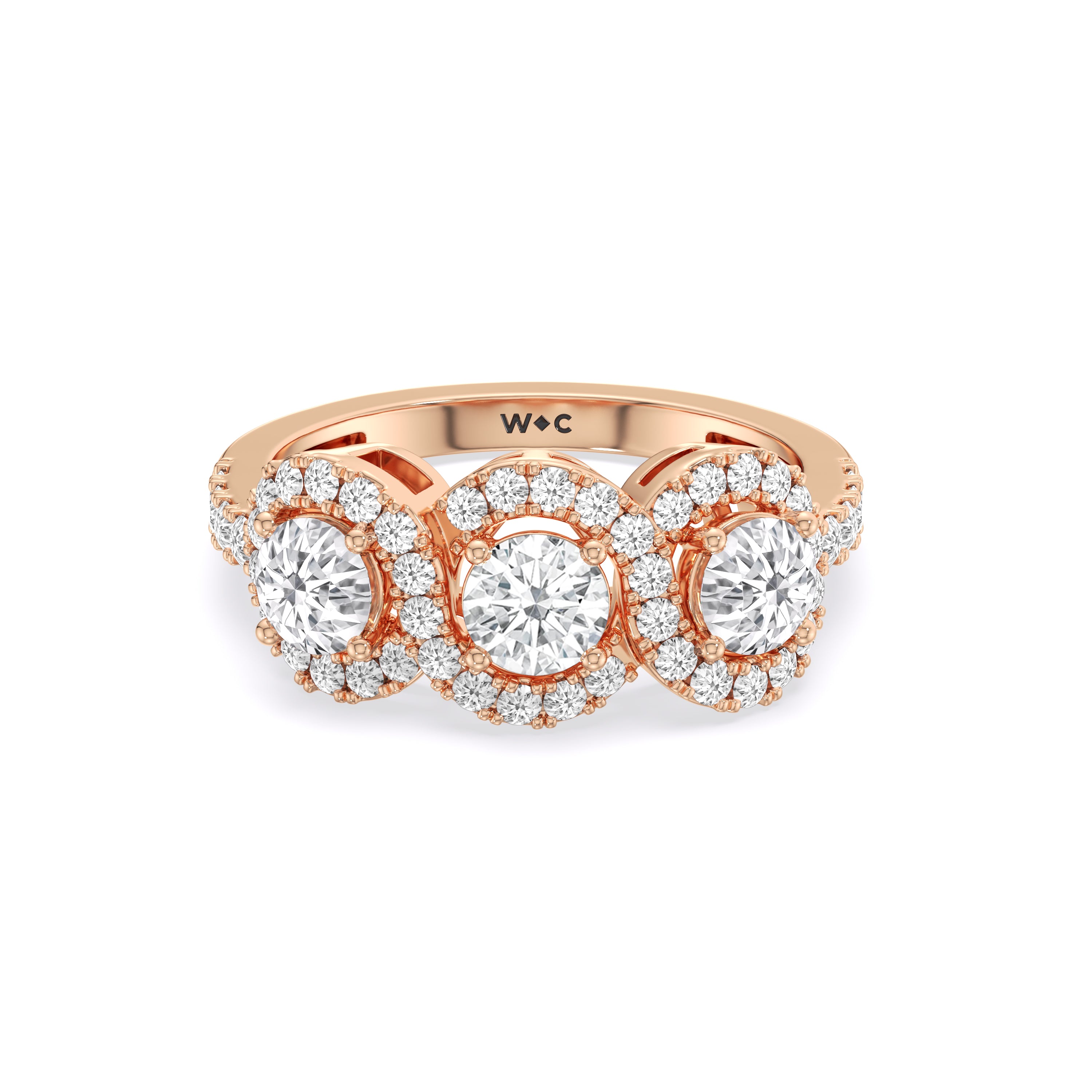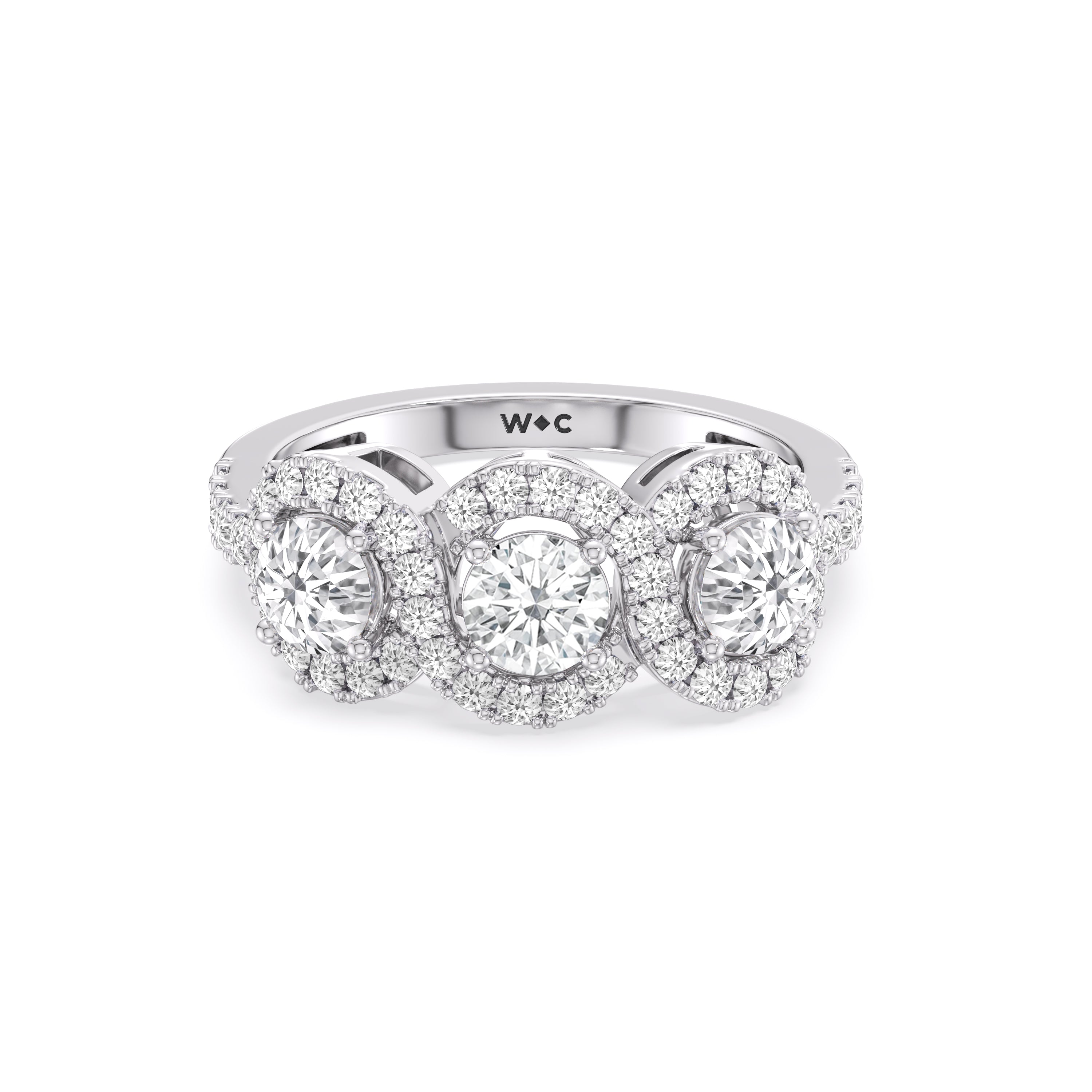 The classic elegance of this three-stone crossover ring can't be denied. It features three central stones surrounded by interconnected swirling halos of smaller round diamonds. A ring as sparkly as this is bound to turn heads wherever you bring it to.