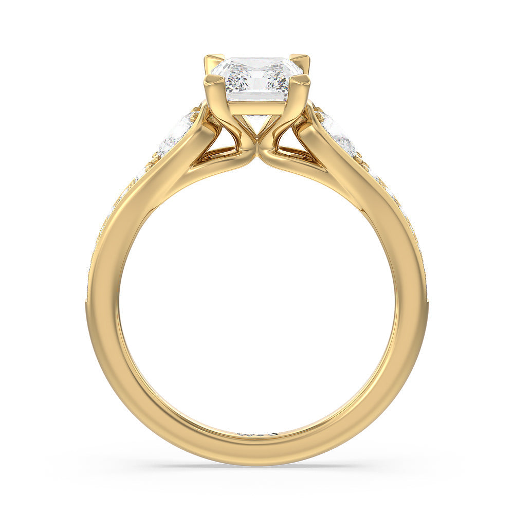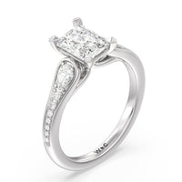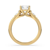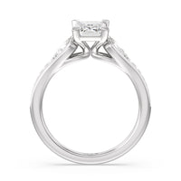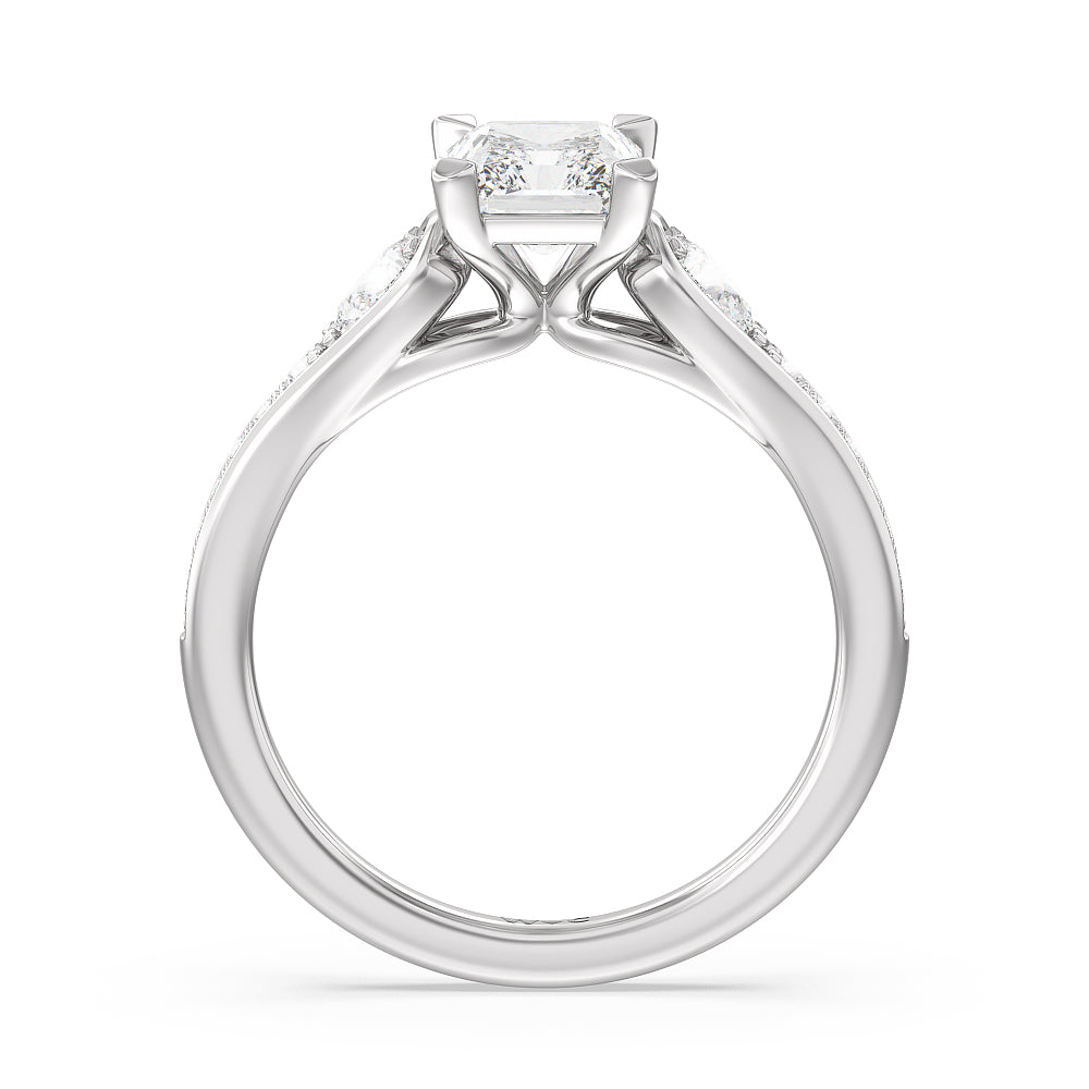 Exuding modern elegance, this diamond engagement ring will put your bride-to-be ahead of the style game. This alluring piece features a prong-set central diamond adorned on each side with a smaller diamond side stone for that chic three-stone-ring look. More glistening diamonds line the band's shoulders for an extra bit of sparkle and glam.