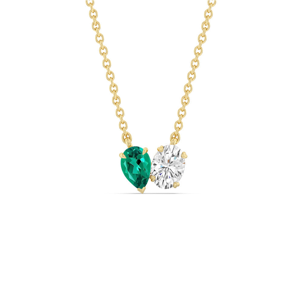Here is a Colorful pendant you can wear on countless occasions. This two-stone beauty features a pear-cut Created Emerald and an oval-cut diamond on individual pronged basket setting. They sit beside each other, with their own bails, radiating their brilliance individually and together.
