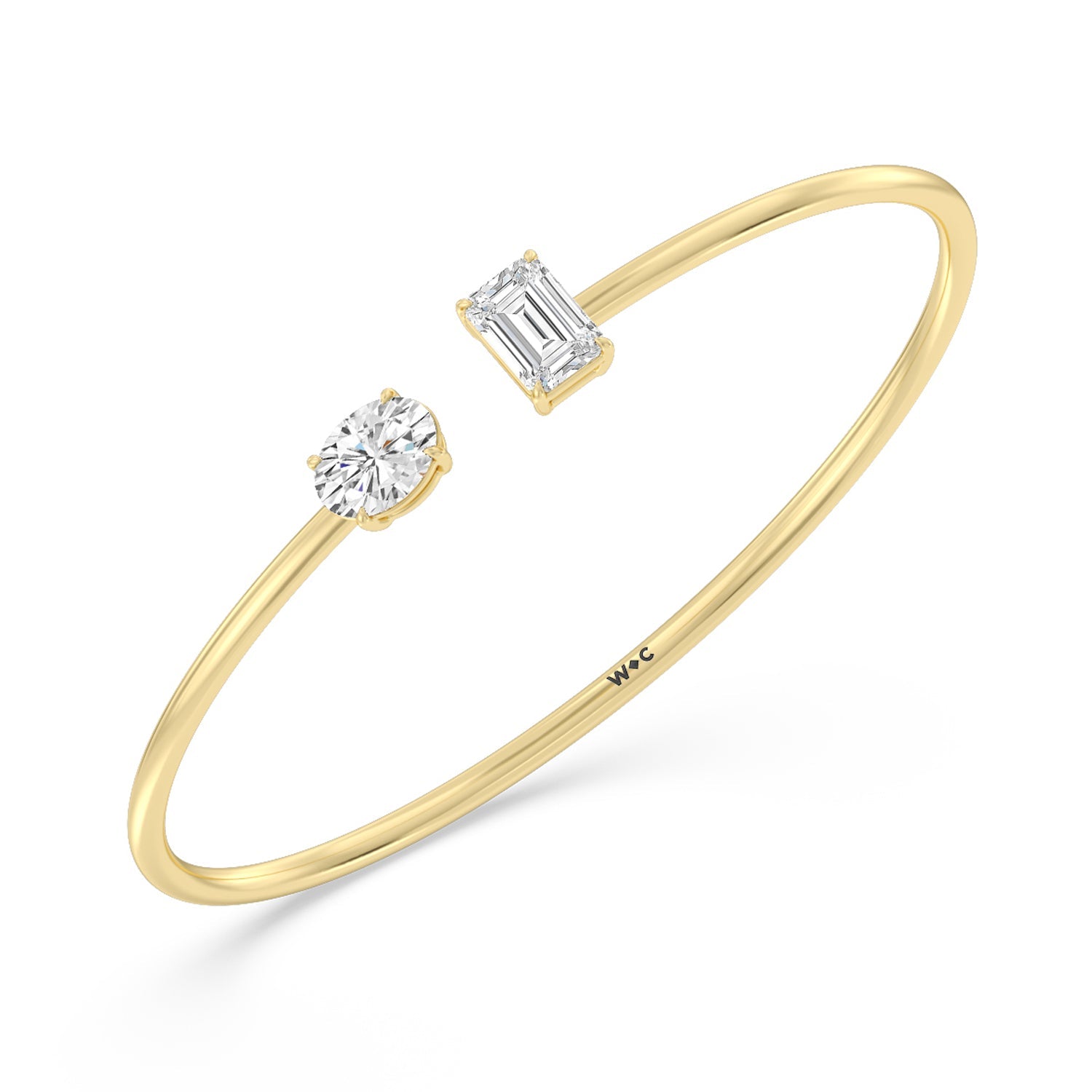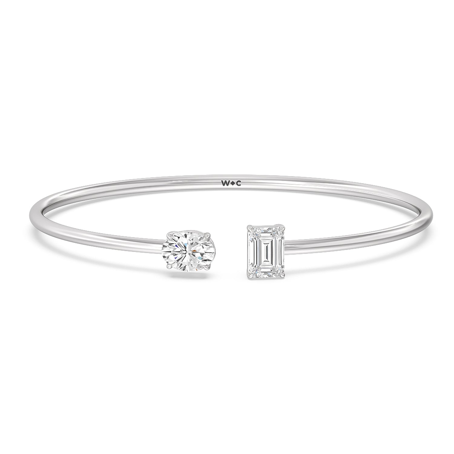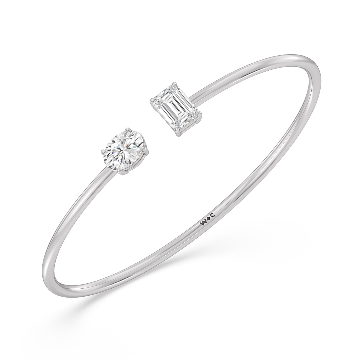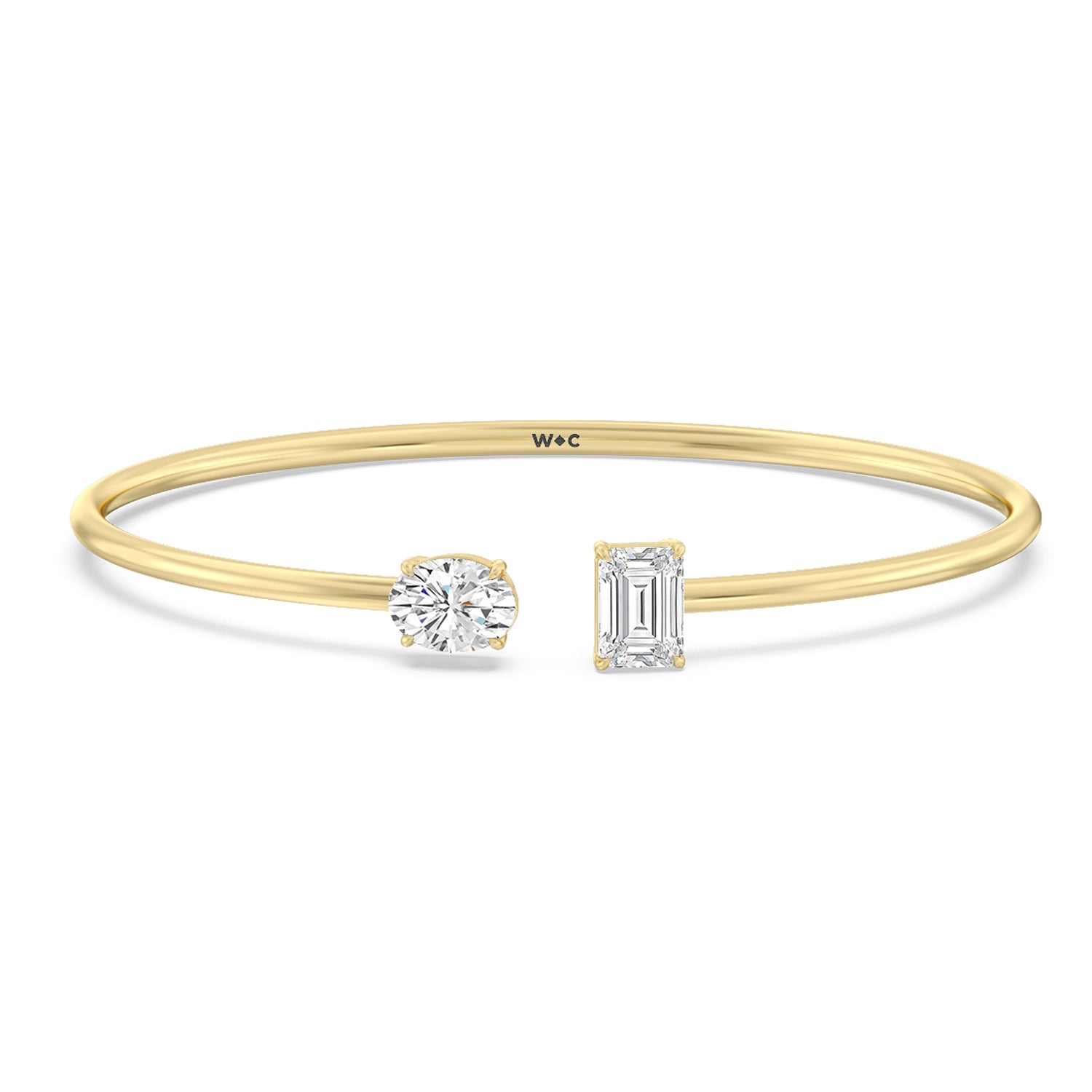 Easy to wear, easy to pair, easy to layer - just what you want in a piece of everyday jewelry. This diamond bangle is so suitable for frequent or daily wear. It features a rigid bracelet that's easy to put on and take off. The open-style bangle has its two ends punctuated by an oval diamond and an emerald-cut diamond for a subtle hint of glitter.