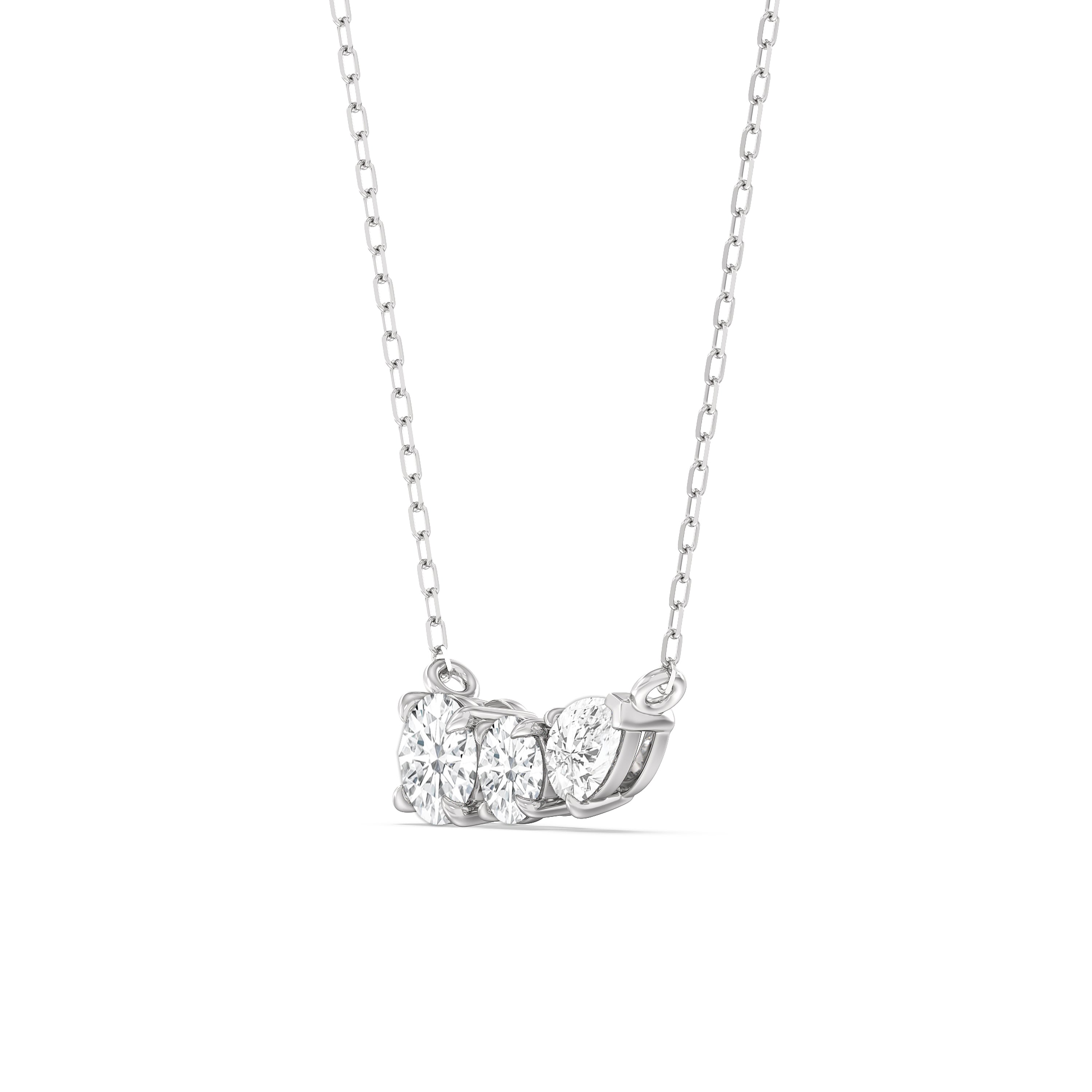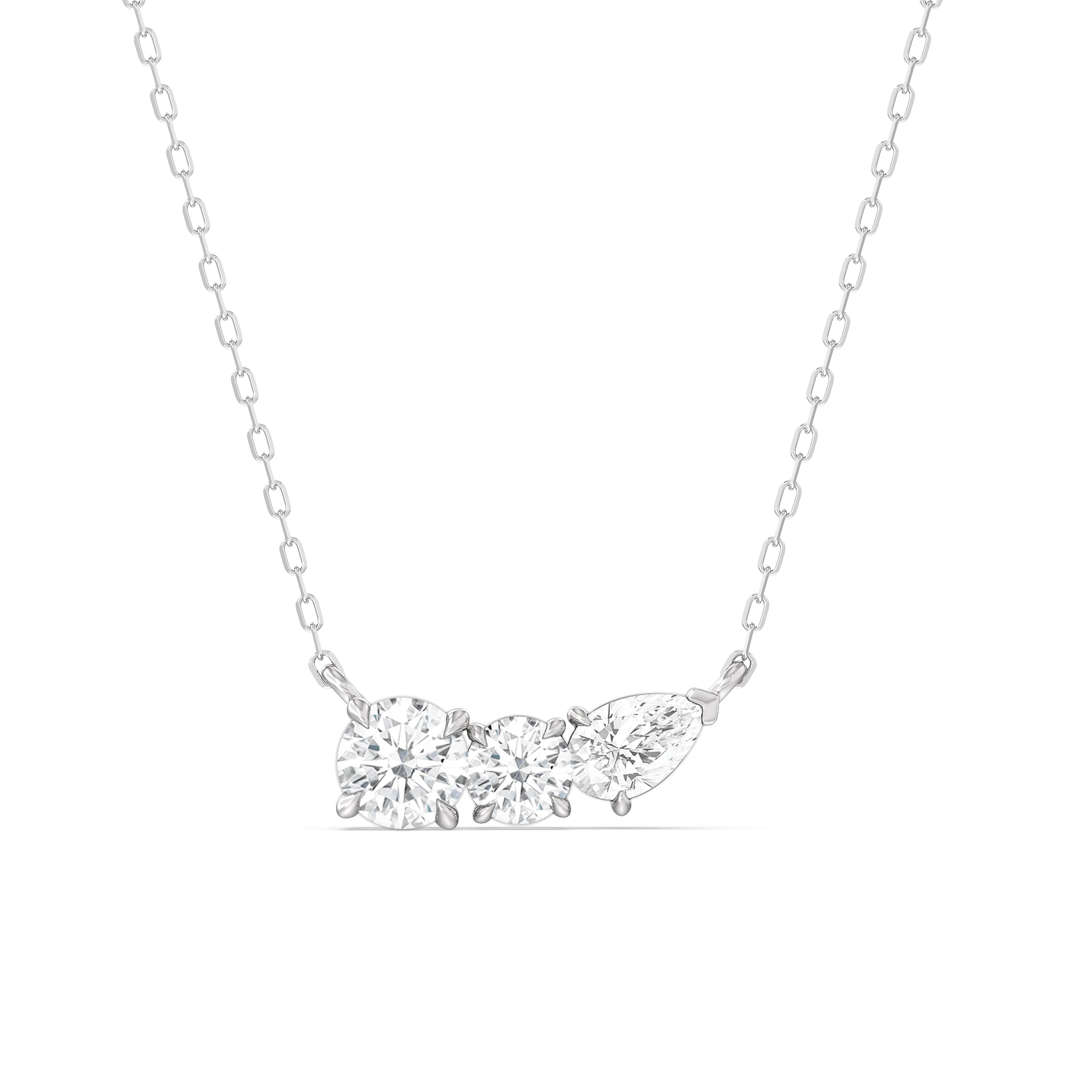 Exuding casual confidence, this diamond cluster necklace makes an ideal everyday accessory. It features three diamonds: a 0.75 ct round diamond, a smaller 0.375 ct round diamond, and a 0.375 ct pear diamond forming a slightly curving row. With its subtle elegance, it's bound to become a mainstay in your daily jewelry rotation.