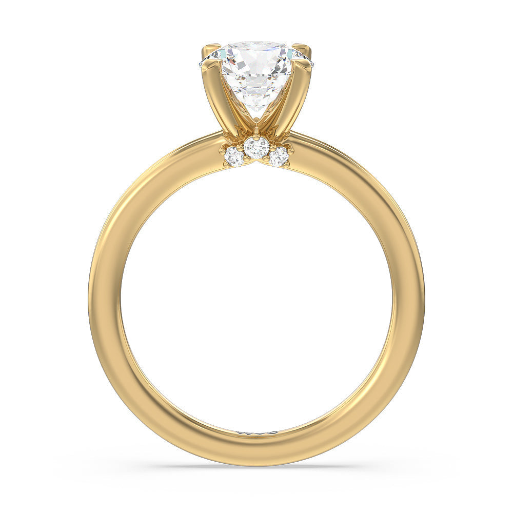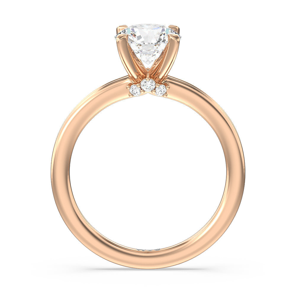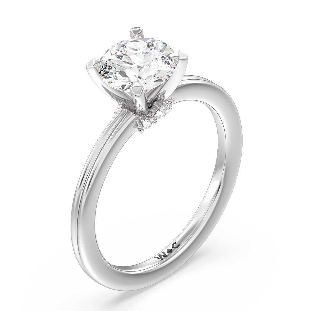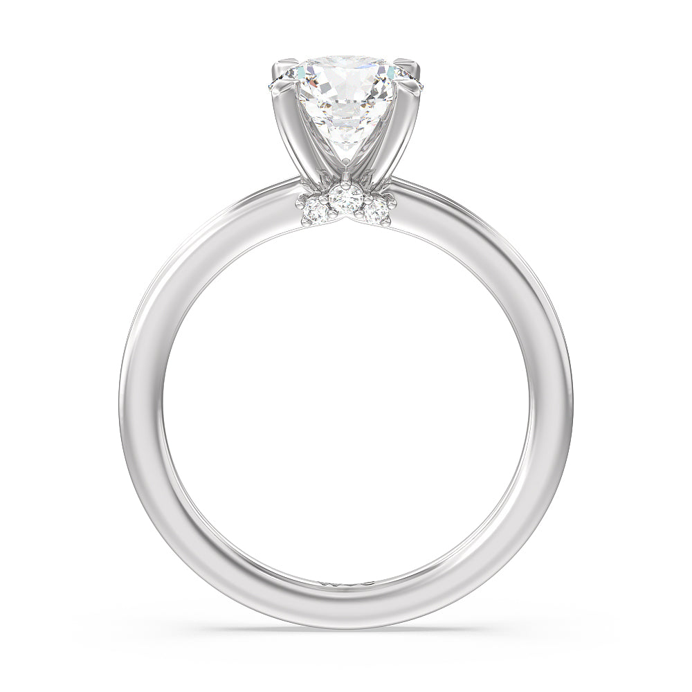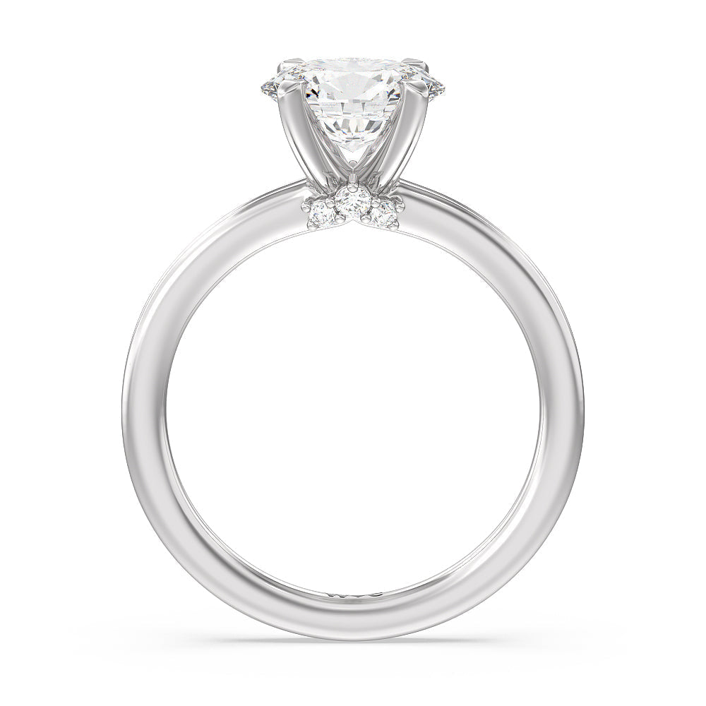 A simple classic, modernized with a slim line band featuring a subtle dip, along with a delicate V of 3 diamonds at the base of the gallery and signature claw details.