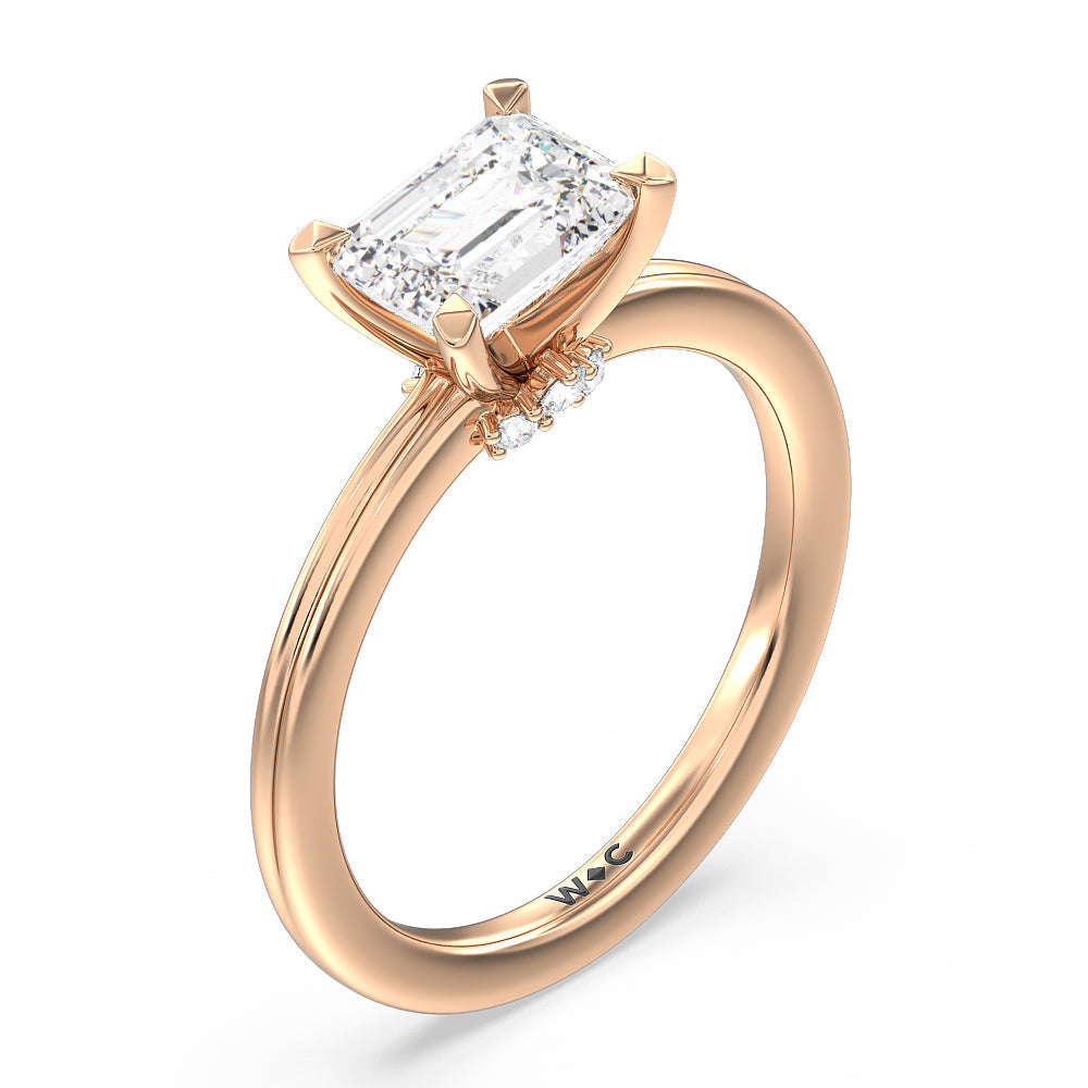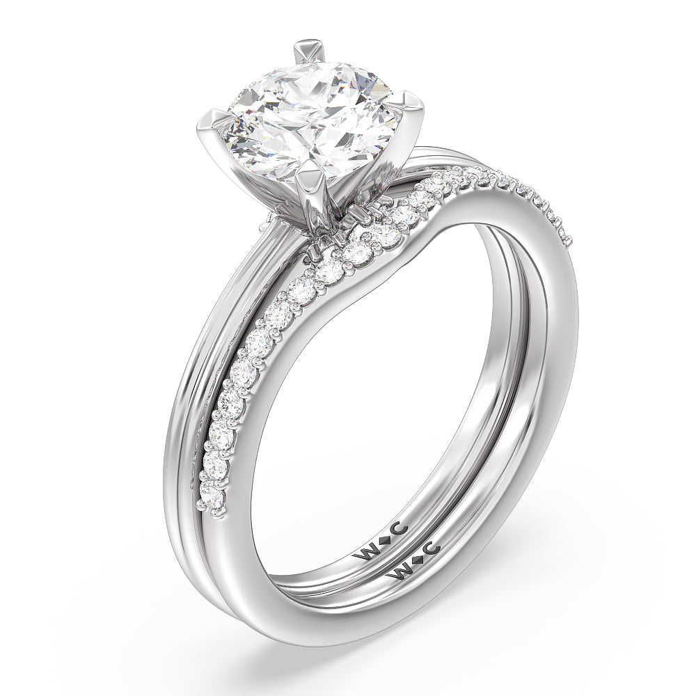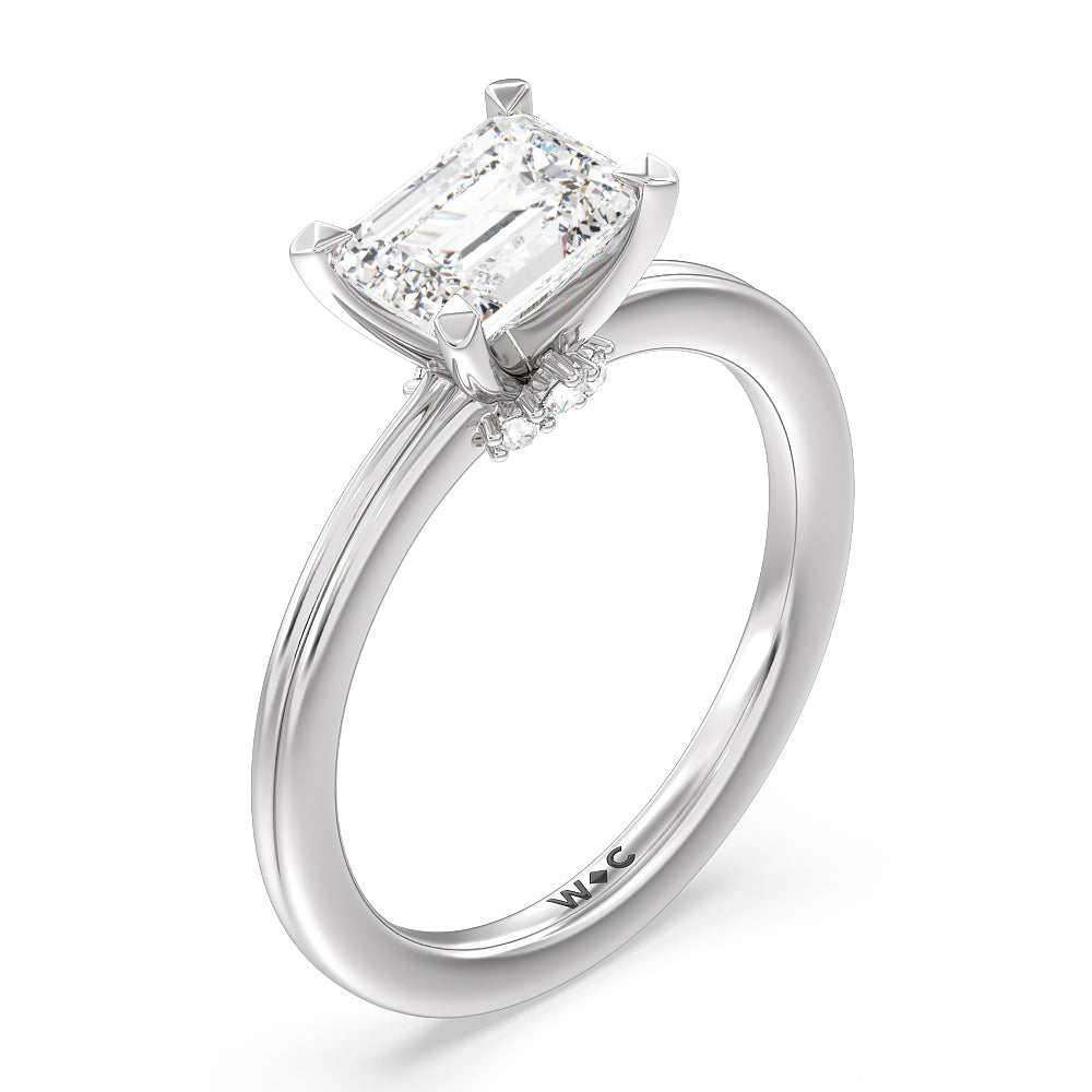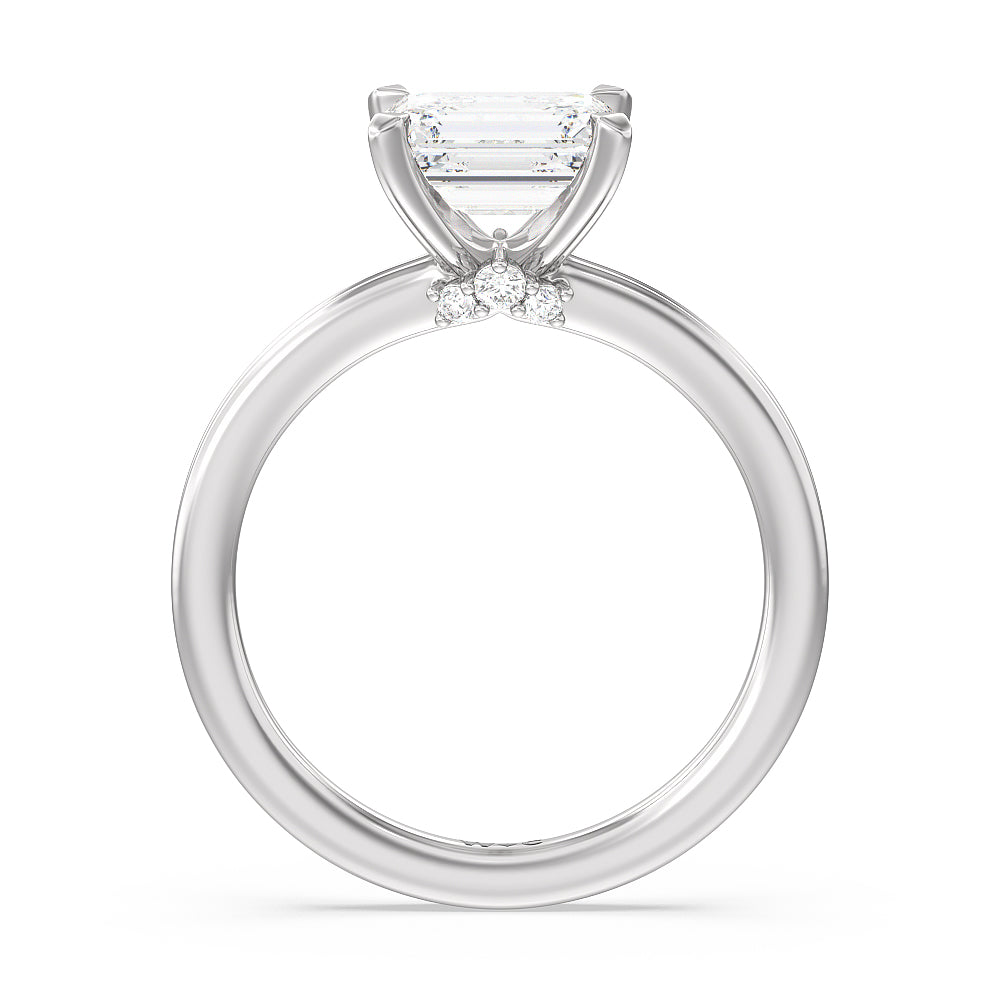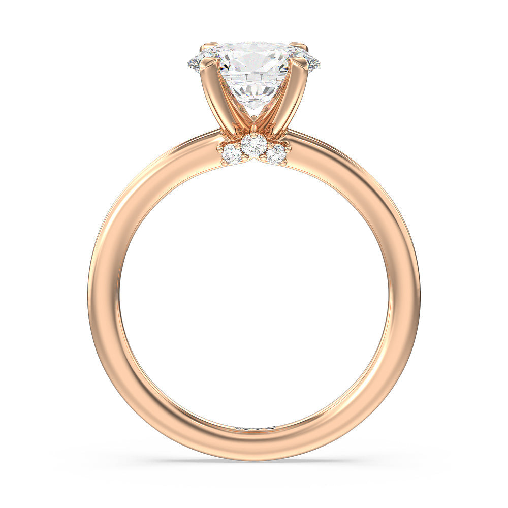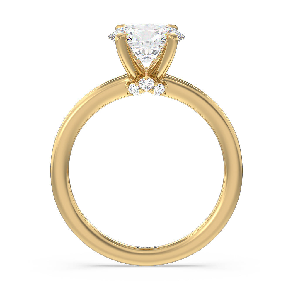 A simple classic, modernized with a slim line band featuring a subtle dip, along with a delicate V of 3 diamonds at the base of the gallery and signature claw details.