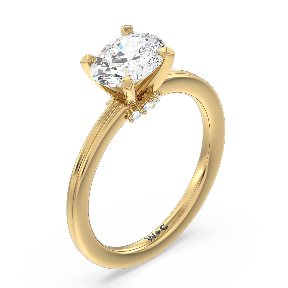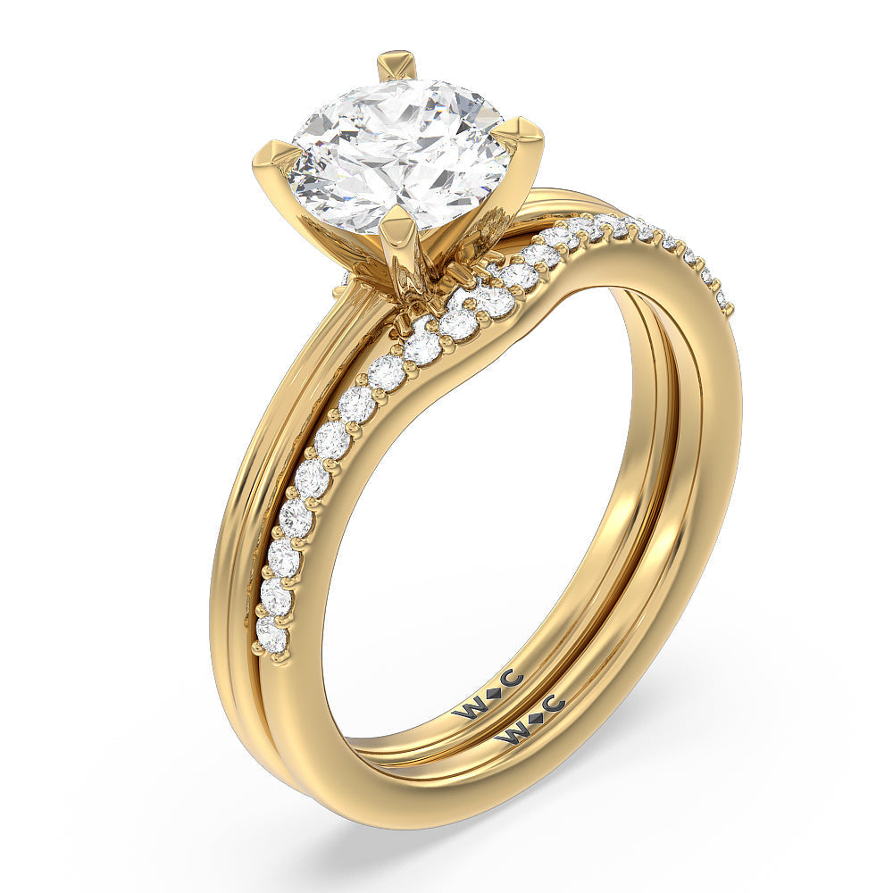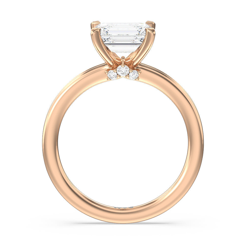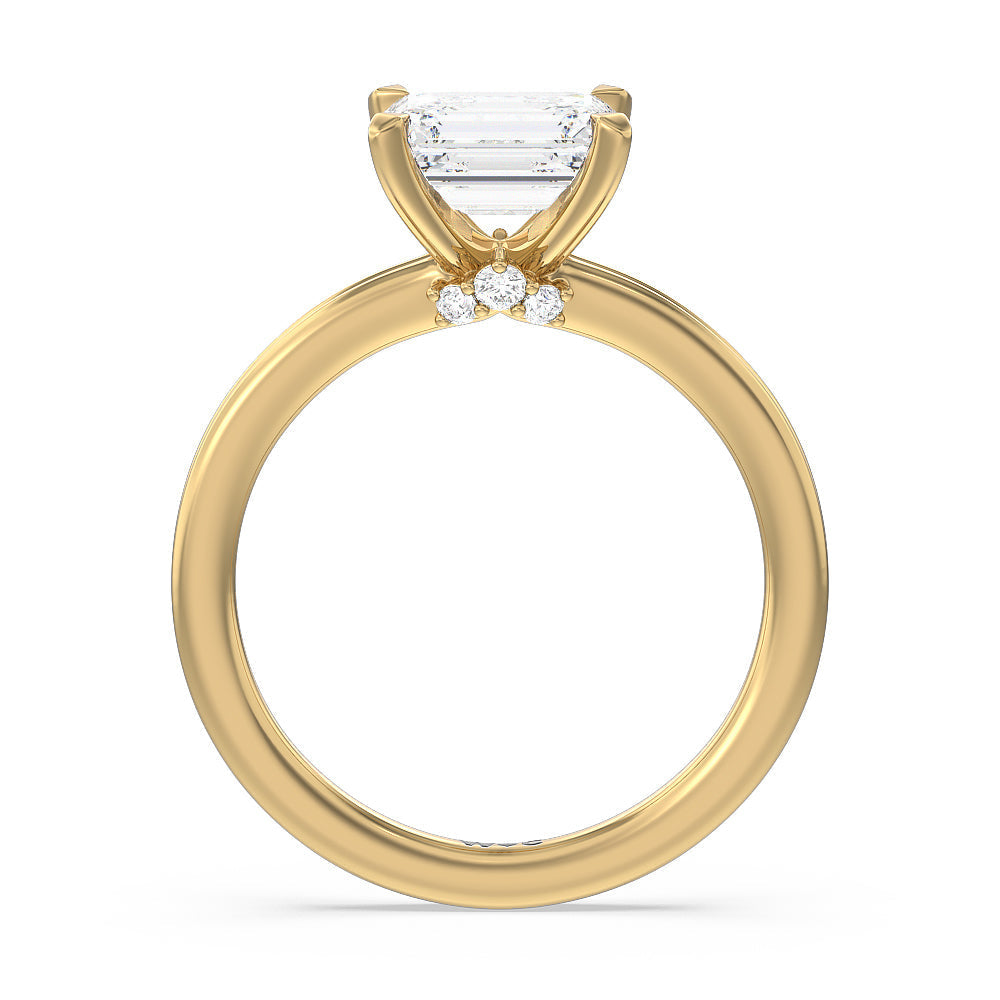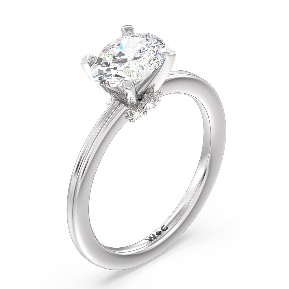 A simple classic, modernized with a slim line band featuring a subtle dip, along with a delicate V of 3 diamonds at the base of the gallery and signature claw details.