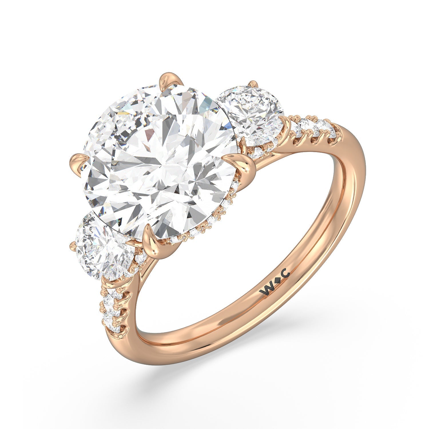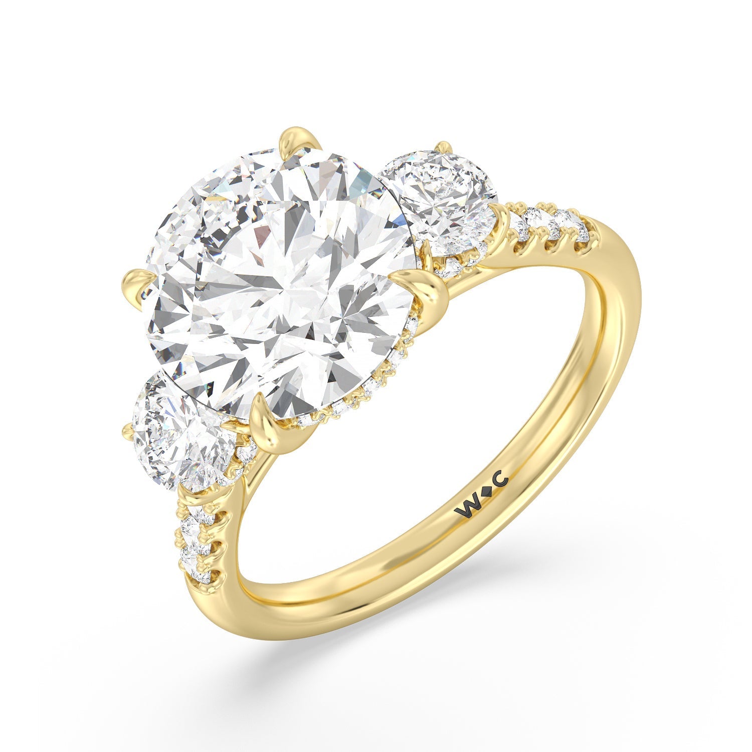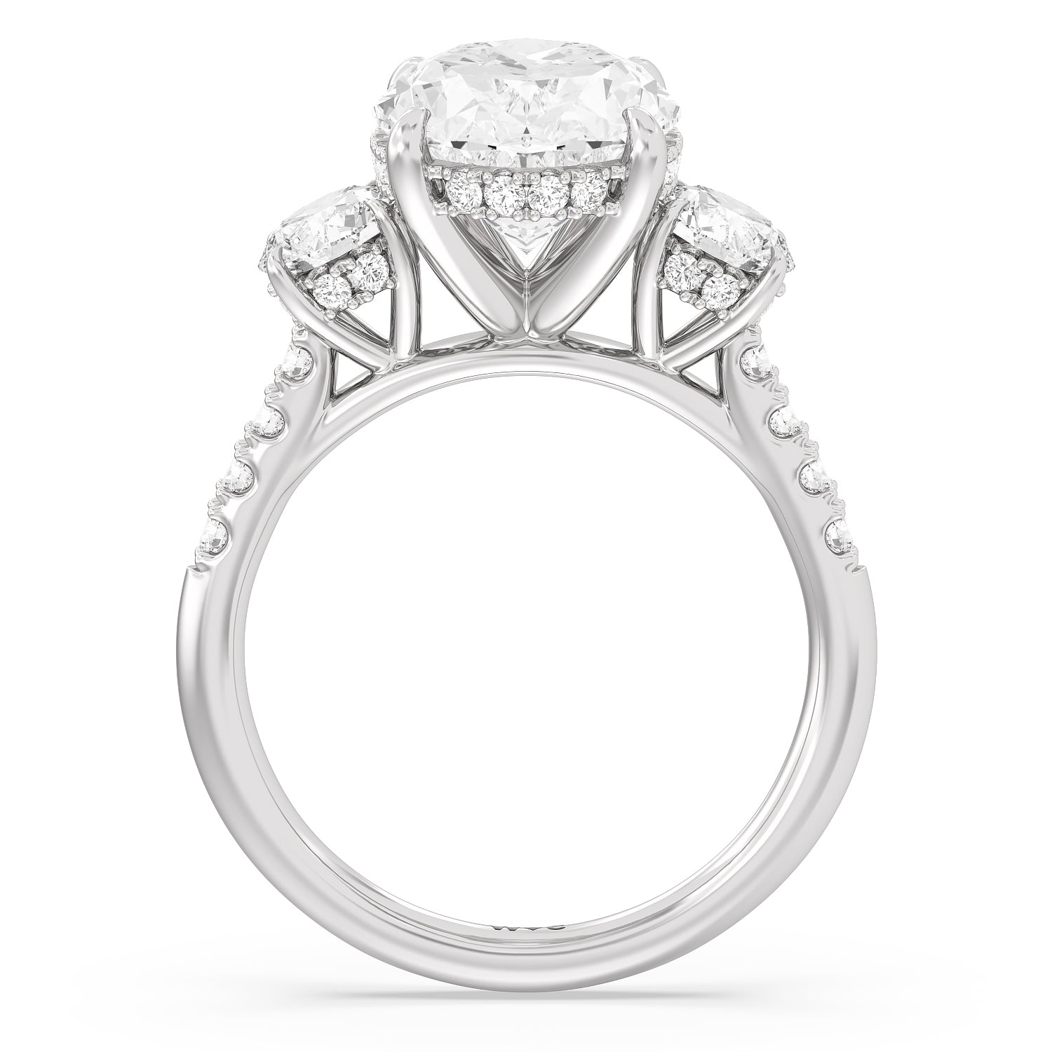 Beautiful, romantic, and meaningful. This three-stone engagement ring impresses with its spectacular 5-carat diamond center stone sitting in between diamond side stones, each weighing 0.5-carats. Each of the three stones features a hidden halo. The band's gracefully arching shoulders are also traced with diamonds. A symbol of your love story's past, present, and future, this tri-stone engagement ring truly is a visual treat.