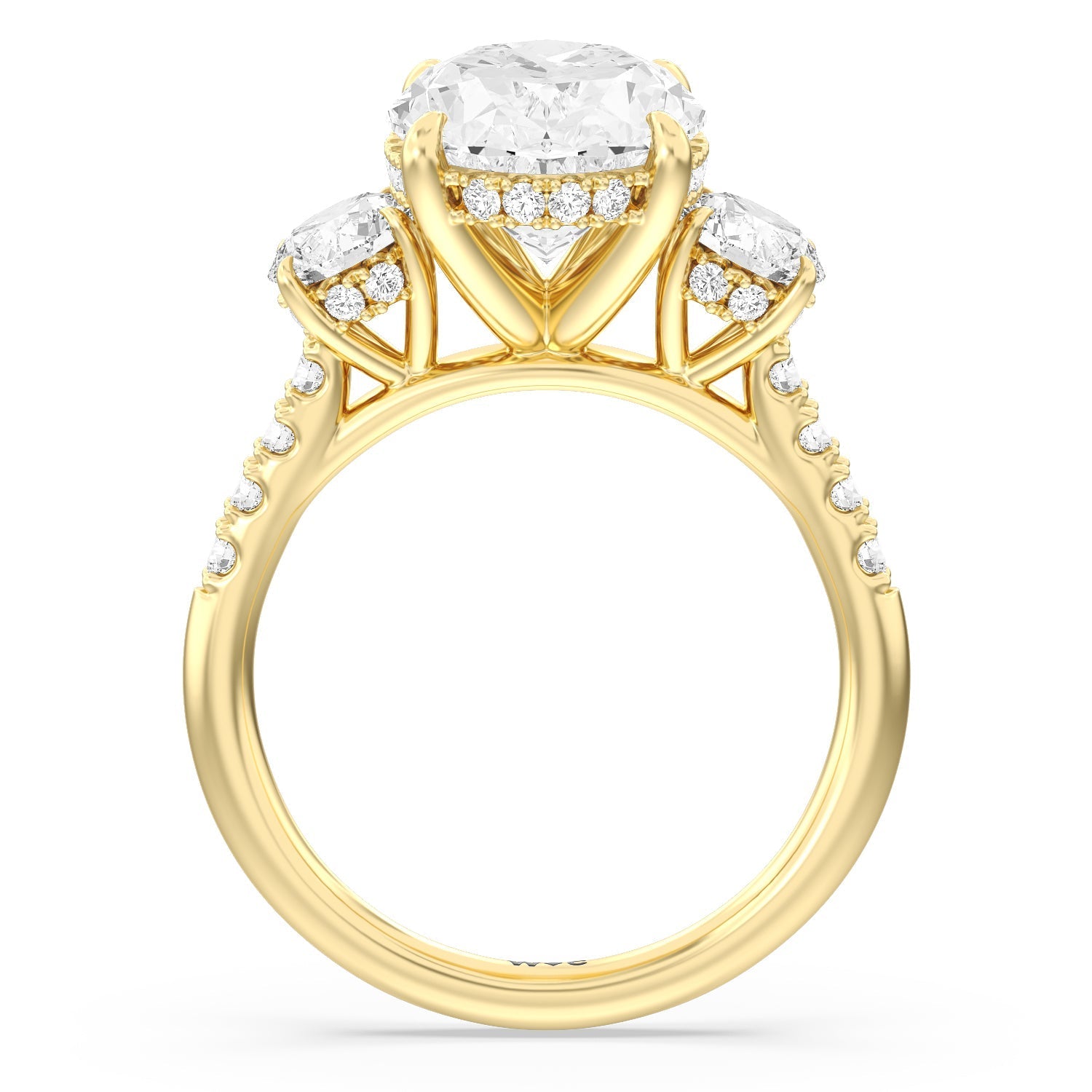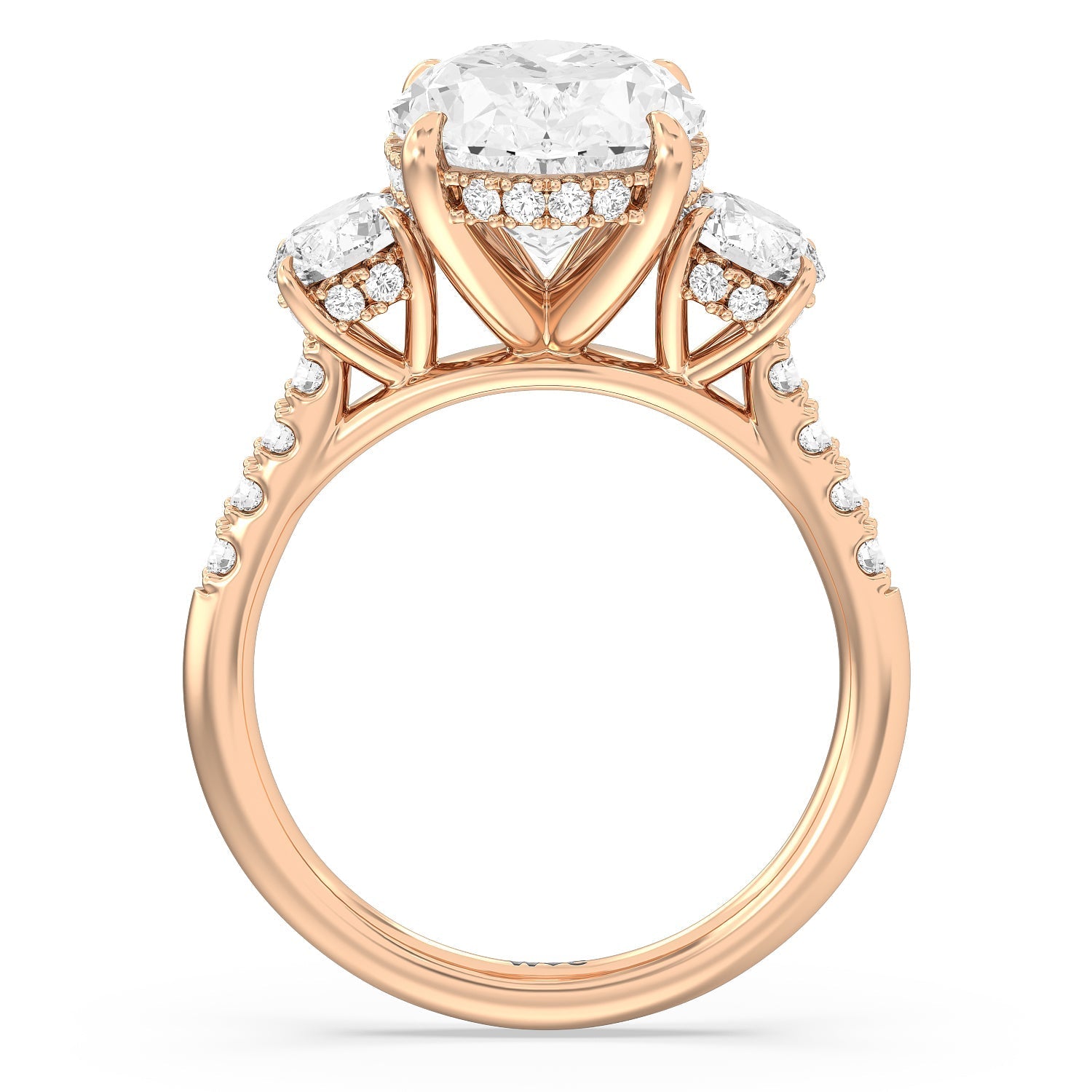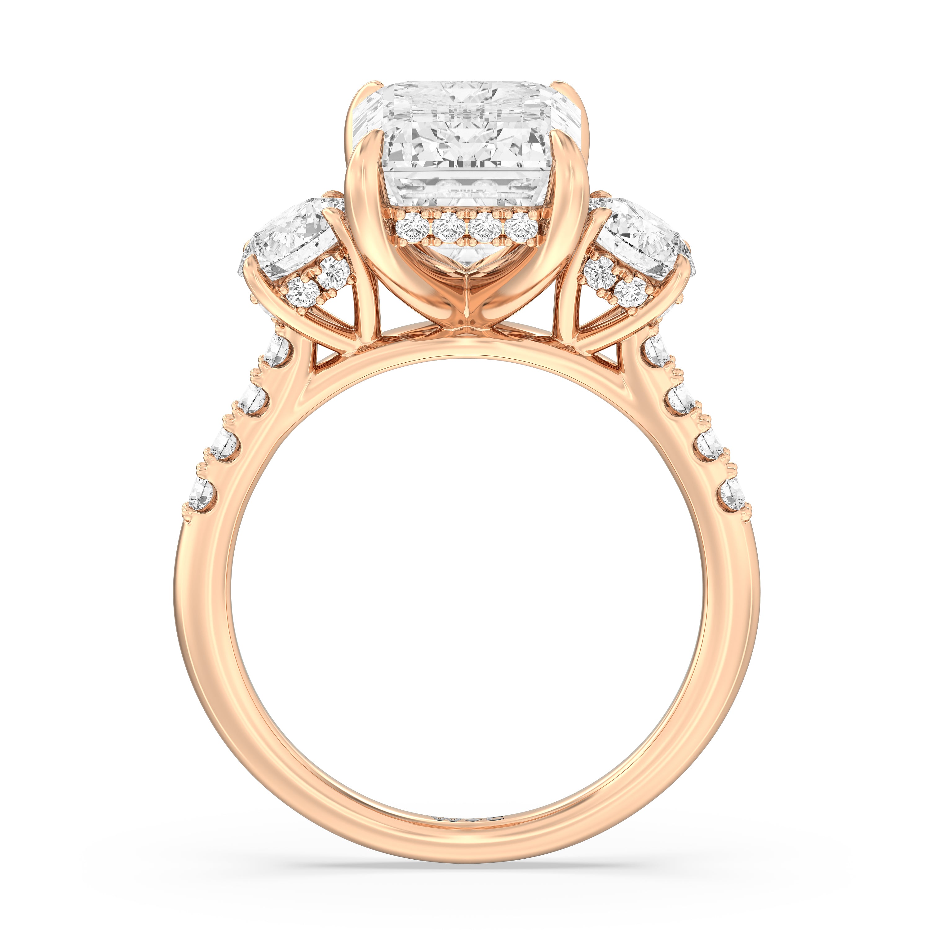 Beautiful, romantic, and meaningful. This three-stone engagement ring impresses with its spectacular 5-carat diamond center stone sitting in between diamond side stones, each weighing 0.5-carats. Each of the three stones features a hidden halo. The band's gracefully arching shoulders are also traced with diamonds. A symbol of your love story's past, present, and future, this tri-stone engagement ring truly is a visual treat.