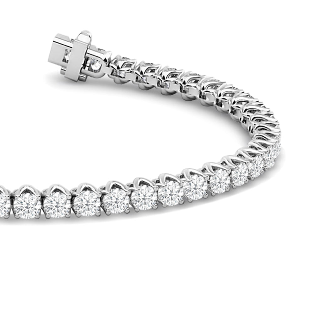 A tennis bracelet displaying a pared-back yet bold aesthetic. This piece features a continuous line of round diamonds set in a decorative tulip basket. This sparkly and elegant piece comes with that little bit of extra style to distinguish itself from the rest.