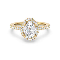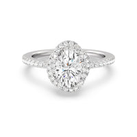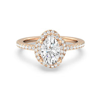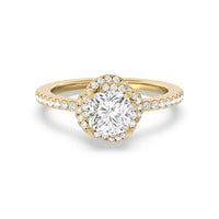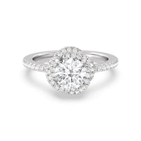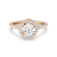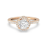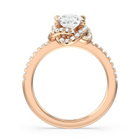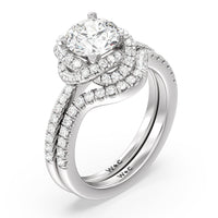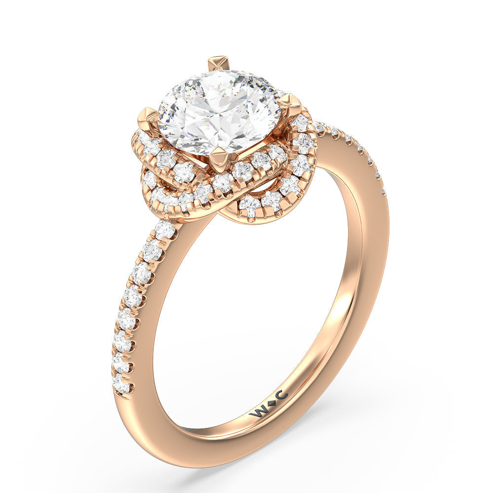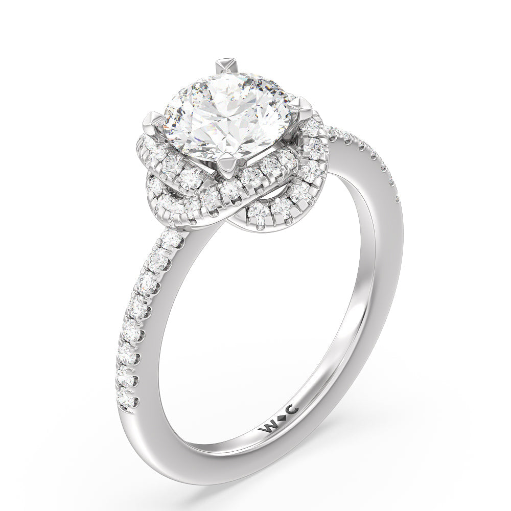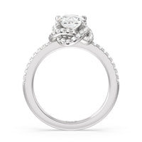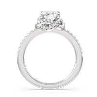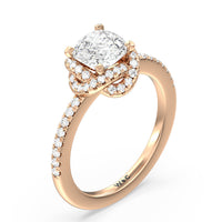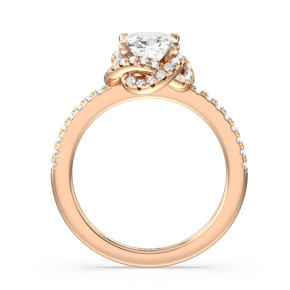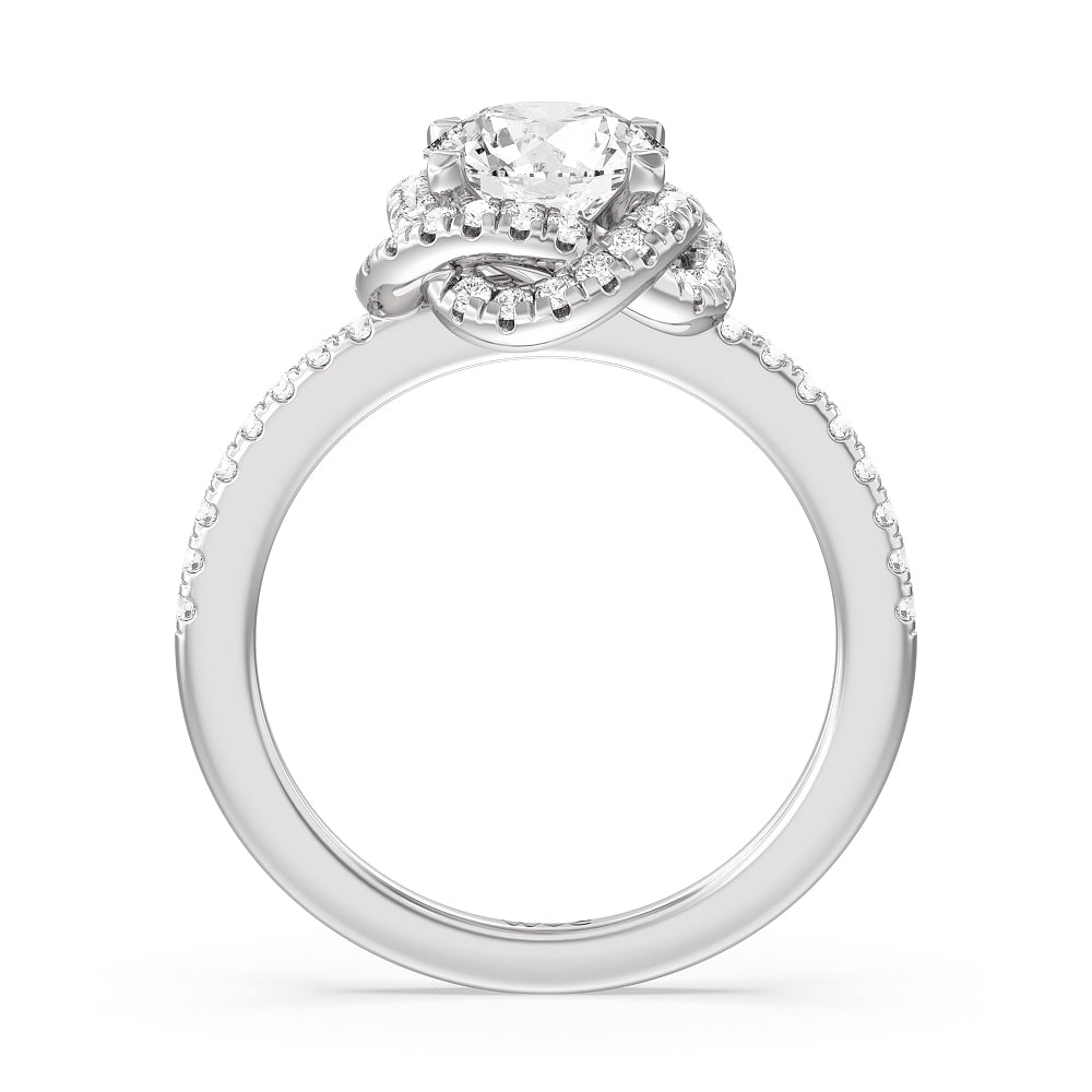 A twisted halo around the Solitaire gives it a beautiful giftwrapped floral look. The pave shank adds to its glistening ethereal beauty.