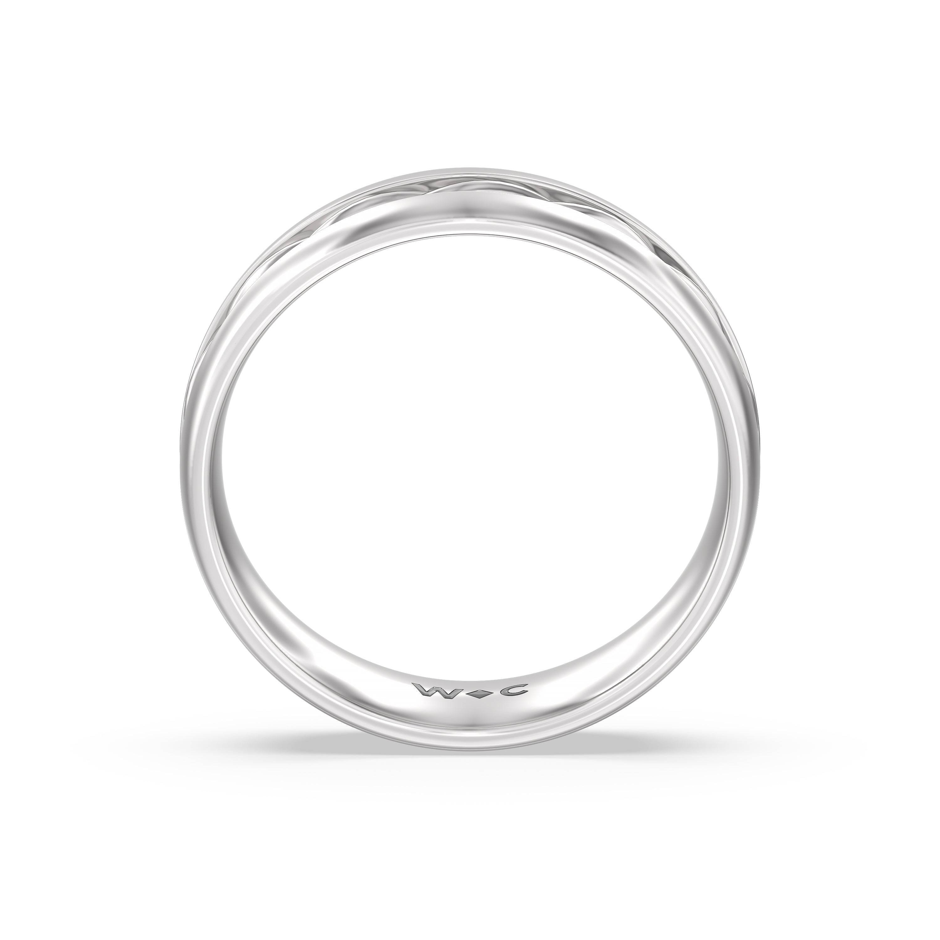 This satin-finished ring features a classic profile and a textured shine. The beveled edges and grooved center add interest to this men's band. The ring's inner wall is curved for a comfortable fit.