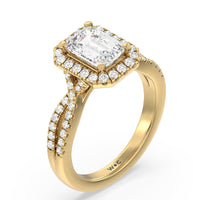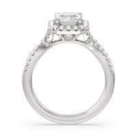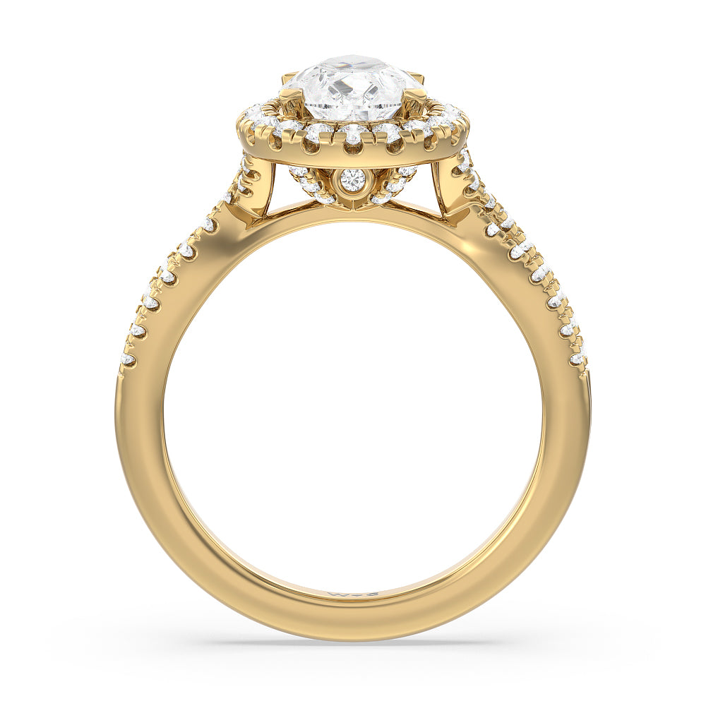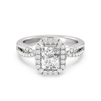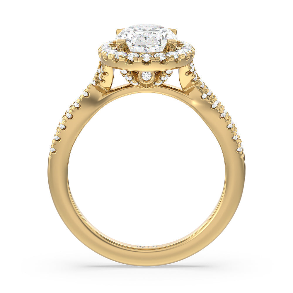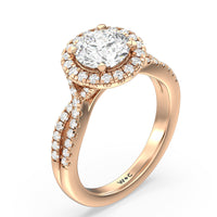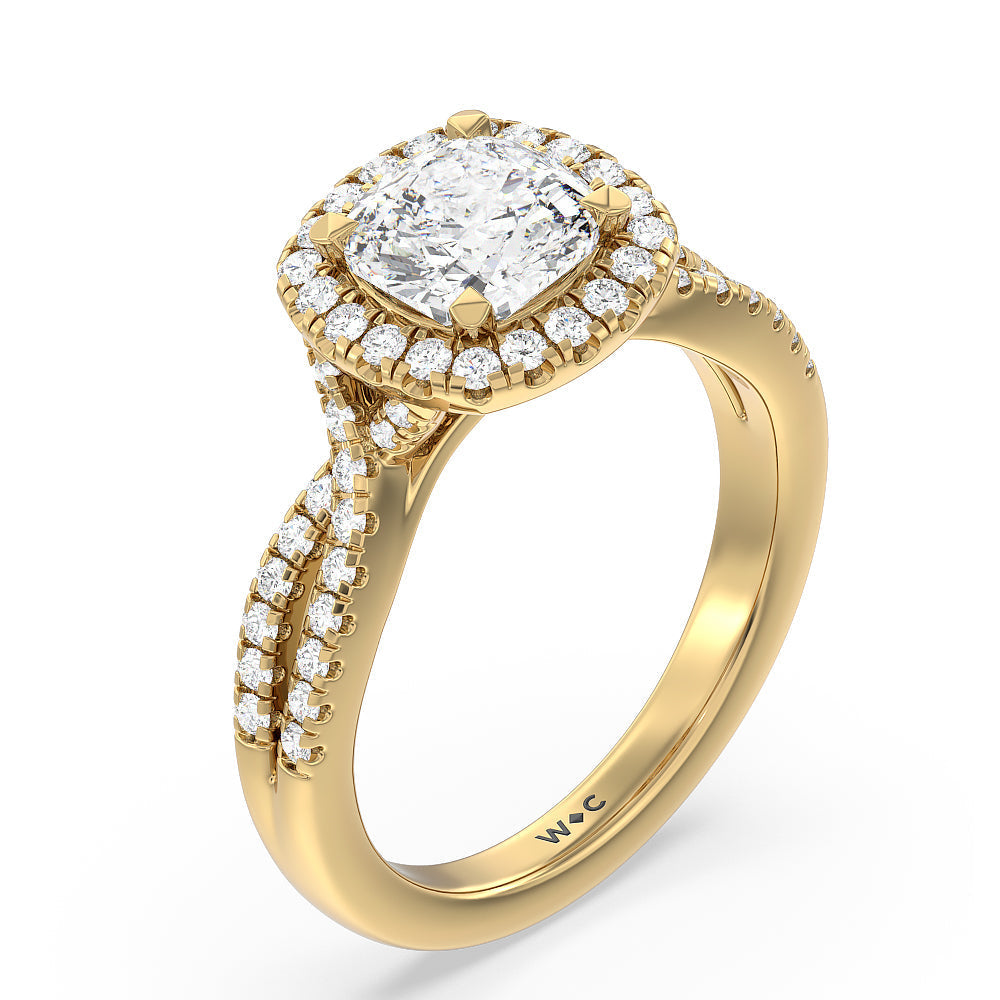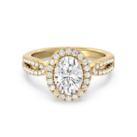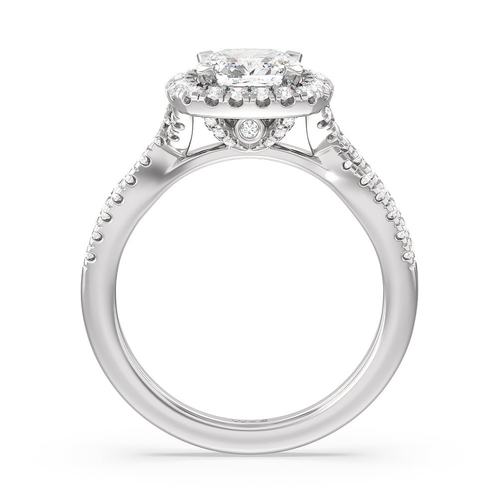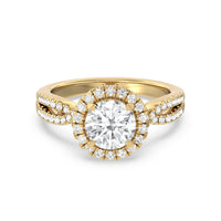 A classic cathedral halo engagement ring with a modern twist. This glittering piece features a diamond center stone surrounded by a delicate halo of diamonds that travel down the twisted shank. This is a ring that will draw attention with its dainty yet glamorous style.