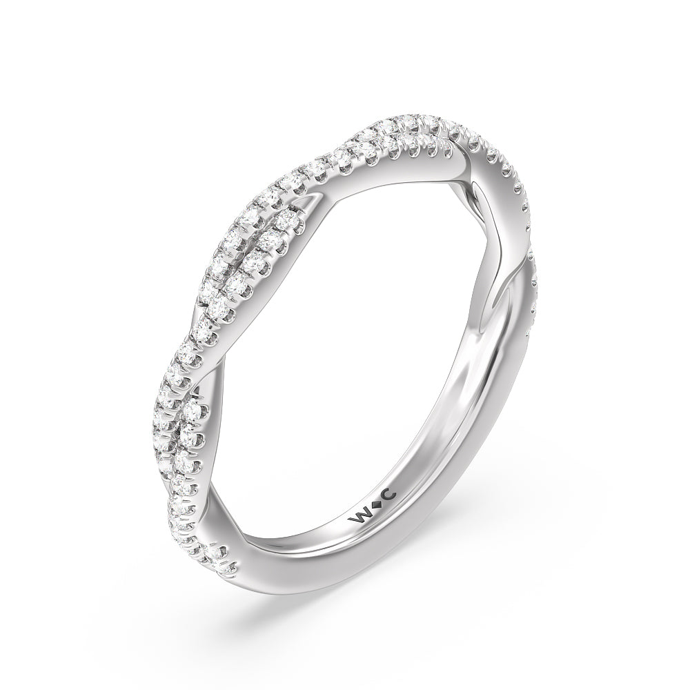 Shimmering pave diamonds cascade down this band to create a timeless beauty that will never go out of style. Designed to be paired with our twisted shank hidden halo solitaire engagement ring for a simple and sophisticated look.