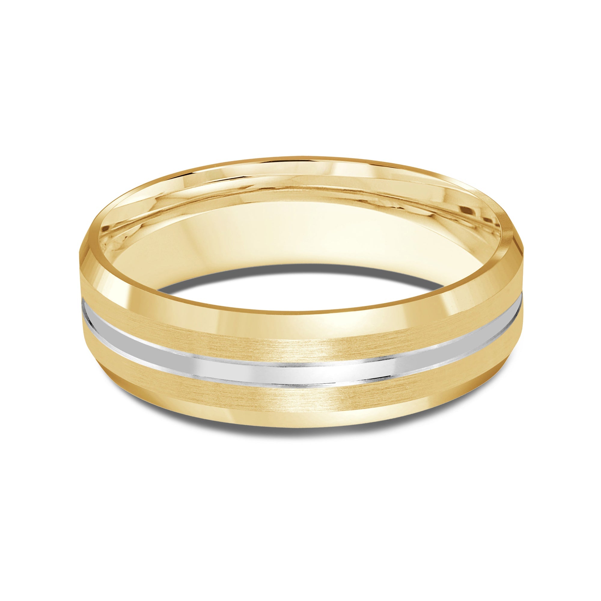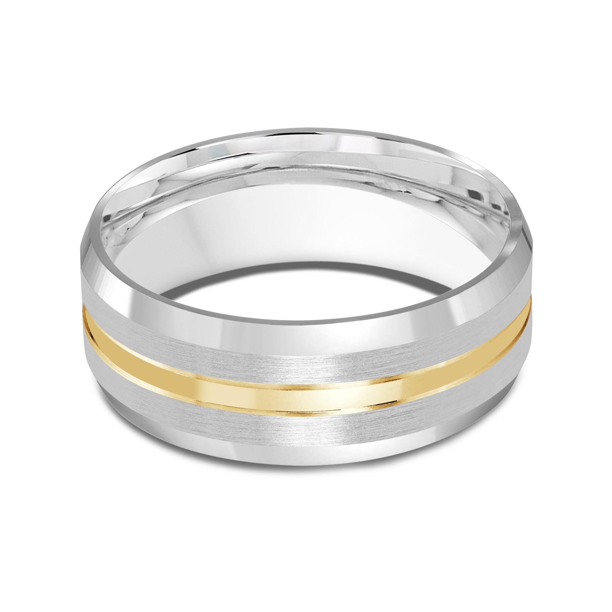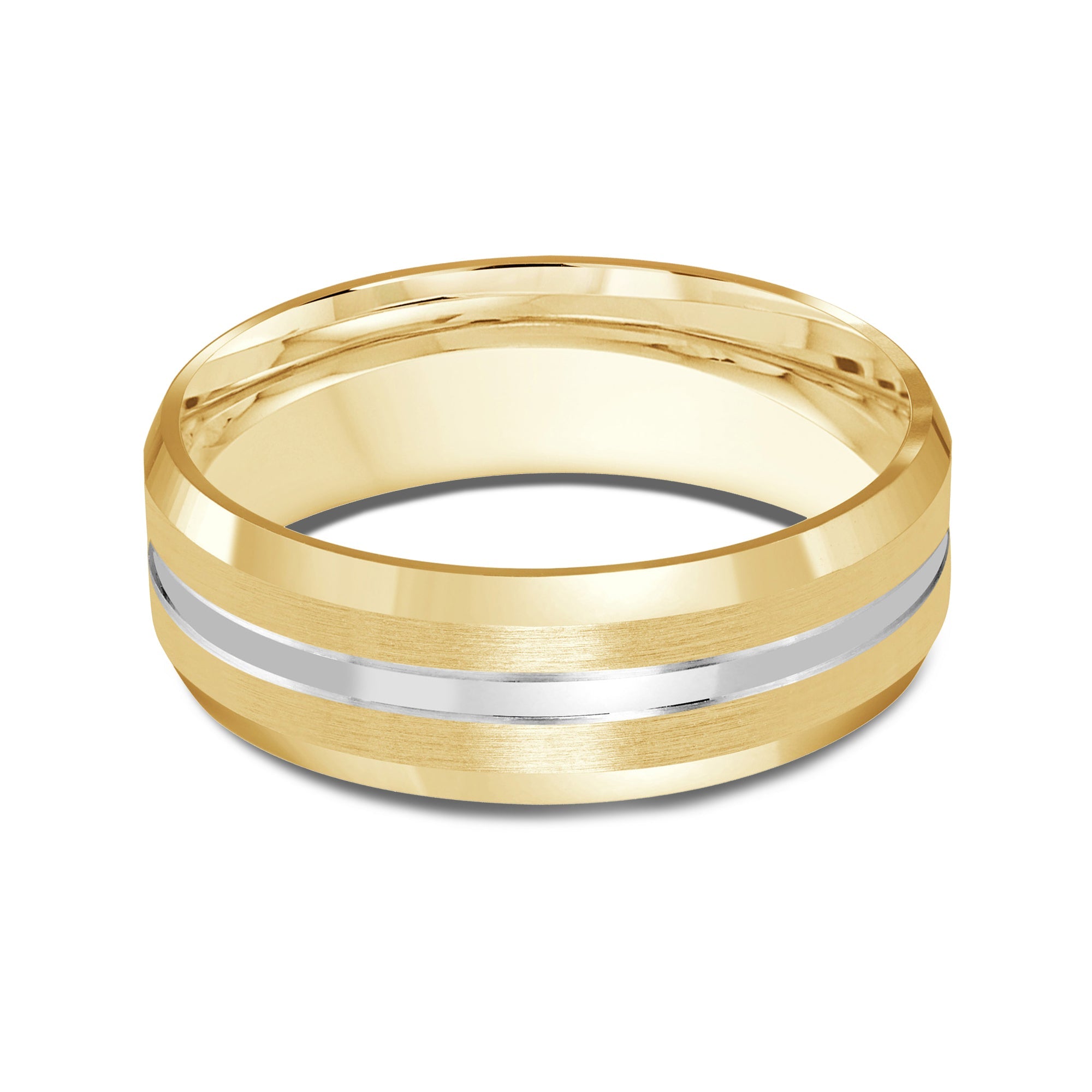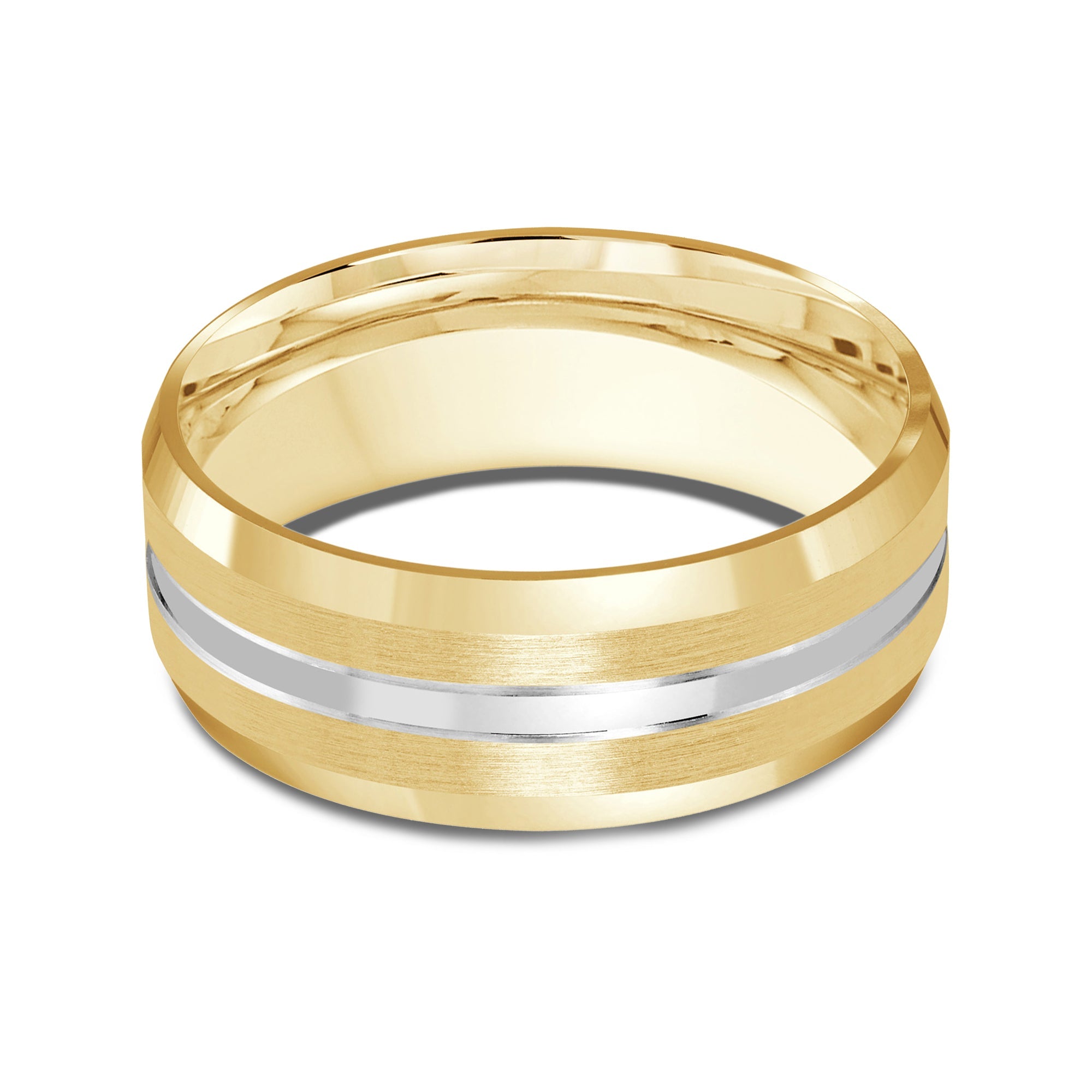 This satin-finished ring features a classic profile and a textured shine. The beveled edges and grooved center add interest to this men's band. The ring's inner wall is curved for a comfortable fit.