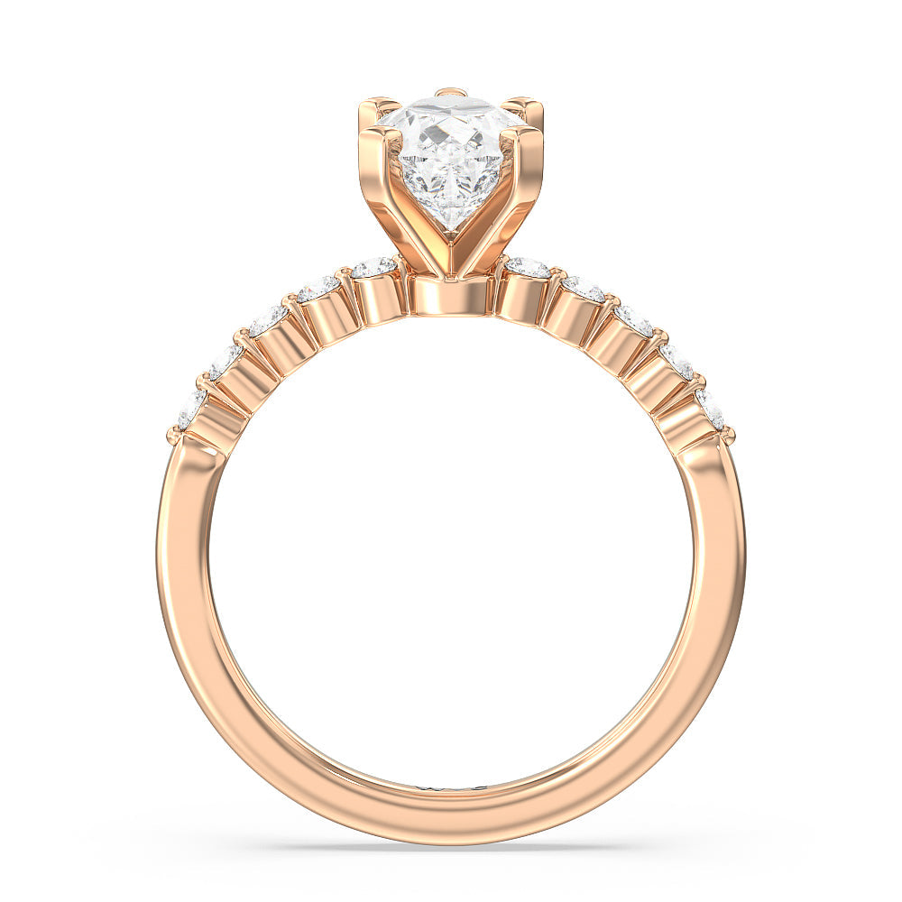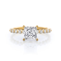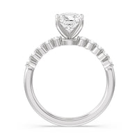 Under bezel shared prong accent diamonds float on the side of your center stone
