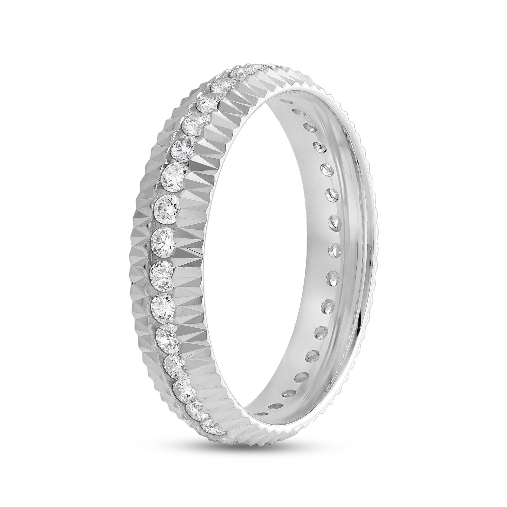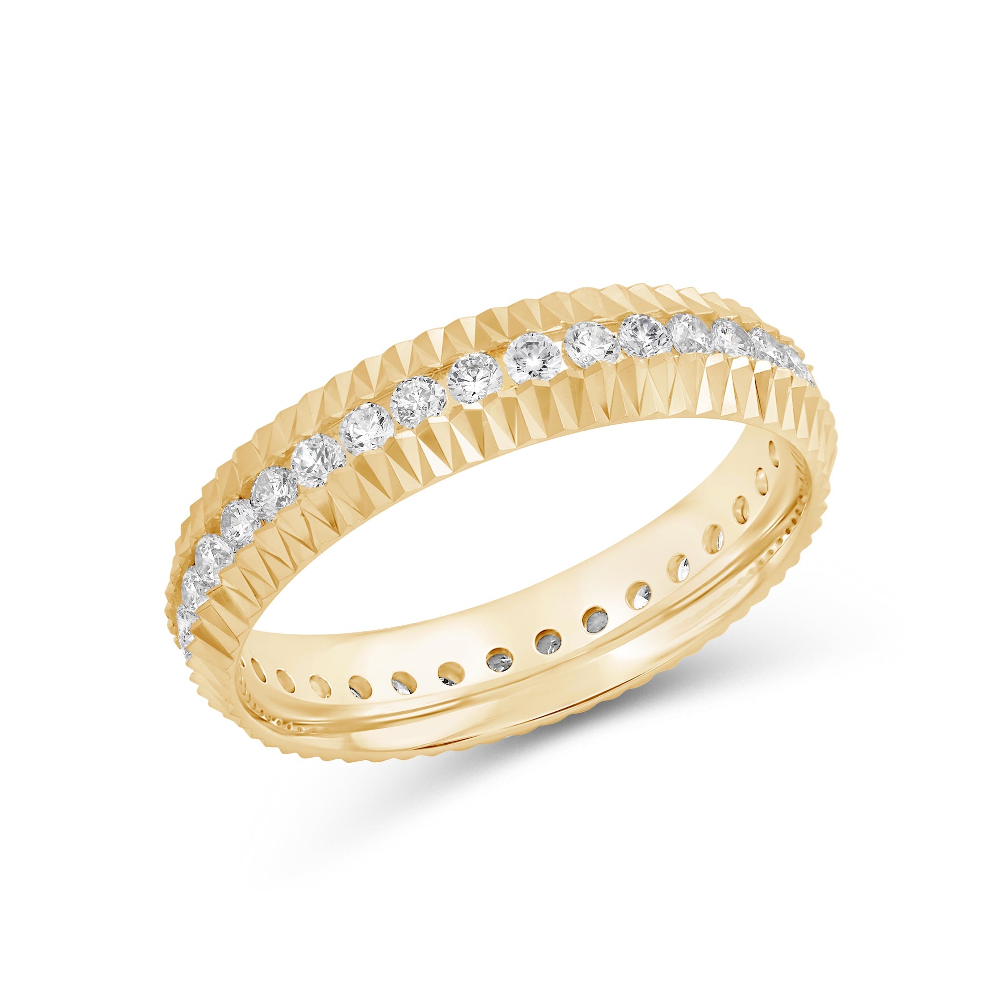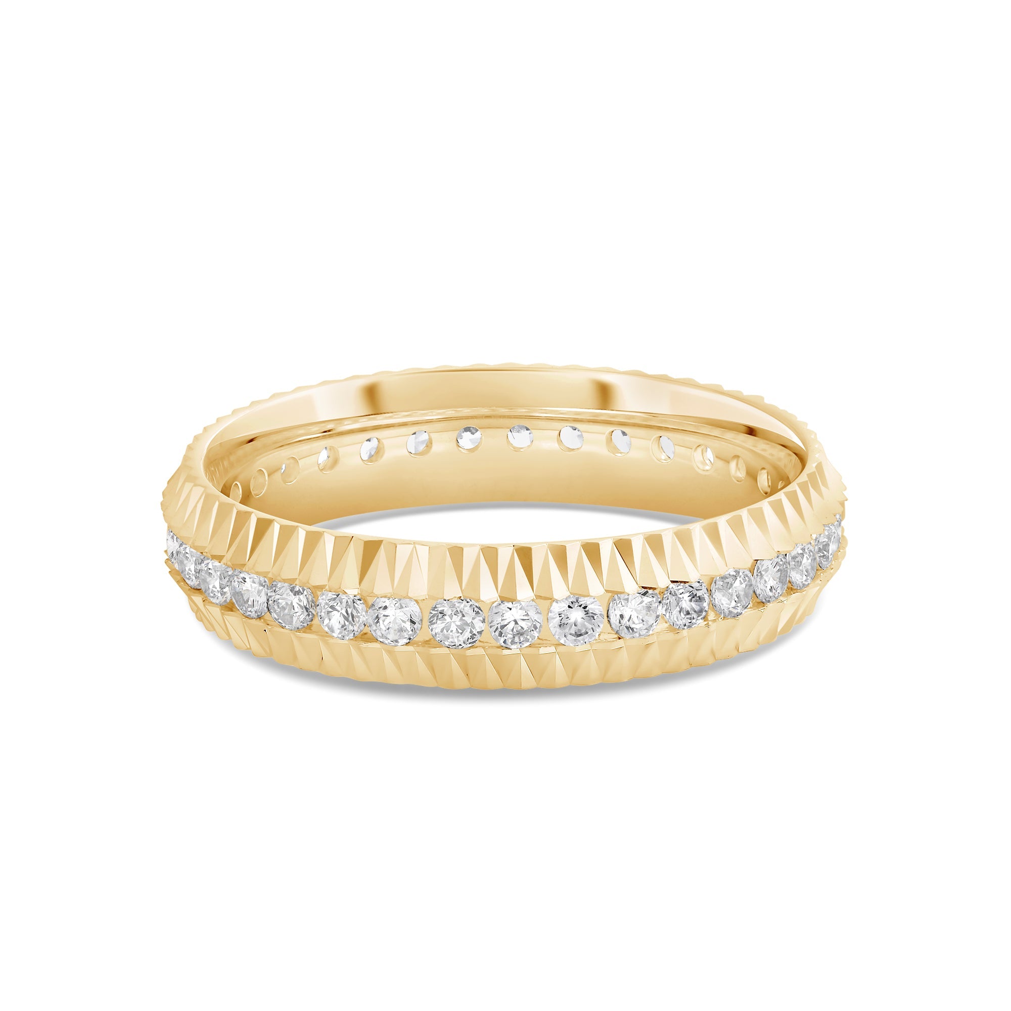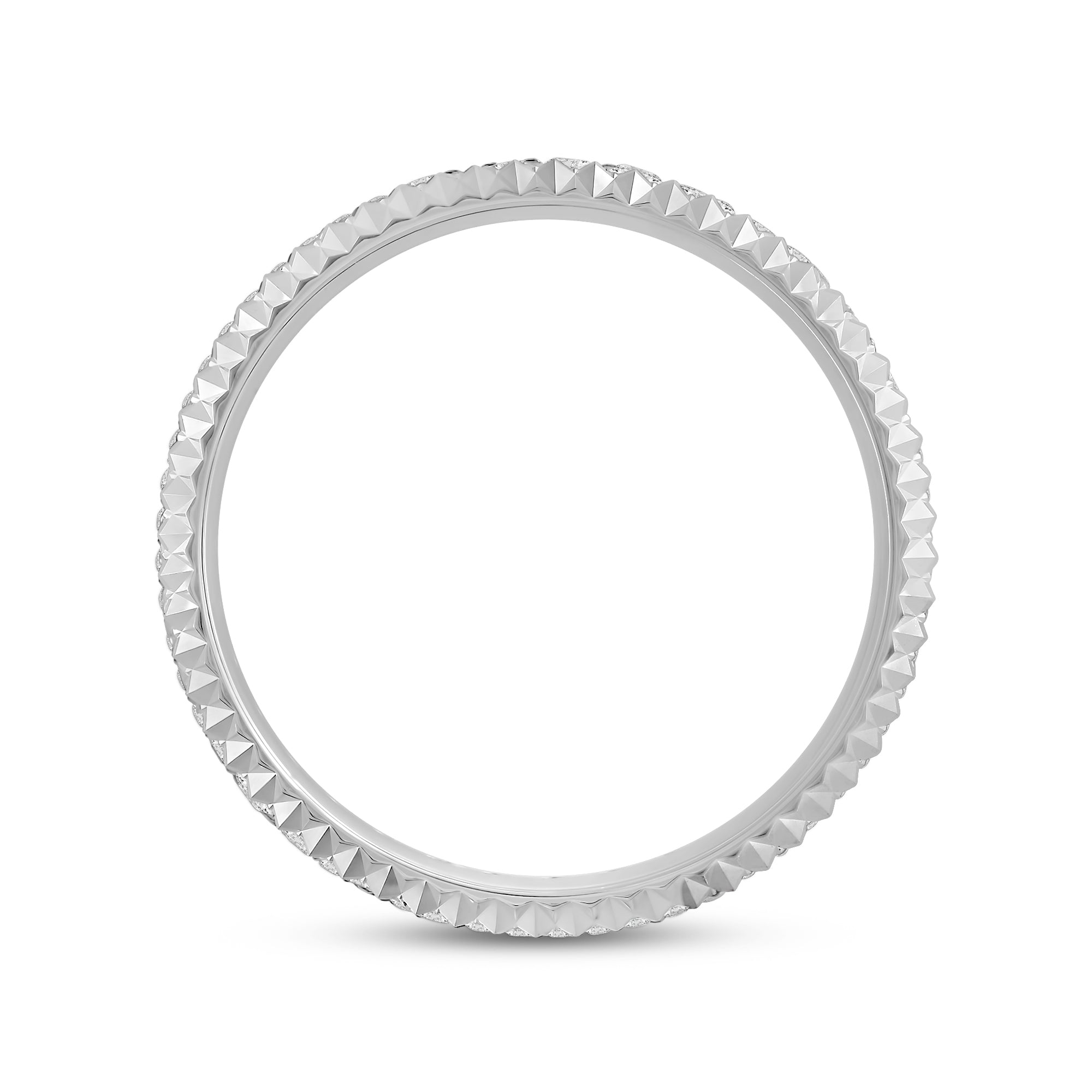 For lovers of the irregular and unconventional. V-shaped ridges run throughout the ring's edges, enclosing a ring of diamonds. Designed to be out of the ordinary, this band makes a powerful statement in its distinctive simplicity.