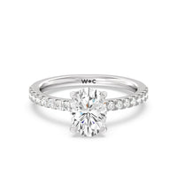 This sophisticated engagement ring features our signature arc hidden halo design along with a diamond pave band to highlight the centre stone perfectly! A modern take on a classic style.