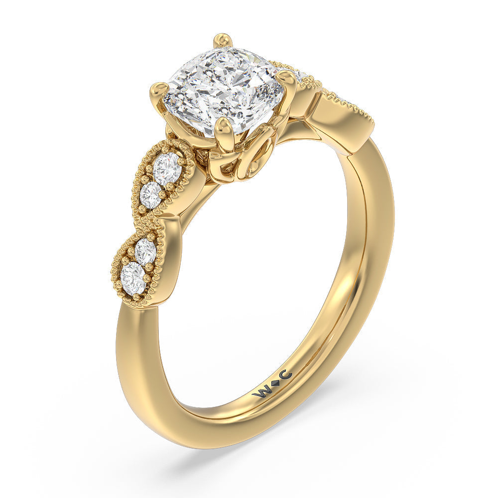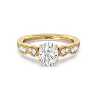Vintage floral motifs highlight the stunning center stone of this elegant engagement ring. The Art Deco design combines diamond pave and bezel settings along the shank, with milgrain embellishment to maximize the sparkle.